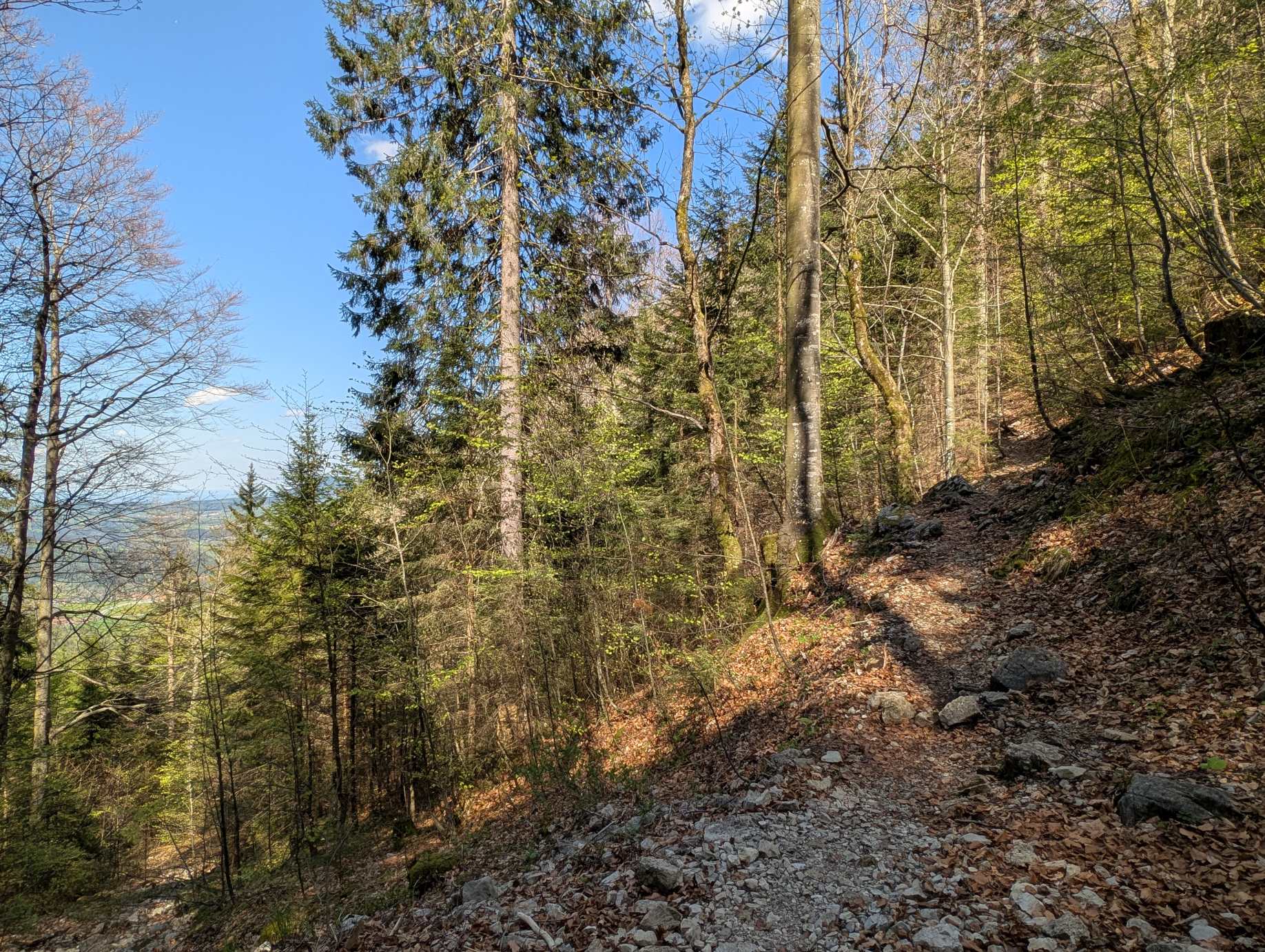 Um zum Punkt zu gelangen, an dem die Rundtour startet und endet, folgt ein serpentinenreicher Aufstieg durch den Wald. In vielen langgezogenen Kehren gewinnt man auf dem schönen Steig einige Höhenmeter.