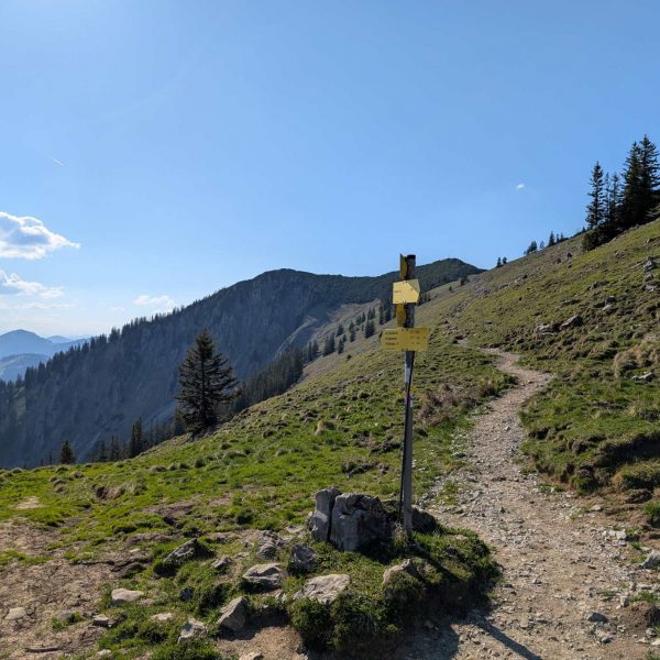 Schließlich ist nach schweißtreibendem Aufstieg die Beschilderung am Beginn des Nordgrats erreicht. Man blickt nun auch in den östlich gelegenen Kessel bei der Geitauer Alm, über den ebenfalls ein Steig und eine mögliche Bike & Hike Route heraufkommt.