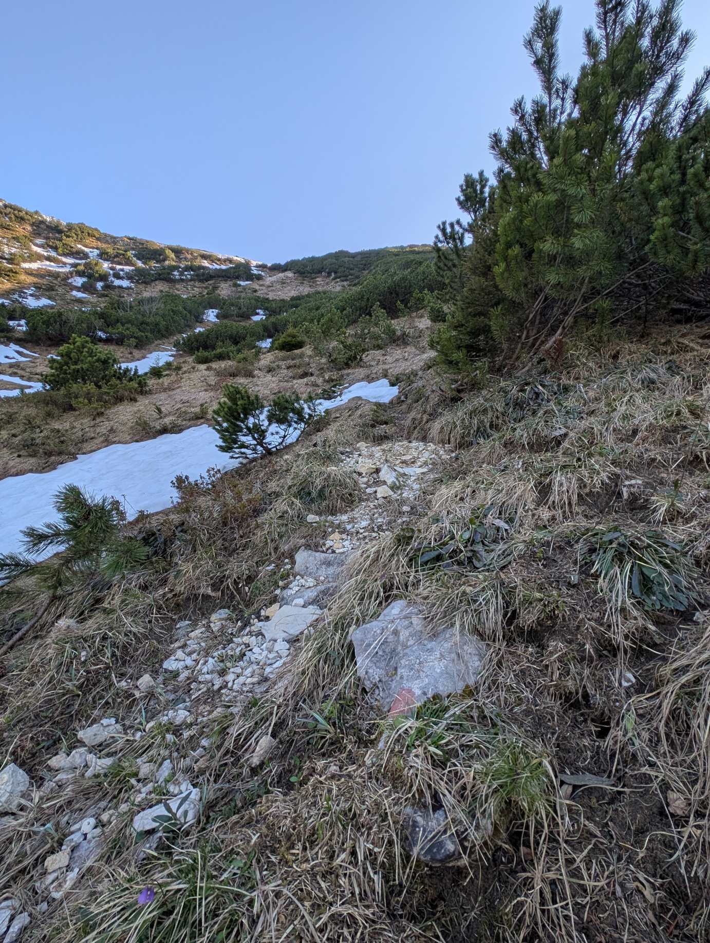 Der Steig zieht nun im Zickzack den steilen Kessel hinab. Zum Zeitpunkt der Tour erschweren Altschneefelder die Orientierung. Doch auch generelle sollte man aufmerksam bleiben, da der Steig nicht immer gut ausgetreten ist und die eine oder andere Kurve leicht übersehen werden kann. Wer keinen Spaß an ein bisschen Wegfindung hat, sollte lieber den oberhalb verlaufenden Normalabstieg wählen.