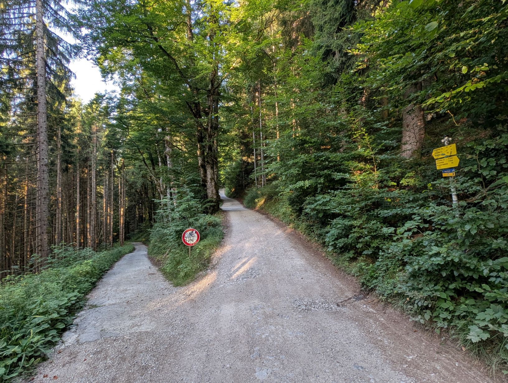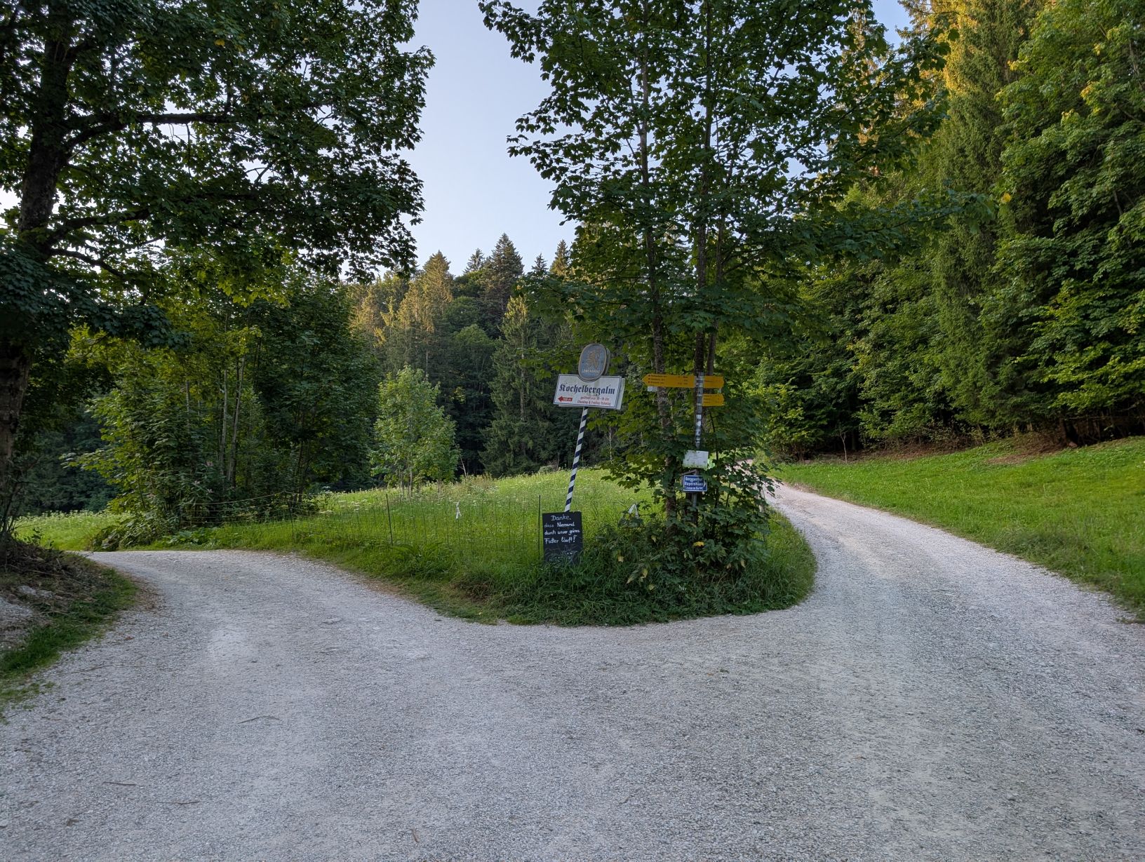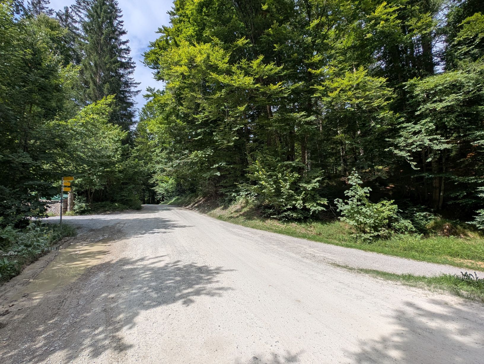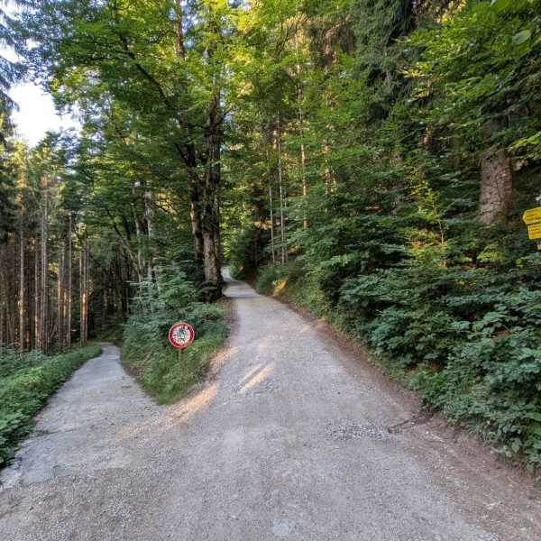 Zu Fuß geht es nun weiter auf der sehr steilen und schottrigen Straße, der man mit dem Bike theoretisch bis zum Osterfelderkopf weiter folgen könnte. Nach ca. 150 Hm zweigt in einer Rechtskurve nach links die Beschilderung zum Mauerläufer-Klettersteig und den Schöngängen ab.