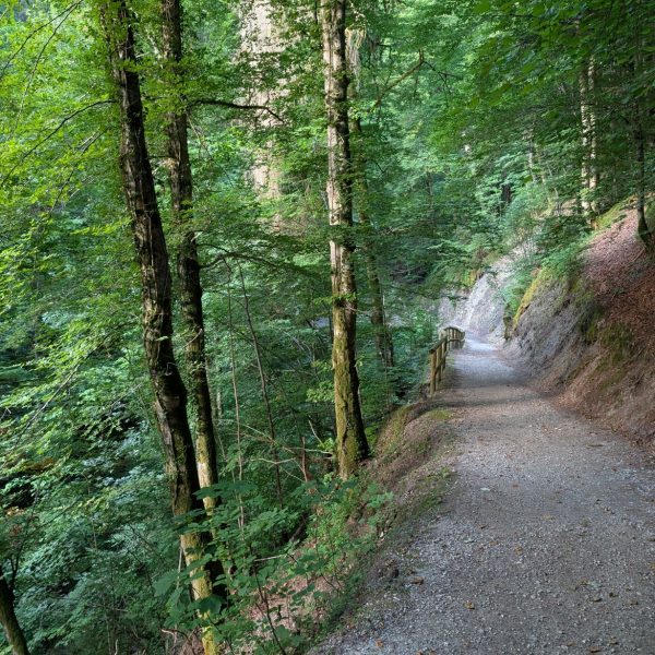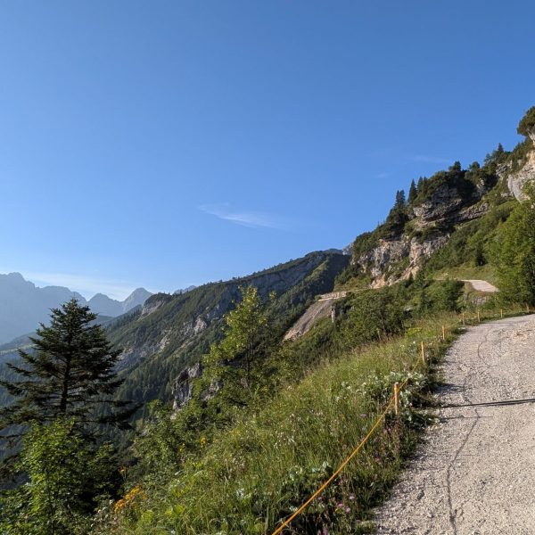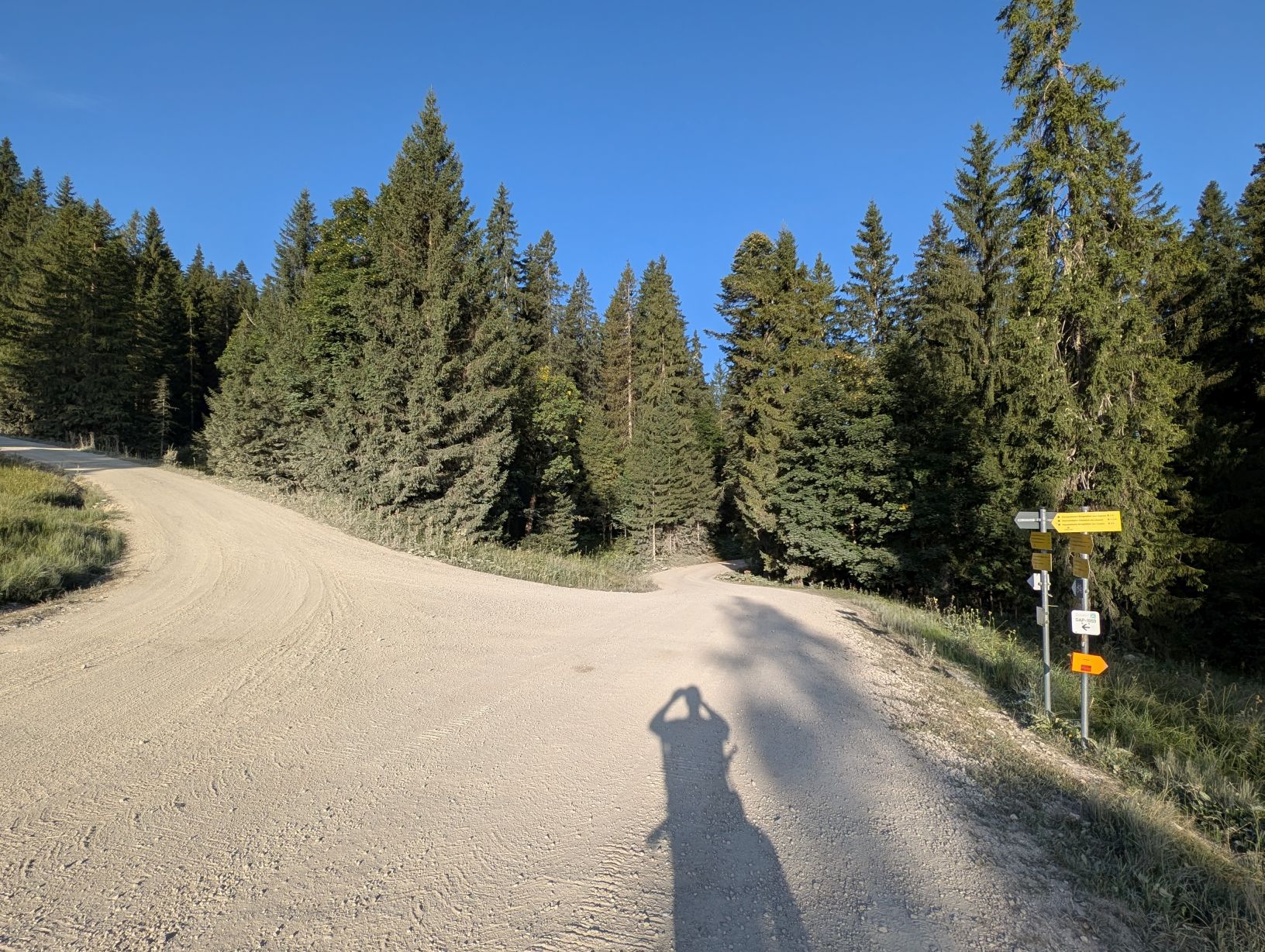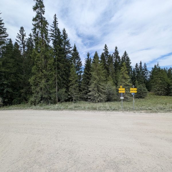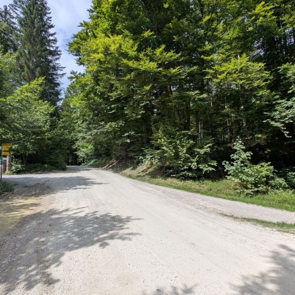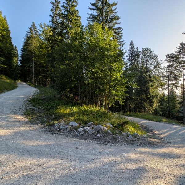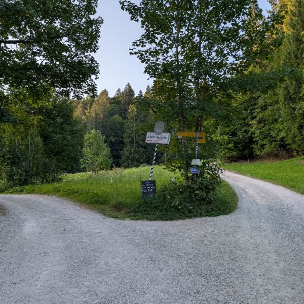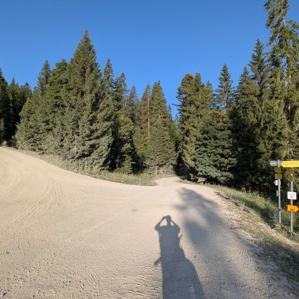 Zu Fuß geht es nun weiter auf der sehr steilen und schottrigen Straße, der man mit dem Bike theoretisch bis zum Osterfelderkopf weiter folgen könnte. Nach ca. 150 Hm zweigt in einer Rechtskurve nach links die Beschilderung zum Mauerläufer-Klettersteig und den Schöngängen ab.