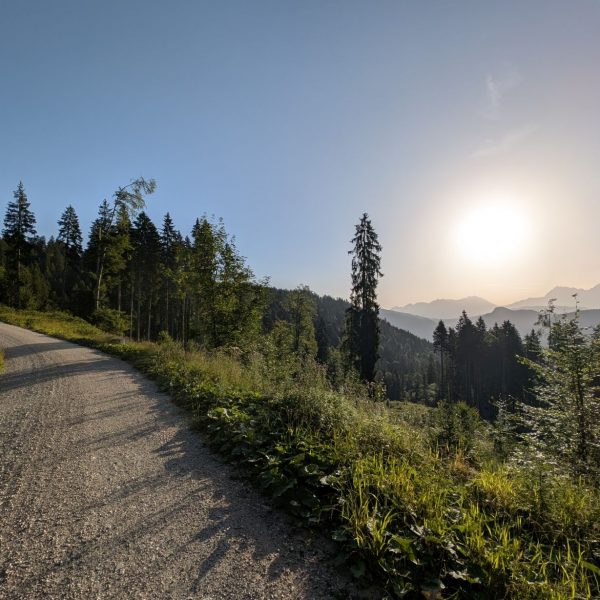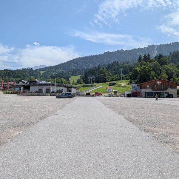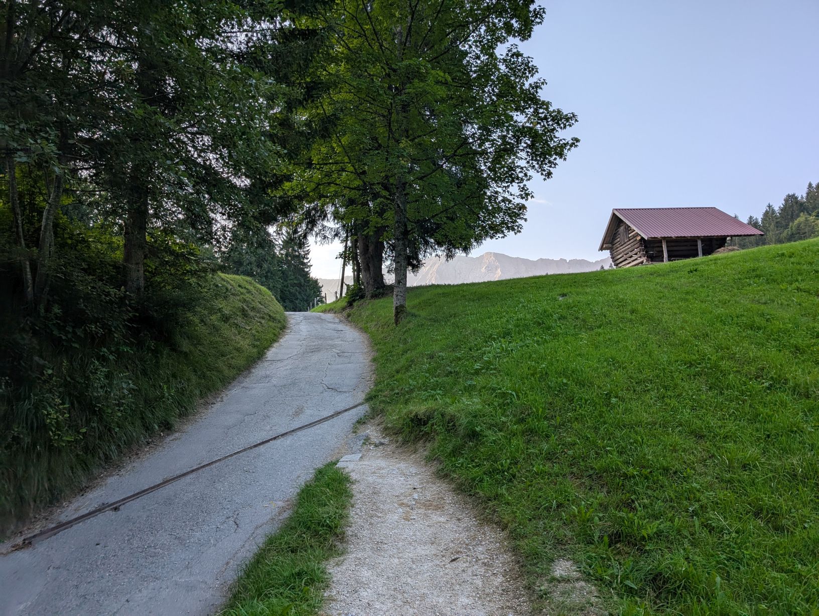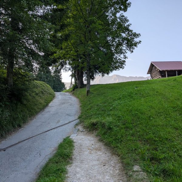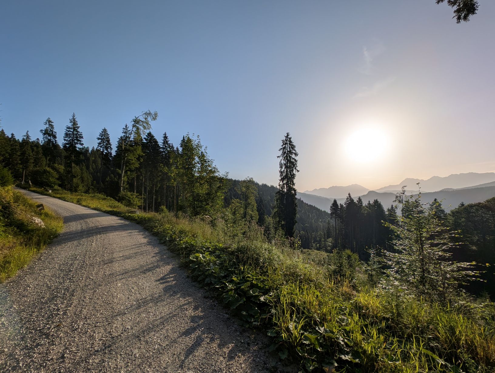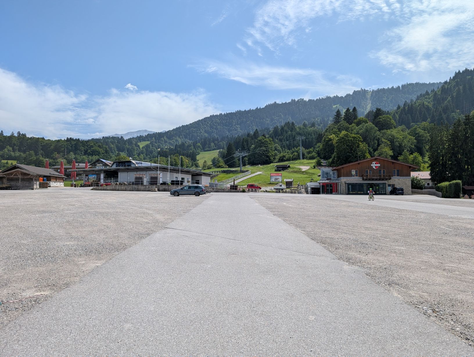 Startpunkt für diese ausladende Runde ist idealerweise der – im Sommer kostenlose – Parkplatz bei der Hausbergbahn. Ein Stück fährt man den Hang direkt bergauf und quert nach links zum geteerten Kochelbergweg. Auf diesem geht es von nun an immer der Beschilderung nach Richtung Kochelbergalm und Partnachalm.