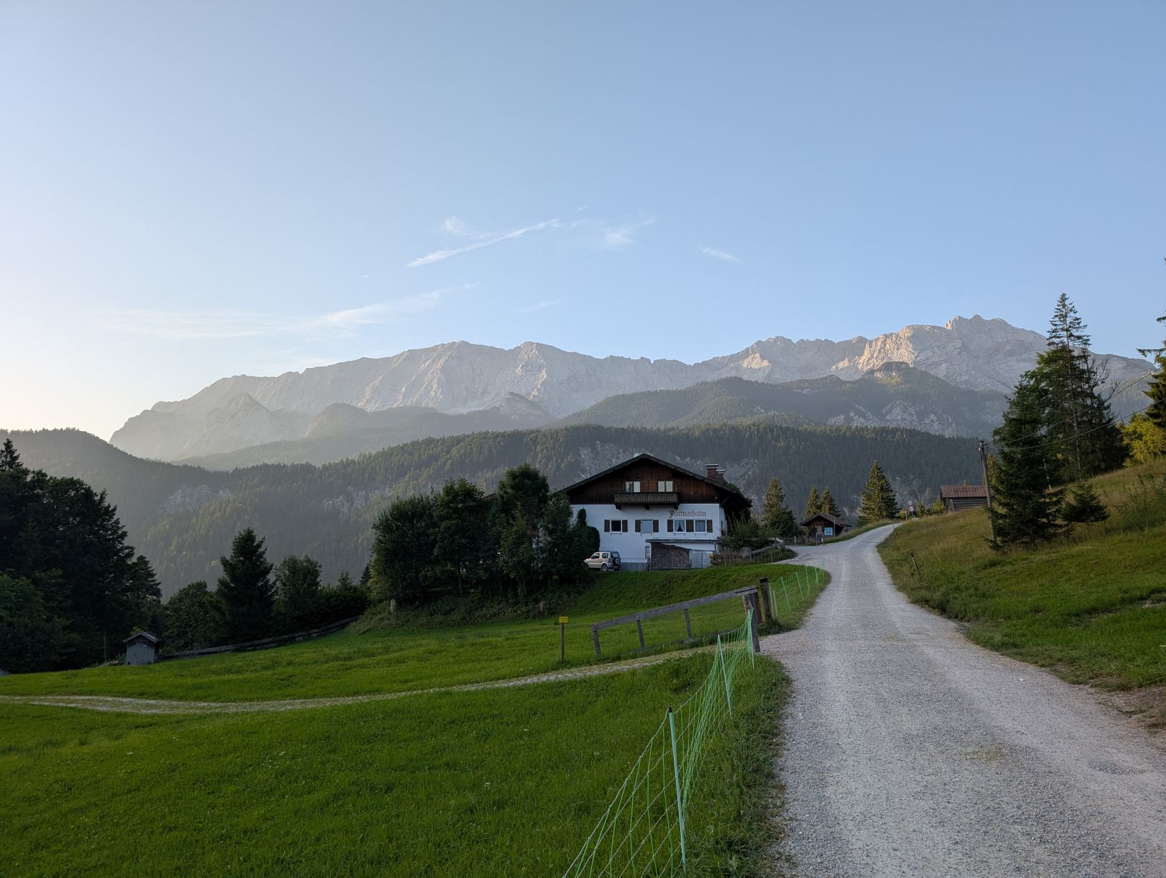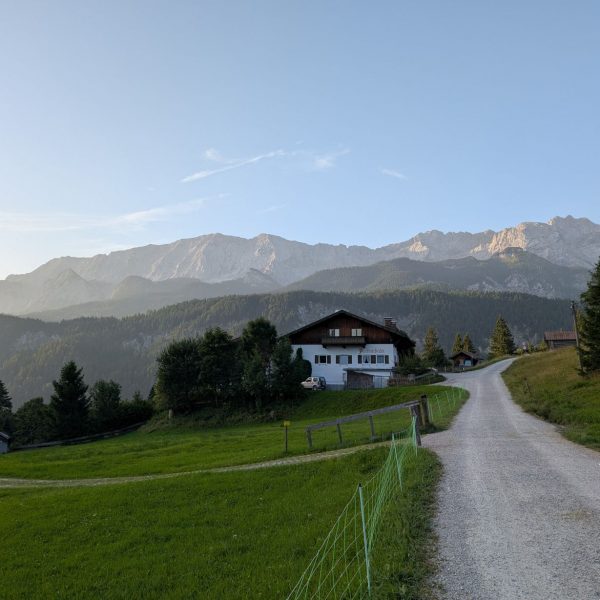 Die Strecke verläuft sehr schön durch den Wald und quert einen Bachlauf über eine Holzbrücke. Hier heißt es das Bike über ein paar Holzstufen bergauf zu schieben, bis es wieder bergab geht und man auf den Weg zur Partnachalm (983 m) einfädelt. Diese ist kurze Zeit später erreicht und bietet einen traumhaften Blick Richtung Wetterstein.