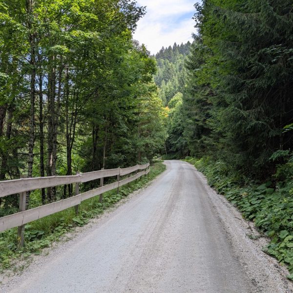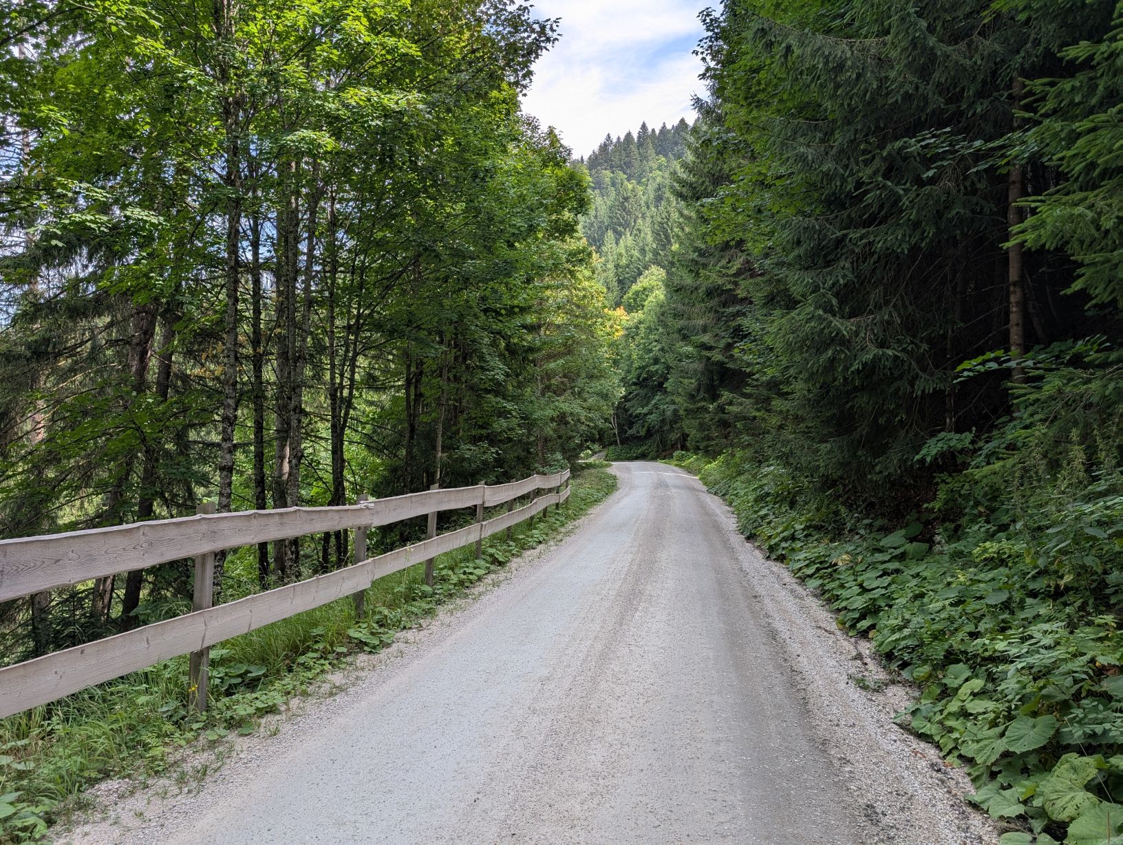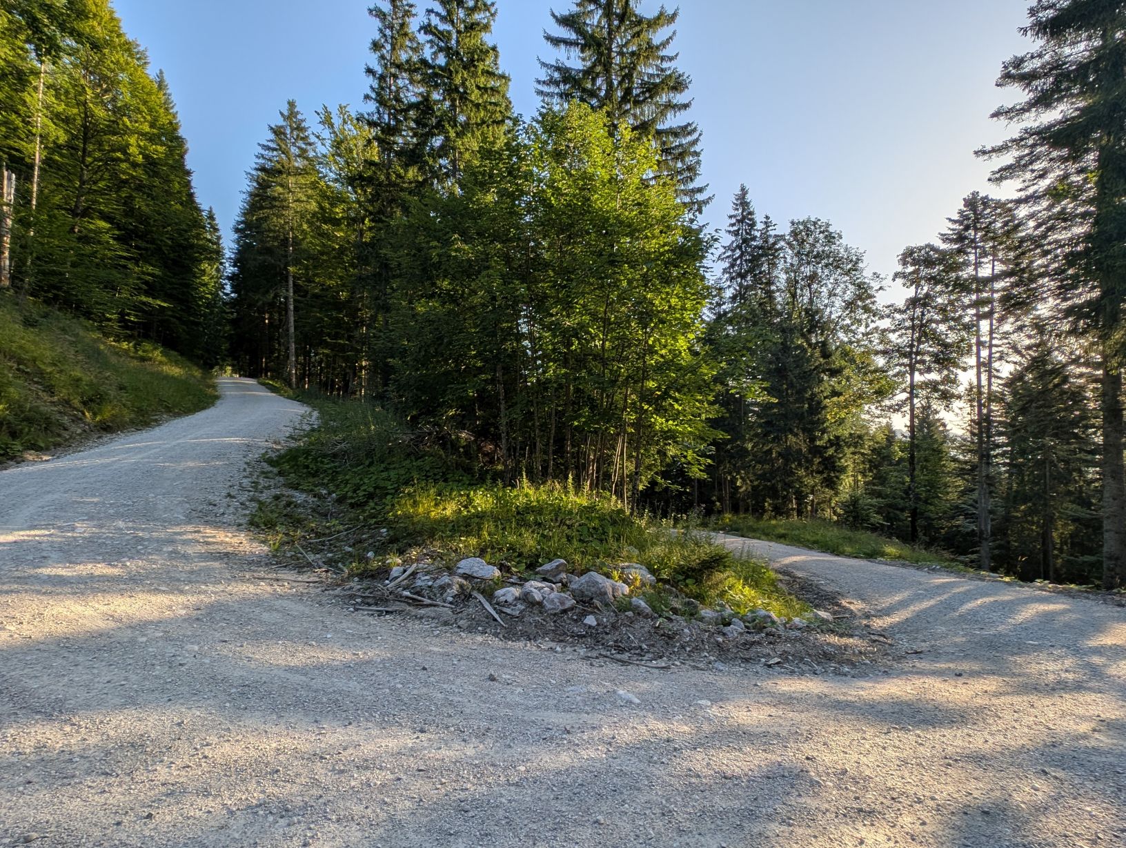 Auf deutlich besserer Straße folgt man nun rasant in vielen langen Kehren durch den Wald. Mehrfach kreuzt man die Skipiste und kommt an der Tonihütte vorbei. Schon fast im Tal, zweigt nach rechts das Schild zum Rießersee ab. Ein schöner kleiner See, der sich sogar als Bademöglichkeit zum Schluss anbieten würde.