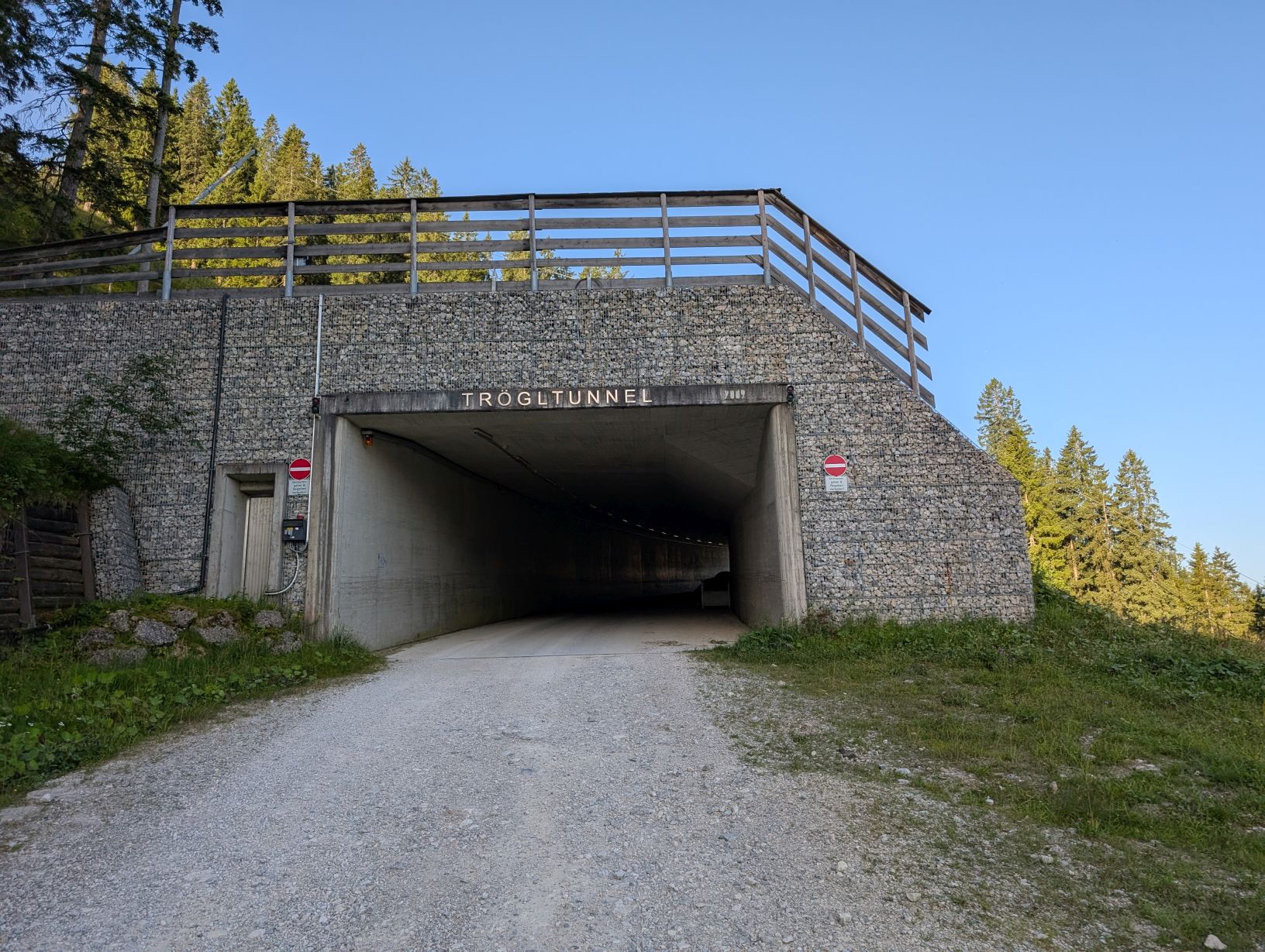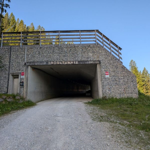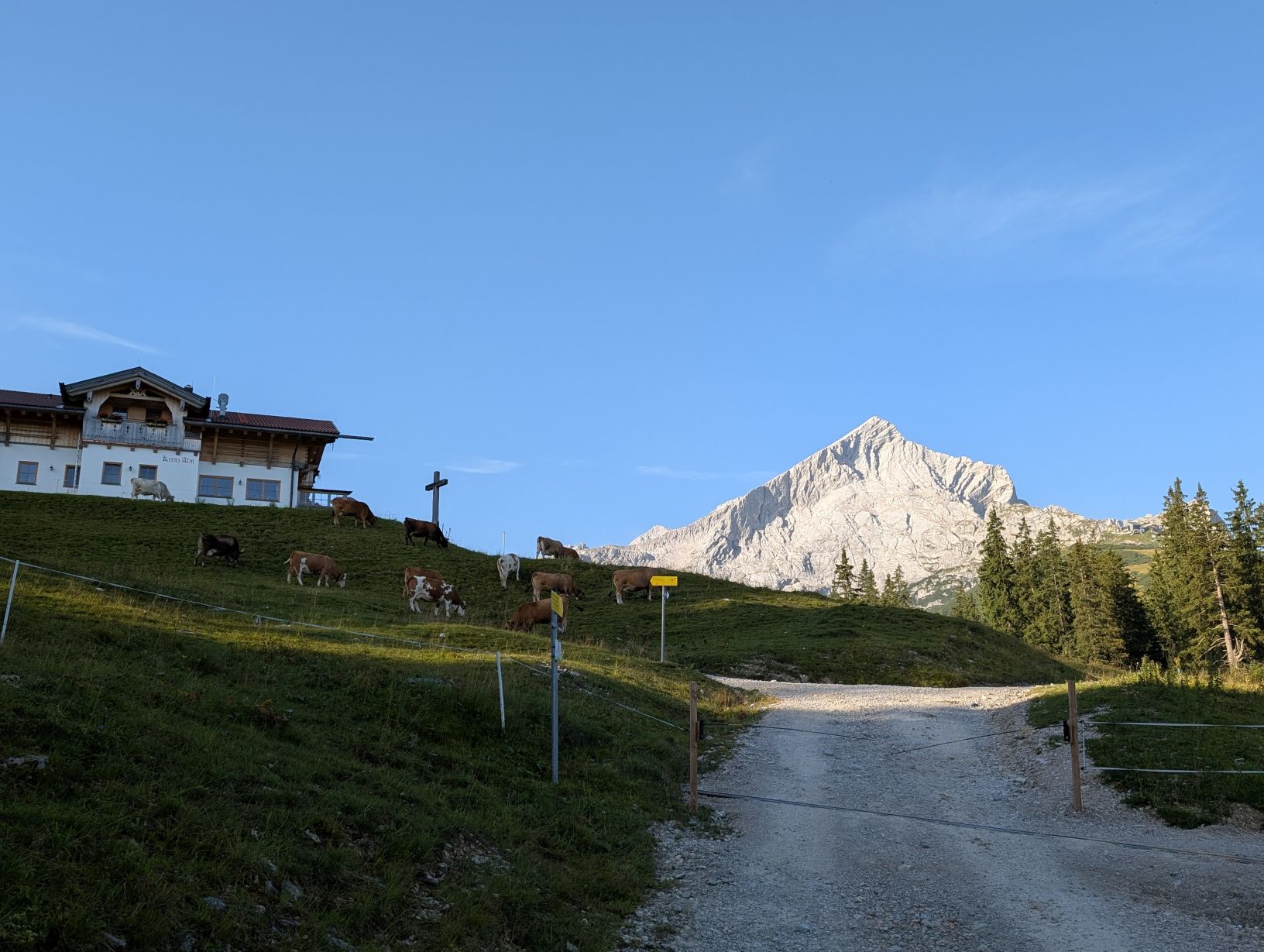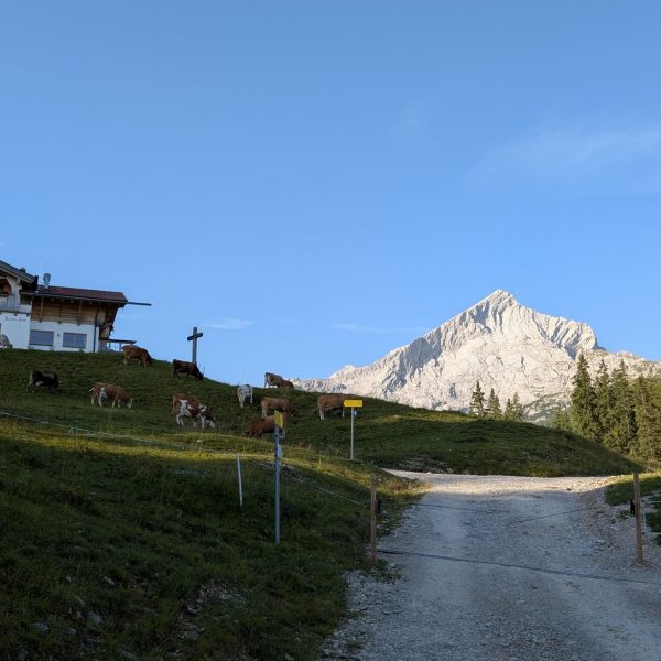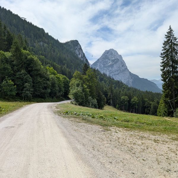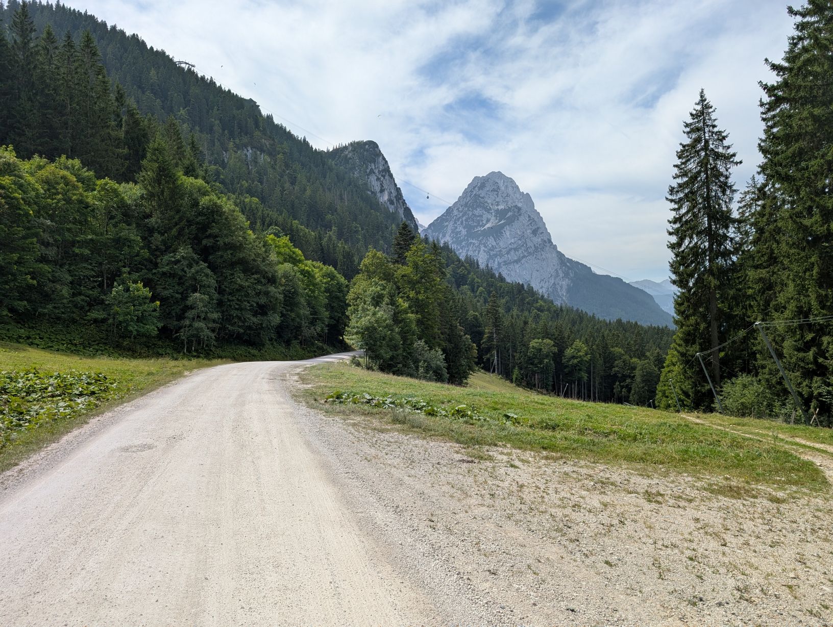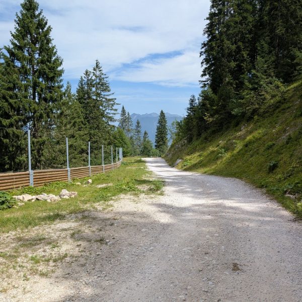 Ab hier taucht man nun – immer Richtung Kreuzeck – ein ins Garmisch Classic Skigebiet. Landschaftlich verliert die Strecke nun ein bisschen an Reiz und sie ist auch deutlich schottriger und teils unangenehm zu fahren. Auf der Skipiste durchquert man den Trögltunnel und kommt schließlich nach steiler Auffahrt an der Kreuzalm (1.600 m) kurz vor dem Kreuzeck an. Ein erster fantastischer Blick zur Alpspitze eröffnet sich.