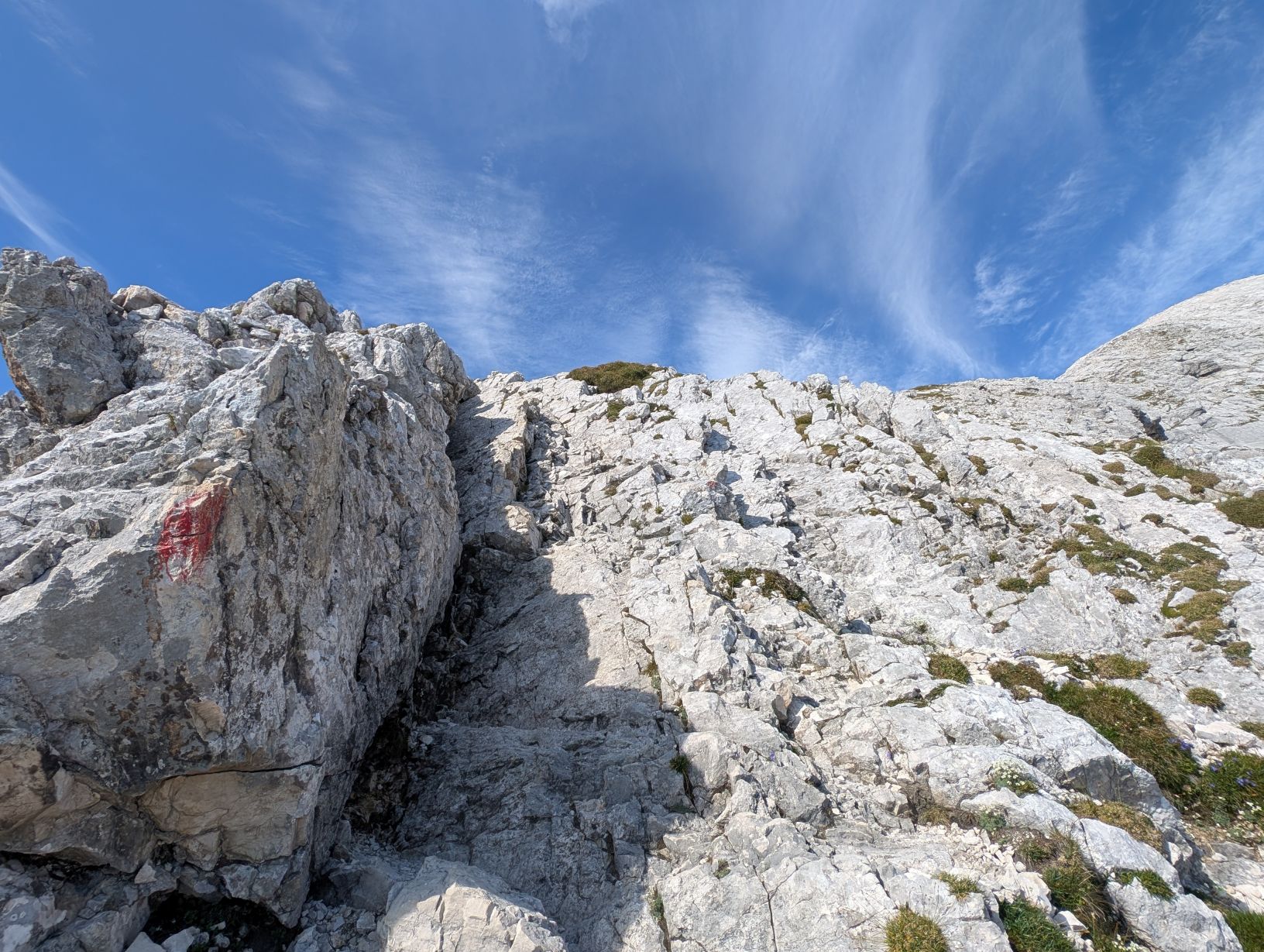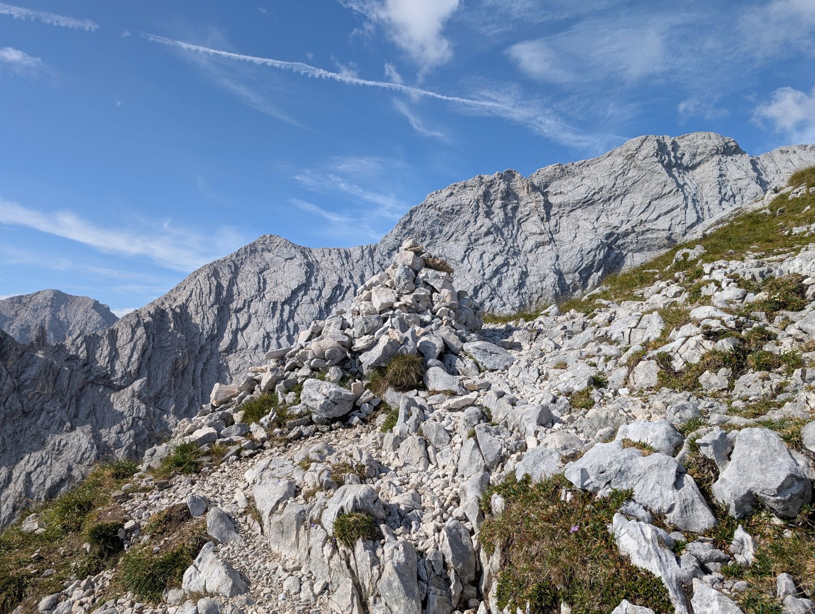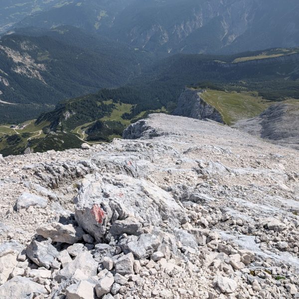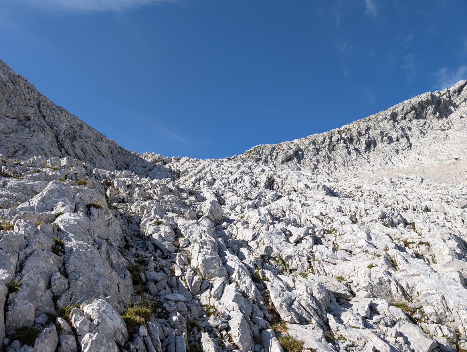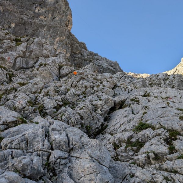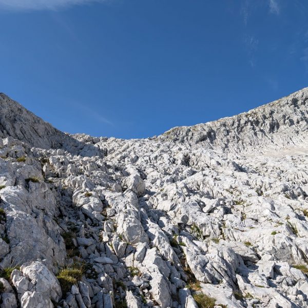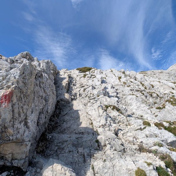 An der ersten Beschilderung im Kar angekommen, geht es nach links in Richtung Ostgrat. Über teils karstiges, teils schottriges Felsgelände arbeitet man sich nie schwierig aber manchmal unübersichtlich auf die Grathöhe hinauf. Oben angekommen, wartet ein beeindruckender Blick hinüber zum Blassengrat.