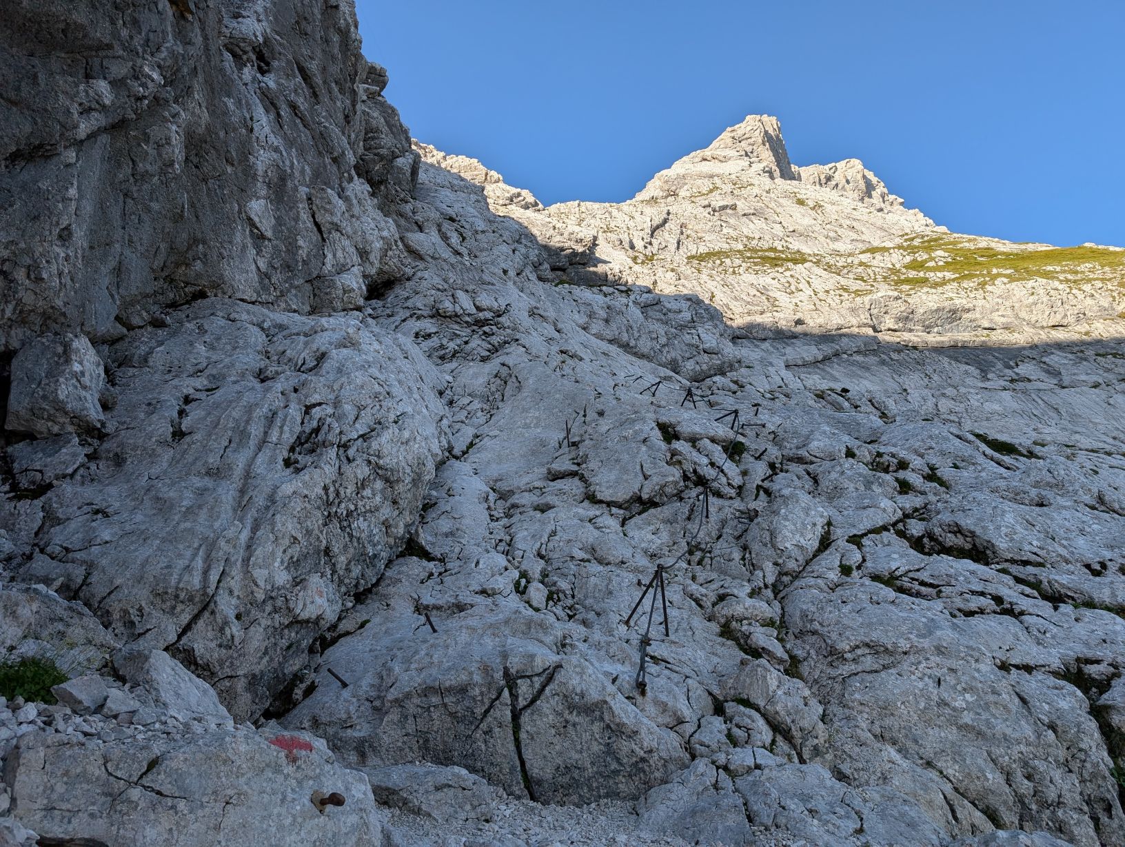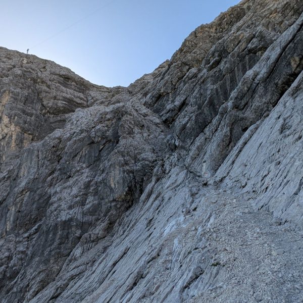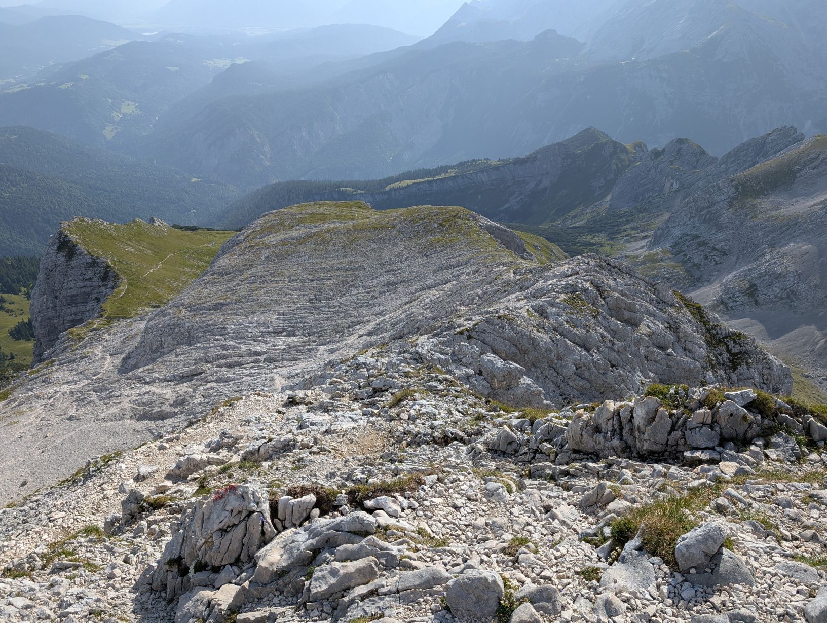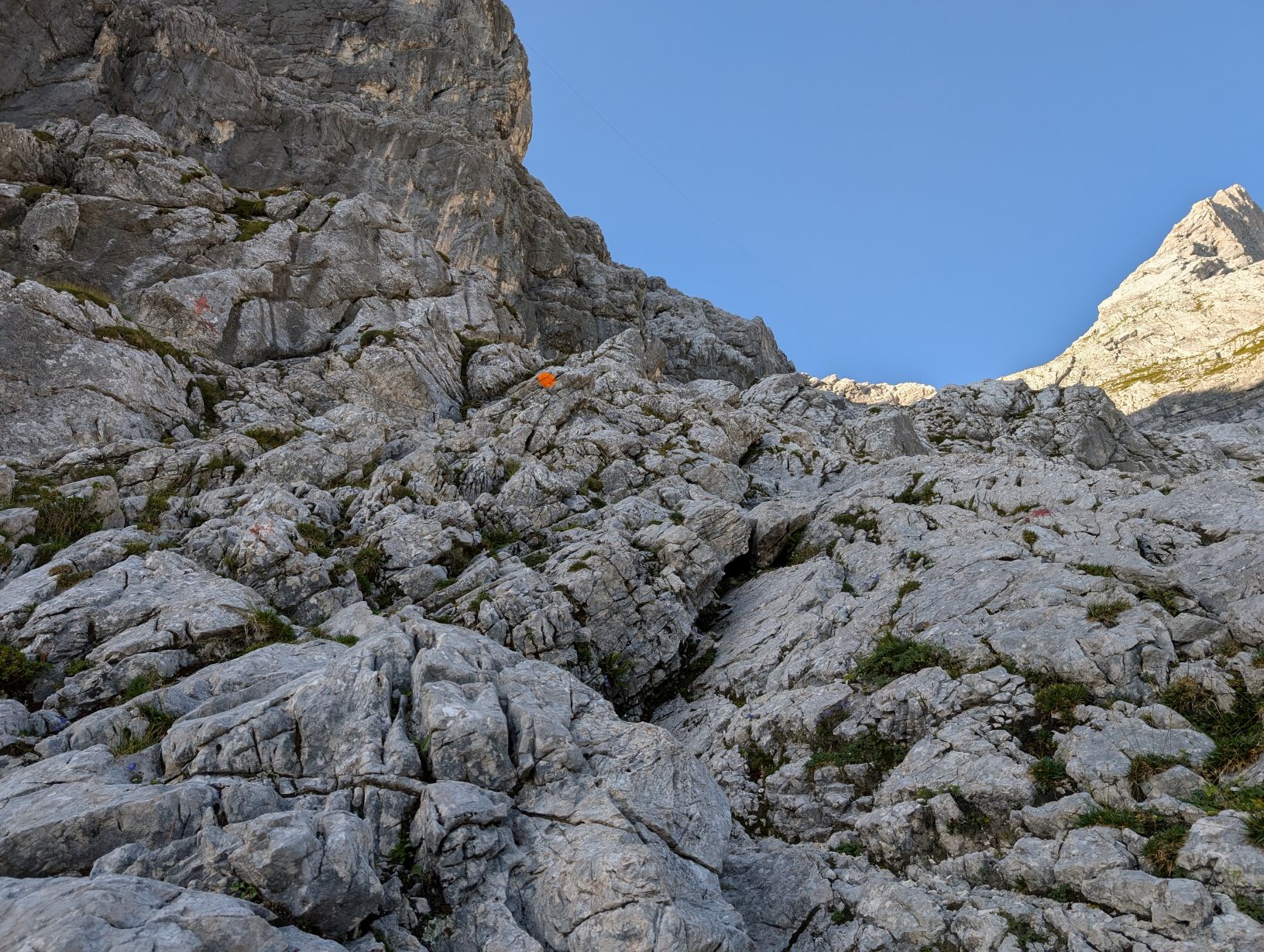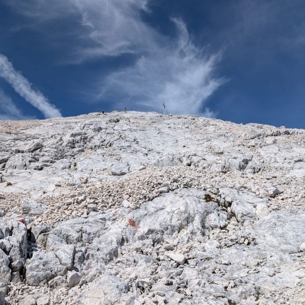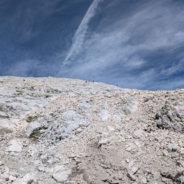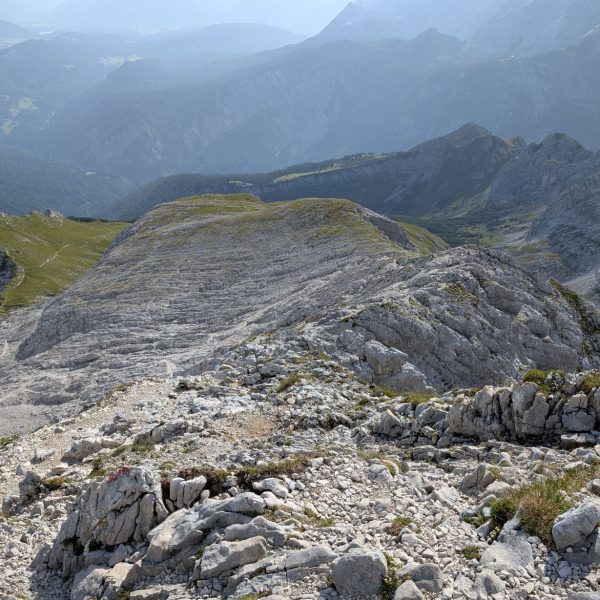 An der ersten Beschilderung im Kar angekommen, geht es nach links in Richtung Ostgrat. Über teils karstiges, teils schottriges Felsgelände arbeitet man sich nie schwierig aber manchmal unübersichtlich auf die Grathöhe hinauf. Oben angekommen, wartet ein beeindruckender Blick hinüber zum Blassengrat.