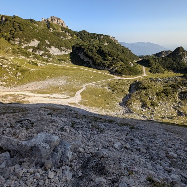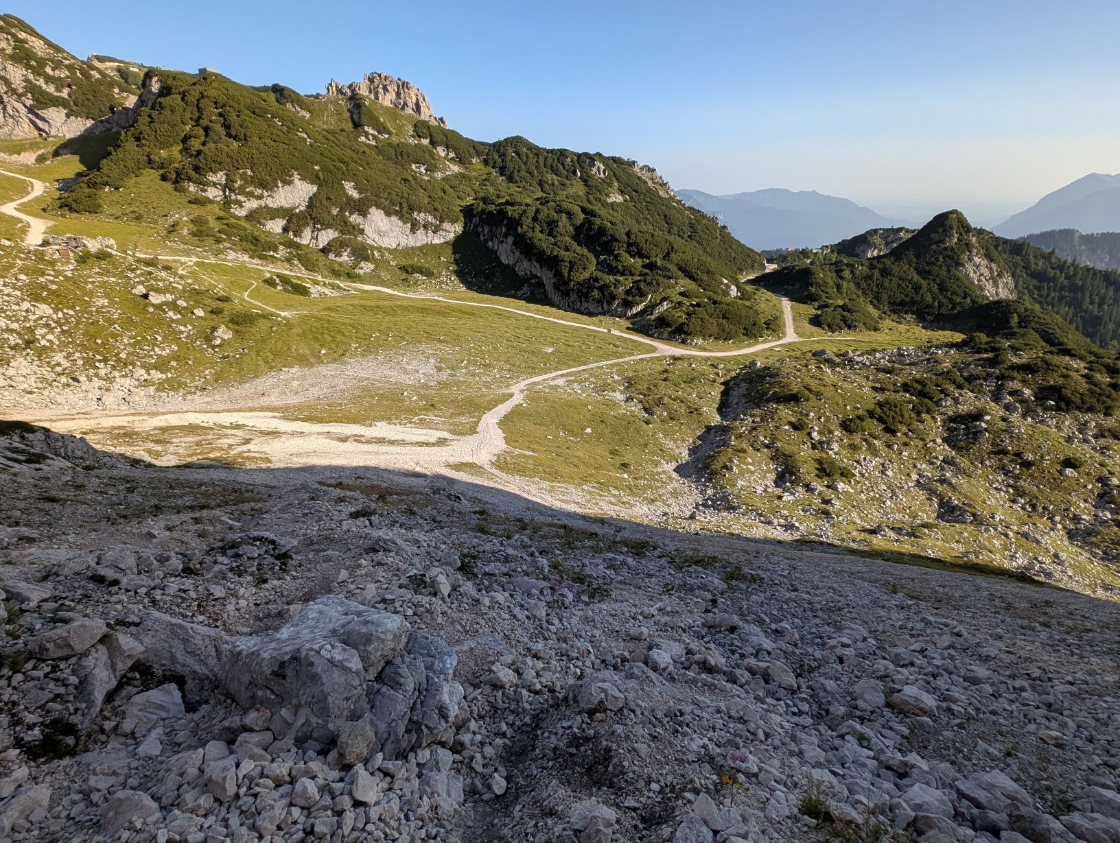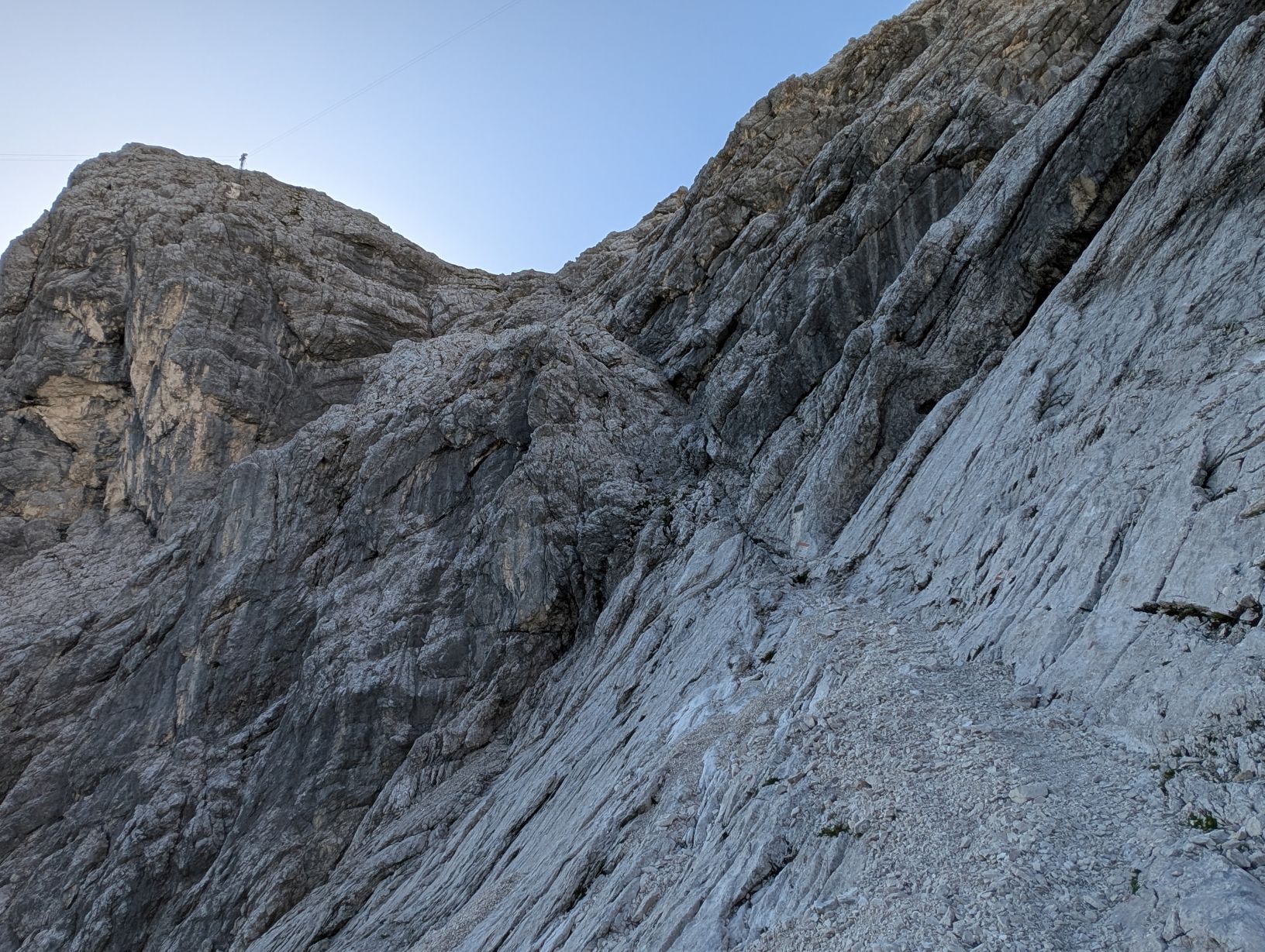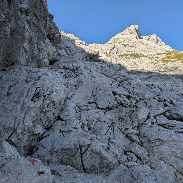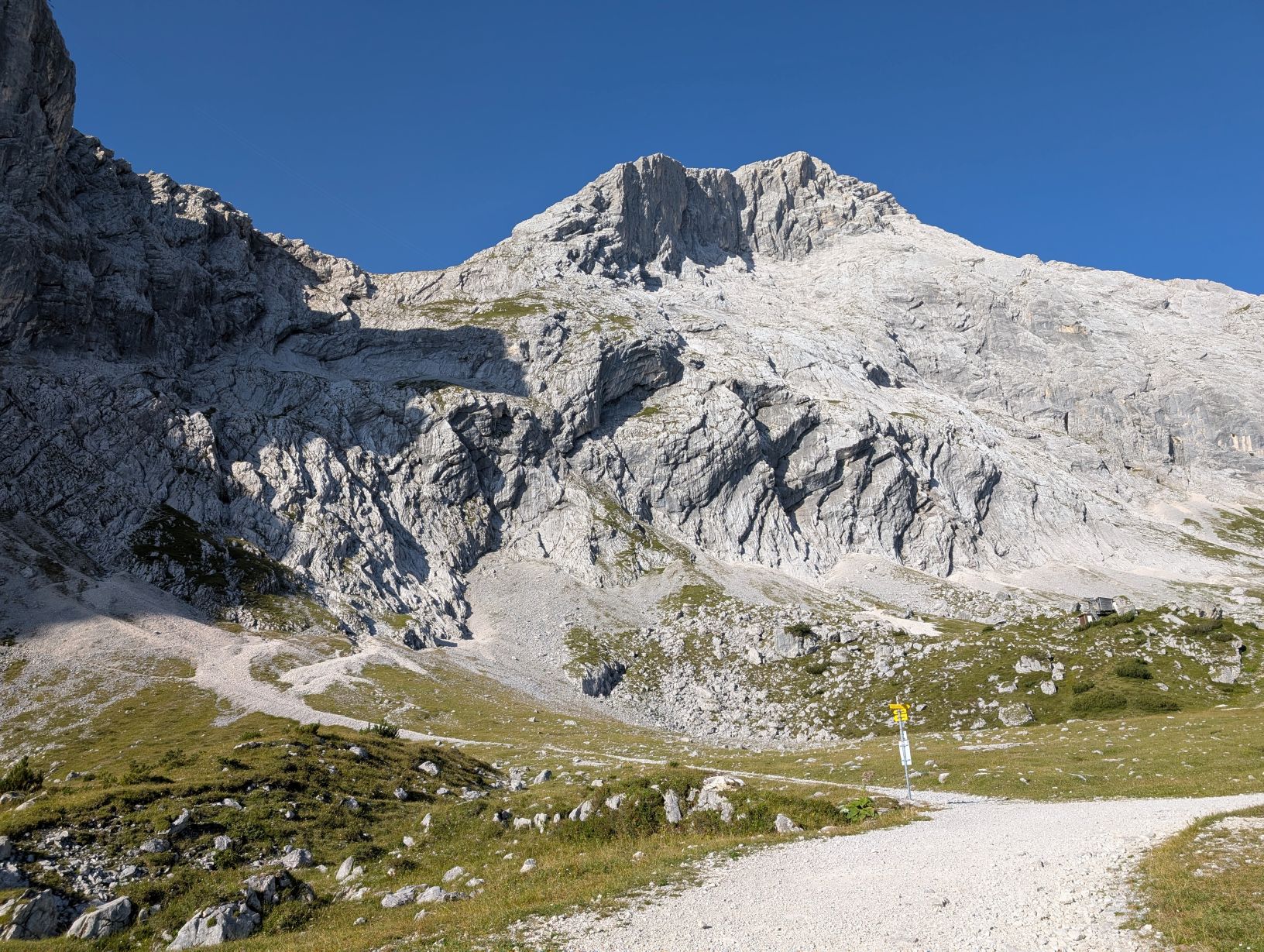 An der ersten Beschilderung im Kar angekommen, geht es nach links in Richtung Ostgrat. Über teils karstiges, teils schottriges Felsgelände arbeitet man sich nie schwierig aber manchmal unübersichtlich auf die Grathöhe hinauf. Oben angekommen, wartet ein beeindruckender Blick hinüber zum Blassengrat.