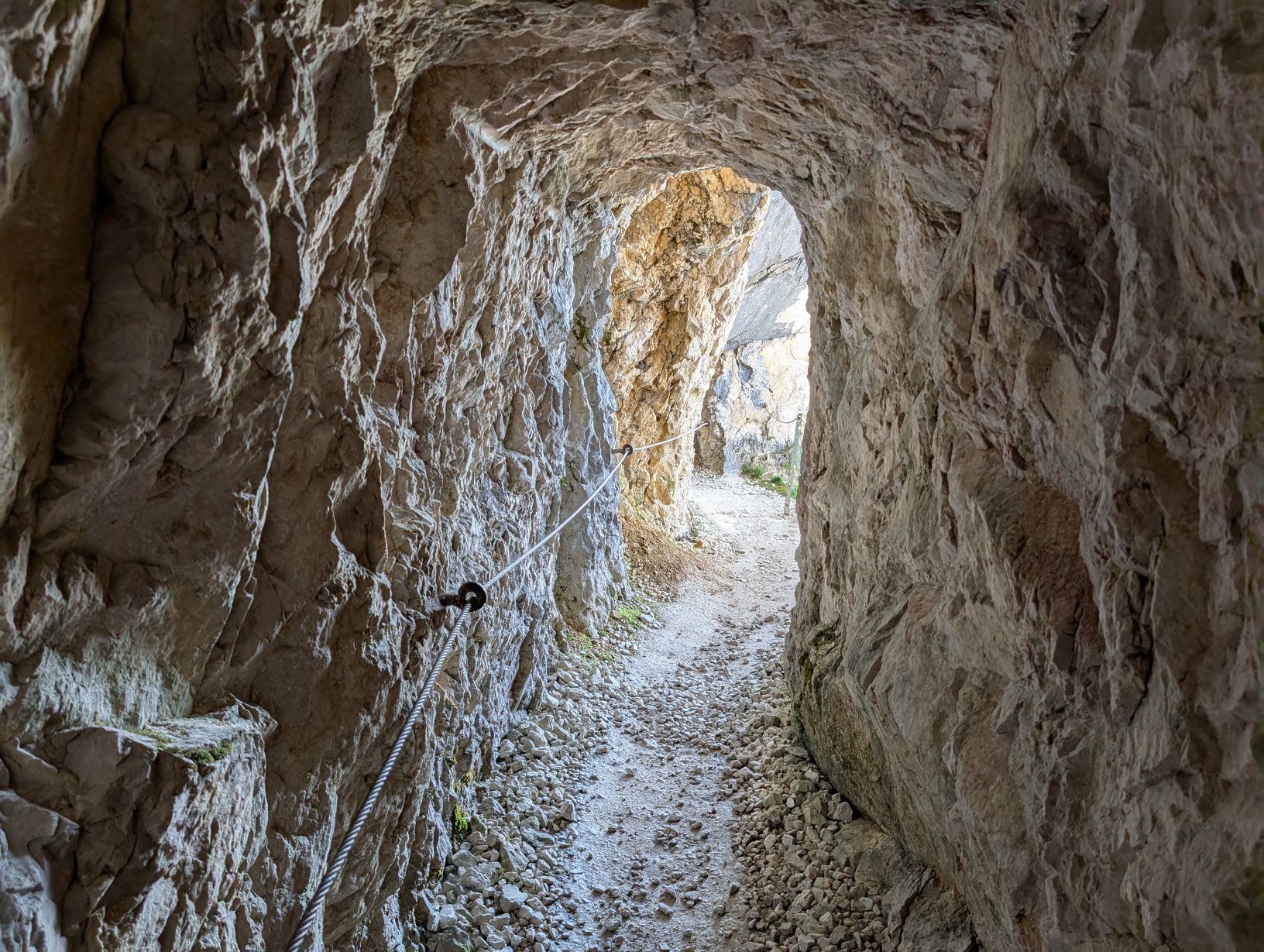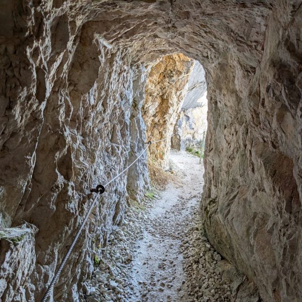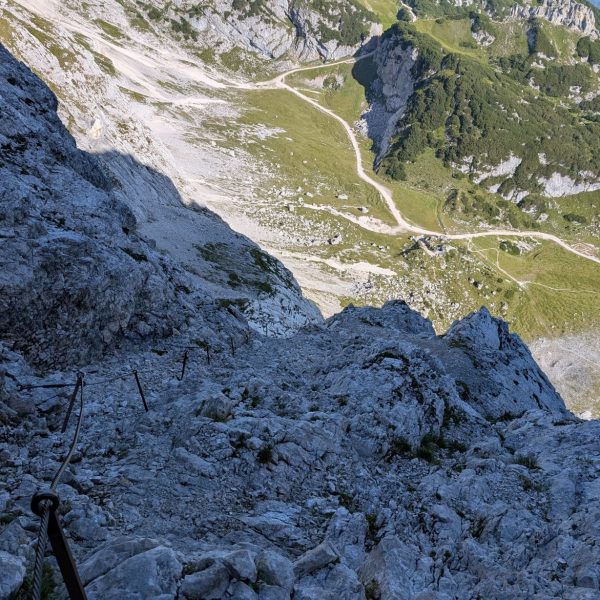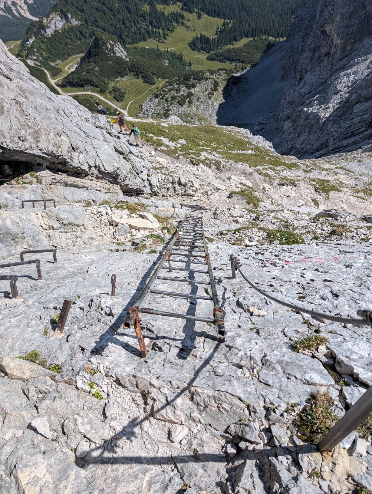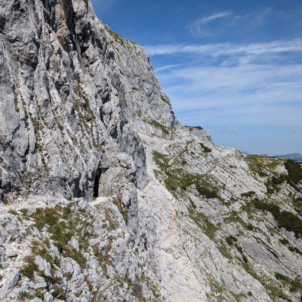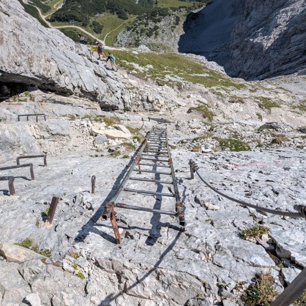 Unten angekommen, zieht nach links die Spur Richtung Nordwandsteig. Über zwei steile Leitern steigt man zu diesem ab und folgt dem kurzweiligen Steig über ein paar Versicherungen und Tunnel entlang der Nordwand, bis schließlich die Bergstation am Osterfelderkopf (2.050 m) in Sicht kommt. Zur Hochalm wären es nun noch 300 Hm Abstieg auf einem unspannenden Wanderweg. Hier kommt die kostenlose Verbindungsgondel zur Hochalm wirklich gelegen und in kurzer Zeit ist das Bike wieder erreicht.