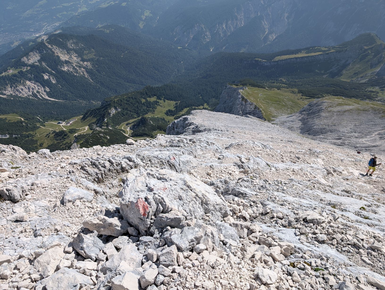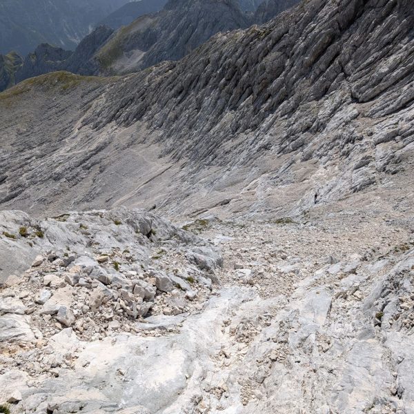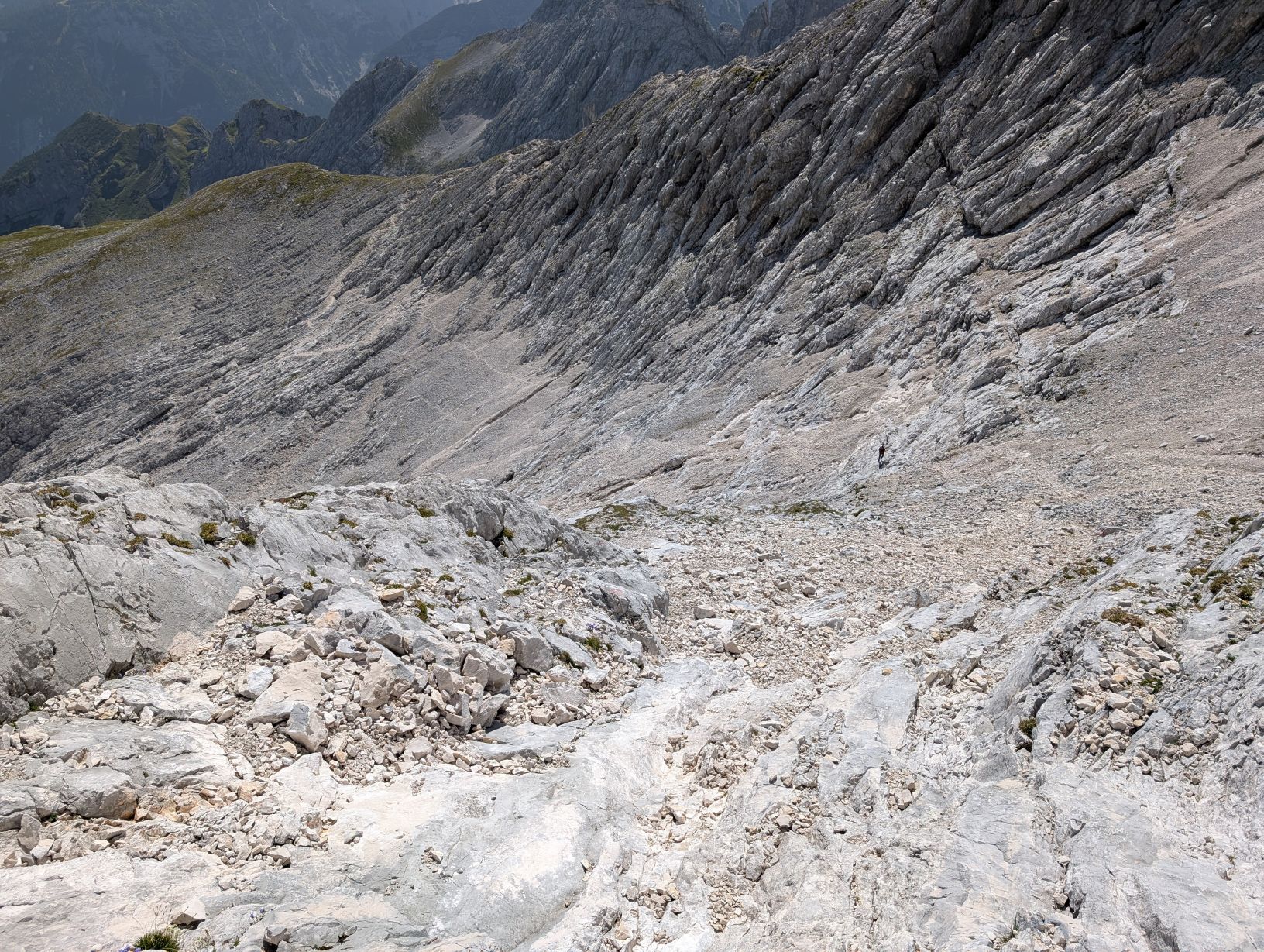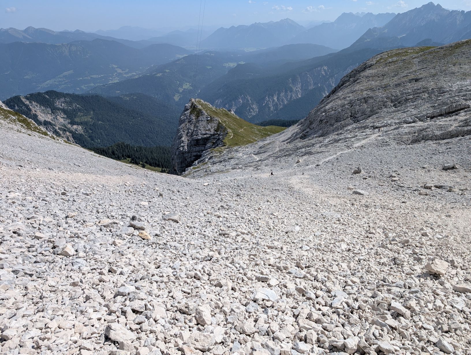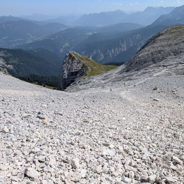 Vom Bernadeinkopf blickt man nun in die Schotterwüste der Alpspitz-Ostflanke. Es bieten sich nun zwei nahe beieinander liegende Wege an. Der links verlaufende Ostgrat (Normalabstieg nach der Alpspitz-Ferrata) und der direkte Weg durch die schottrige Ostflanke (im Winter die Skitourenroute).