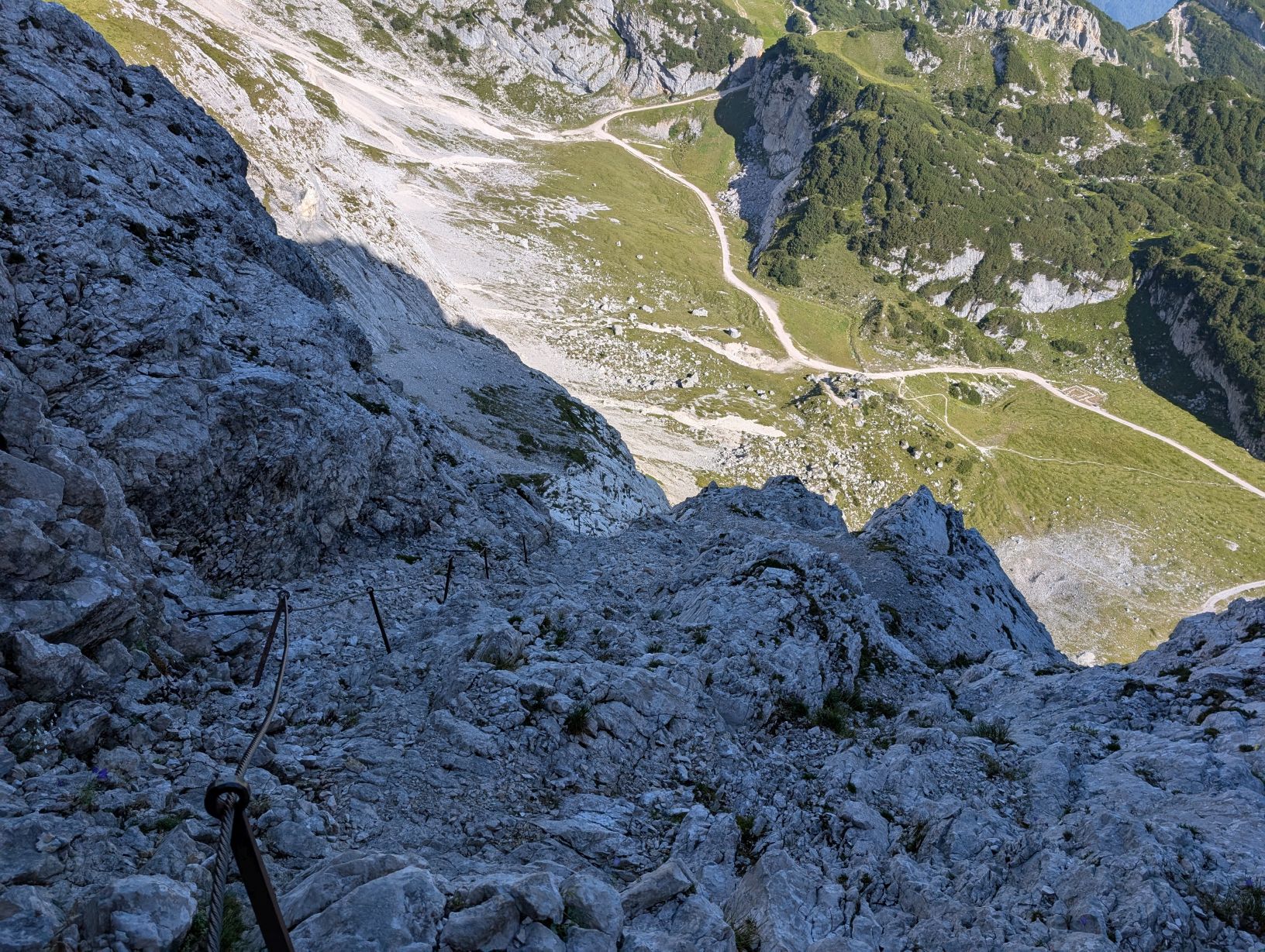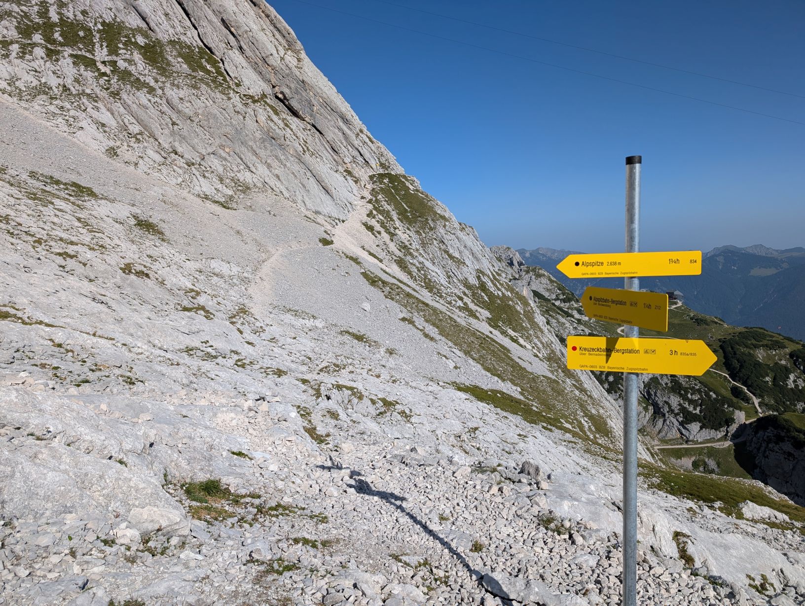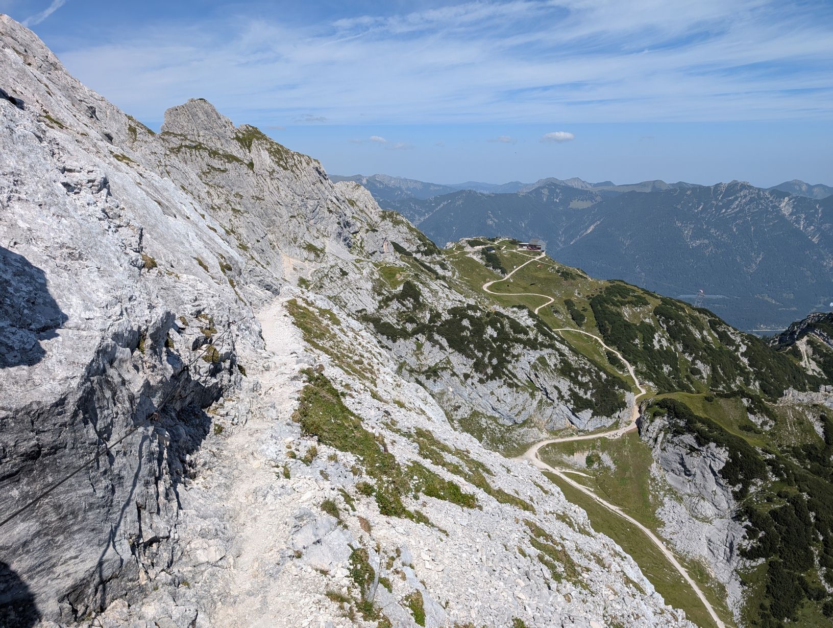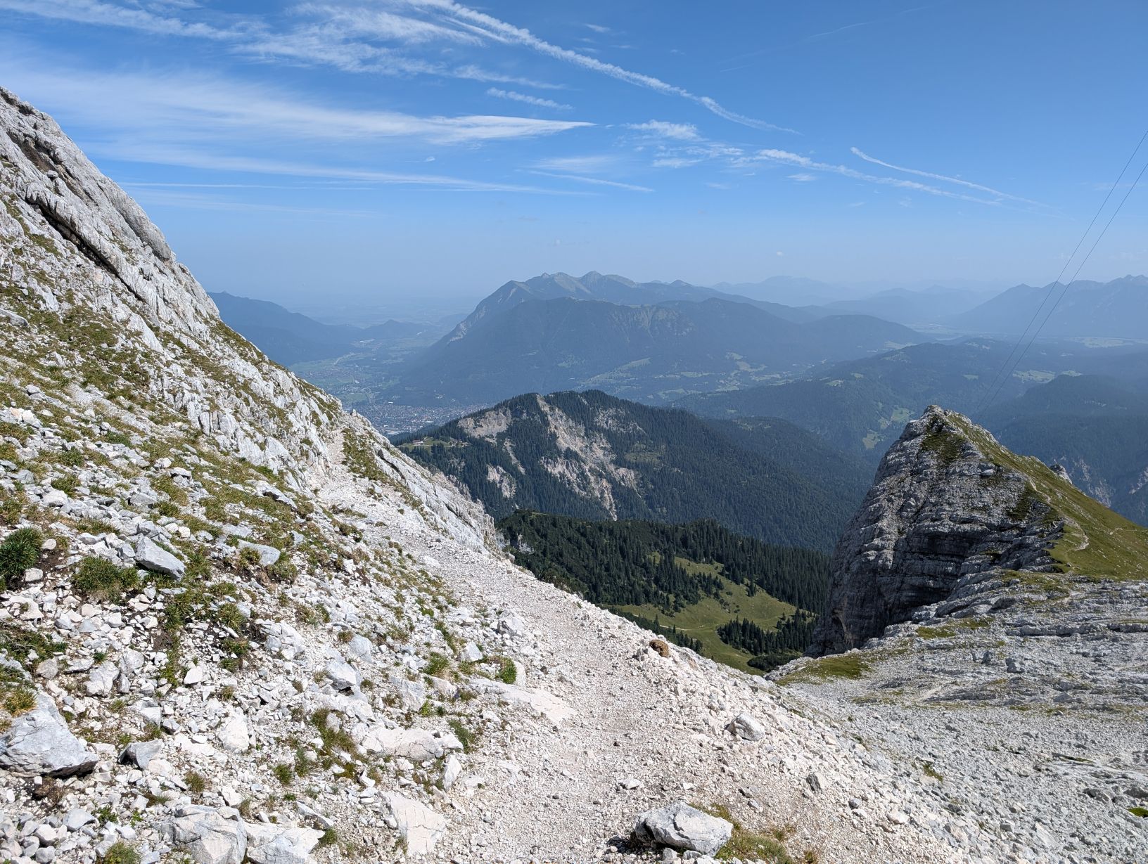 Vom Bernadeinkopf blickt man nun in die Schotterwüste der Alpspitz-Ostflanke. Es bieten sich nun zwei nahe beieinander liegende Wege an. Der links verlaufende Ostgrat (Normalabstieg nach der Alpspitz-Ferrata) und der direkte Weg durch die schottrige Ostflanke (im Winter die Skitourenroute).