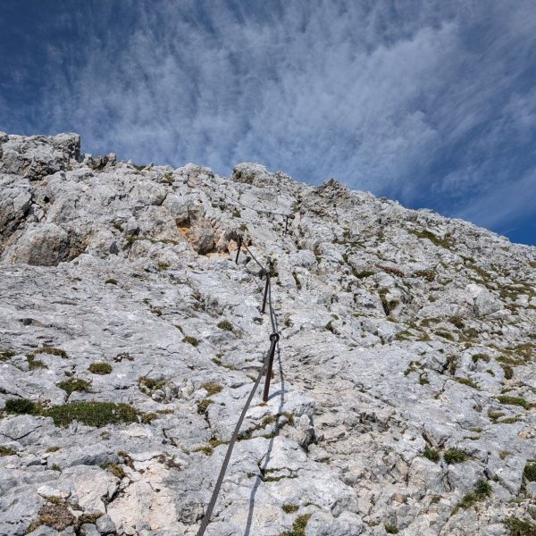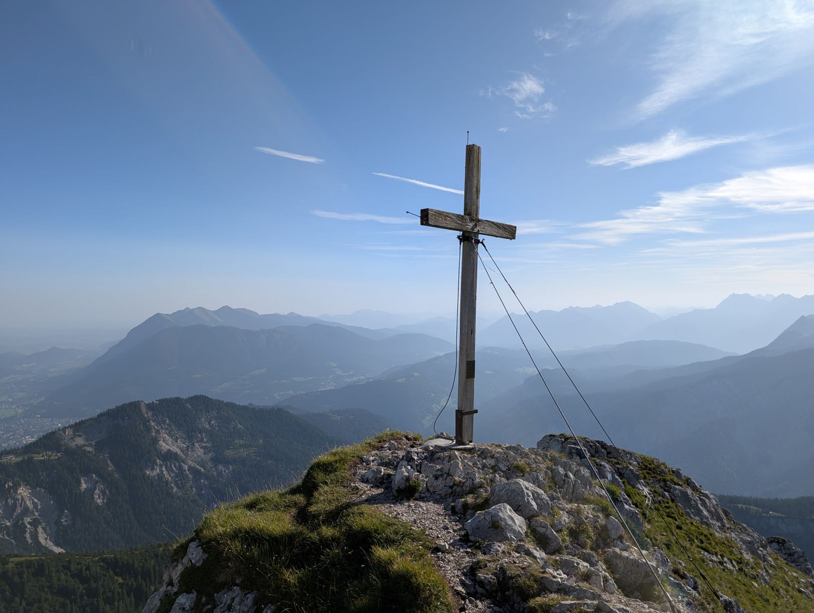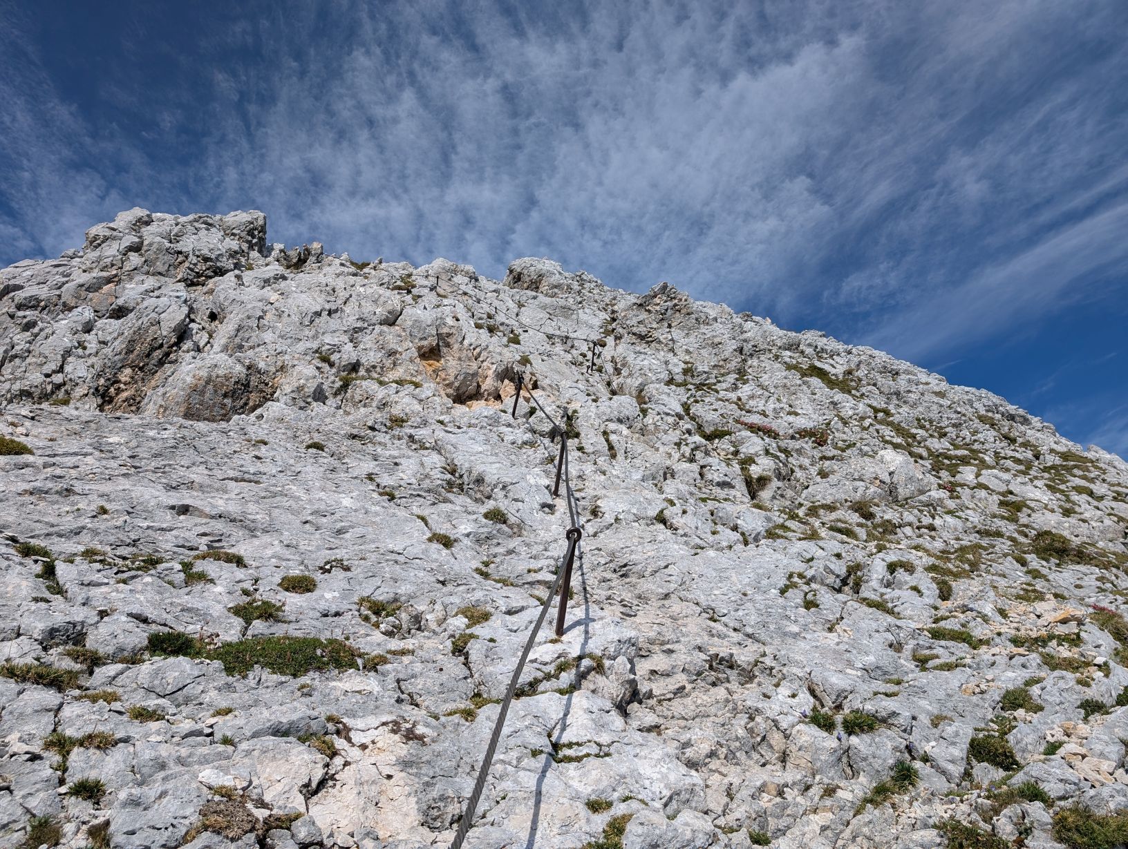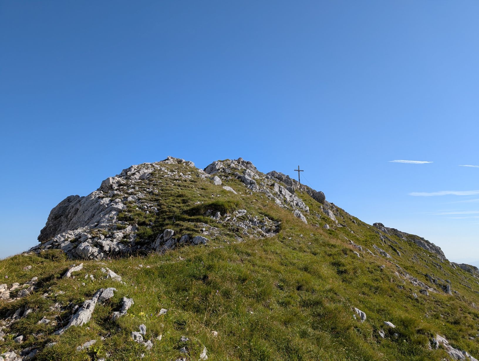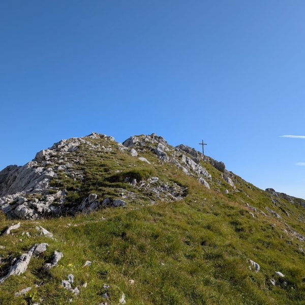 Auf dem meist breiten Ostgrat angekommen, folgt man diesem nun Richtung Gipfel, dessen Kreuz schon von weitem erkennbar ist. Meist bewegt man sich in einfachem und relativ festem Gehgelände. Nur an einer Stelle wird es ein bisschen schmaler, hier gibt es aber eine Drahtseilsicherung. Darüber hinaus besticht der Ostgrat durch natürliches und nicht übermarkiertes Felsgelände.