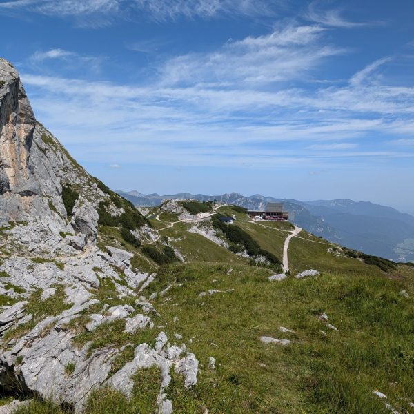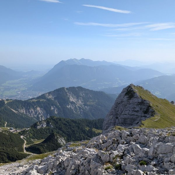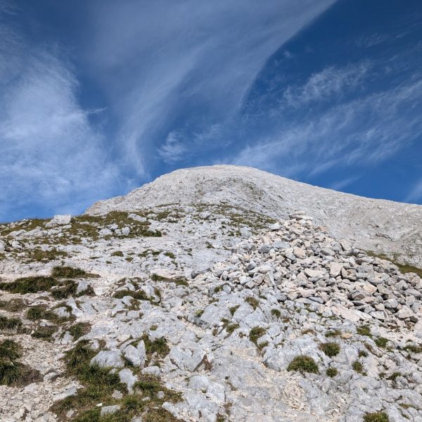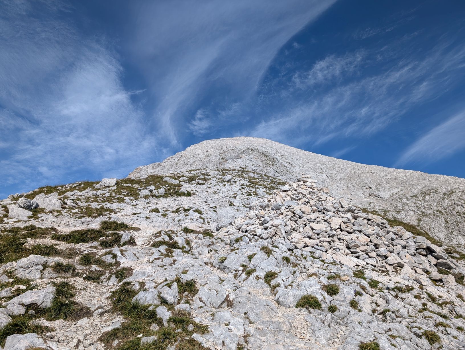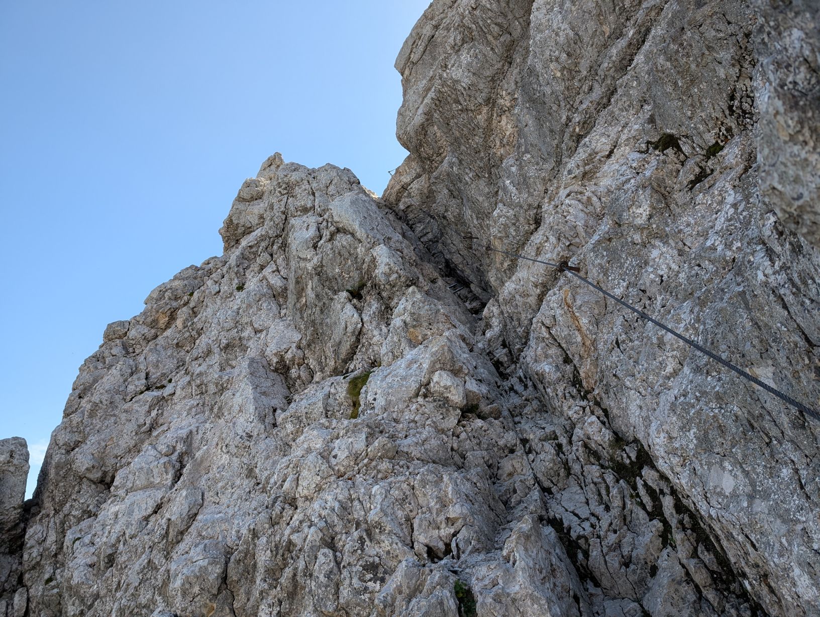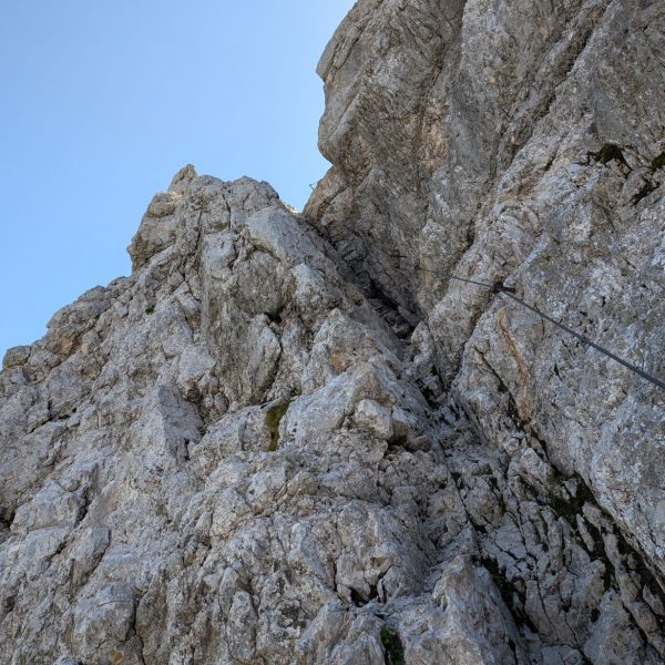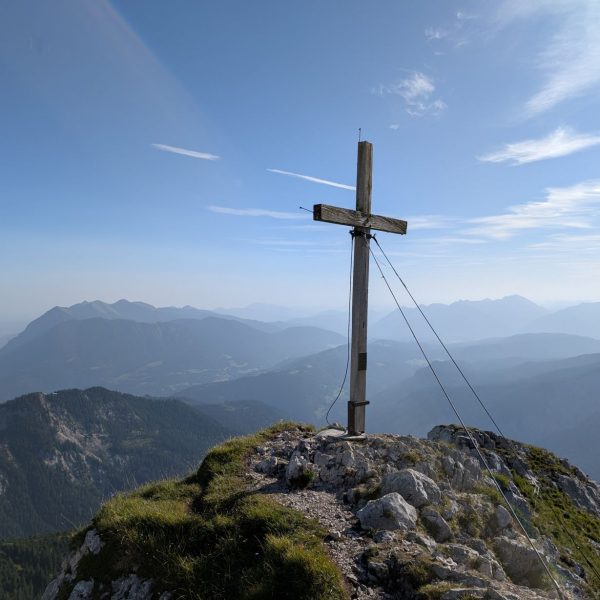 Auf dem meist breiten Ostgrat angekommen, folgt man diesem nun Richtung Gipfel, dessen Kreuz schon von weitem erkennbar ist. Meist bewegt man sich in einfachem und relativ festem Gehgelände. Nur an einer Stelle wird es ein bisschen schmaler, hier gibt es aber eine Drahtseilsicherung. Darüber hinaus besticht der Ostgrat durch natürliches und nicht übermarkiertes Felsgelände.