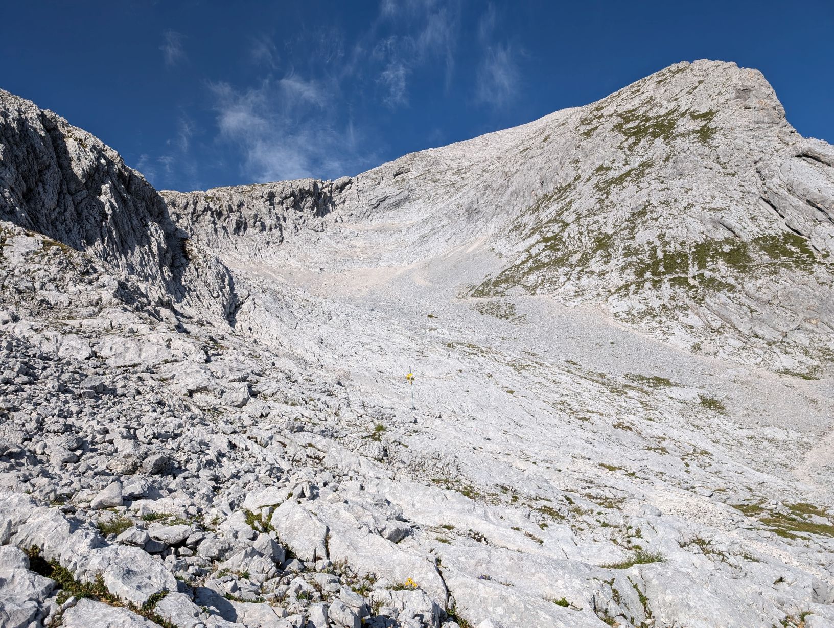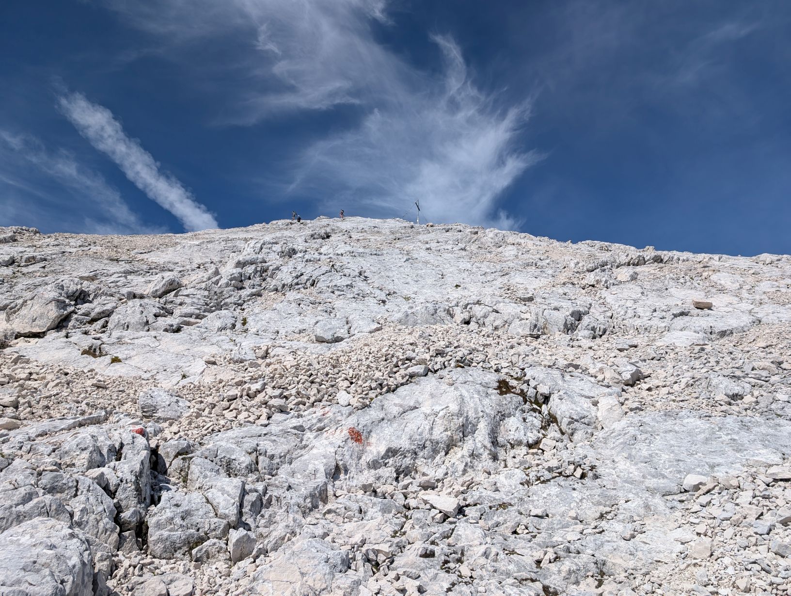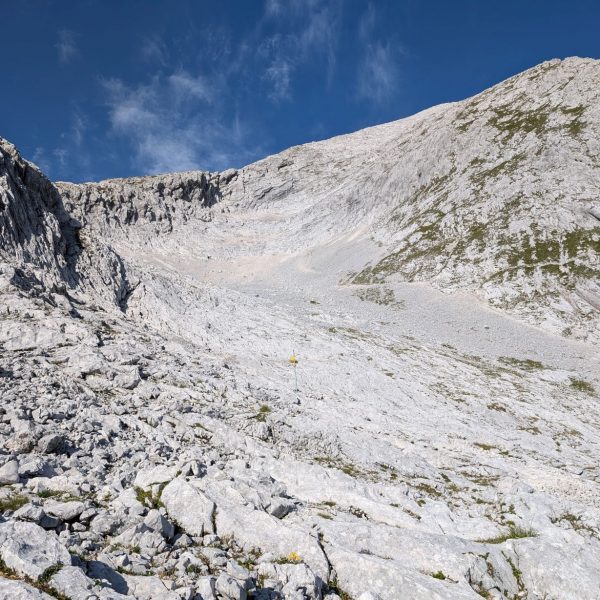 Nach langer Gipfelpause ist es Zeit, sich an den Abstieg zu machen. Direkt vom Gipfelkreuz folgt man den Markierungen in die bröselige und steile Ostflanke. Von einer spaßigen Geröllabfahrt ist auf diesem Abstieg leider nur zu träumen. Vorsichtig gilt es, die feinsplittrige Spur abzusteigen, die Orientierung fällt immerhin nicht schwer.