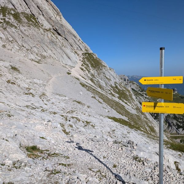 Parkplatz Hausbergbahn (730 m) – Partnachalm (983 m) – Hausberg (1.335 m) – Kreuzeck (1.651 m) – Hochalm (1.703 m) – Bernadeinkopf (2.143 m) – Alpspitze (2.628 m) über Ostgrat – Osterfelderkopf (2.050 m) über Ostflanke und Nordwandsteig – Hochalm (1.703 m) – Kreuzeck (1.651 m) – Hausberg (1.335 m) – Tonihütte (1.096 m) – Rießersee (800 m) – Hausbergbahn