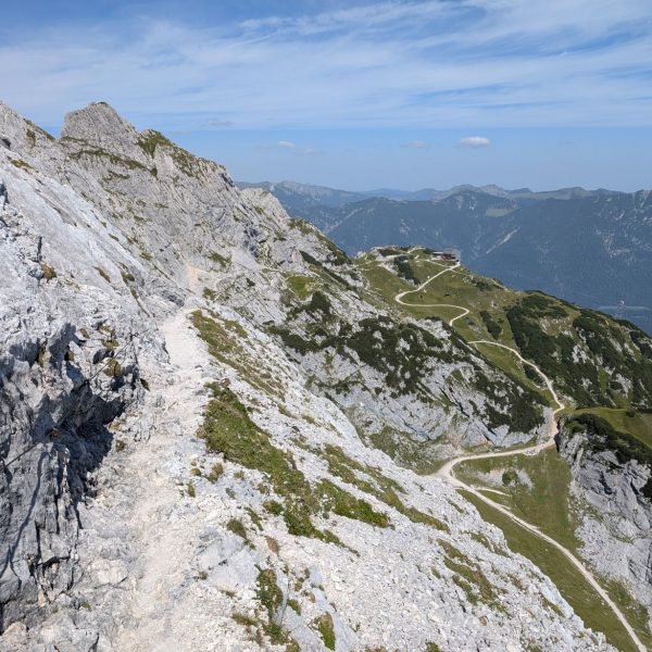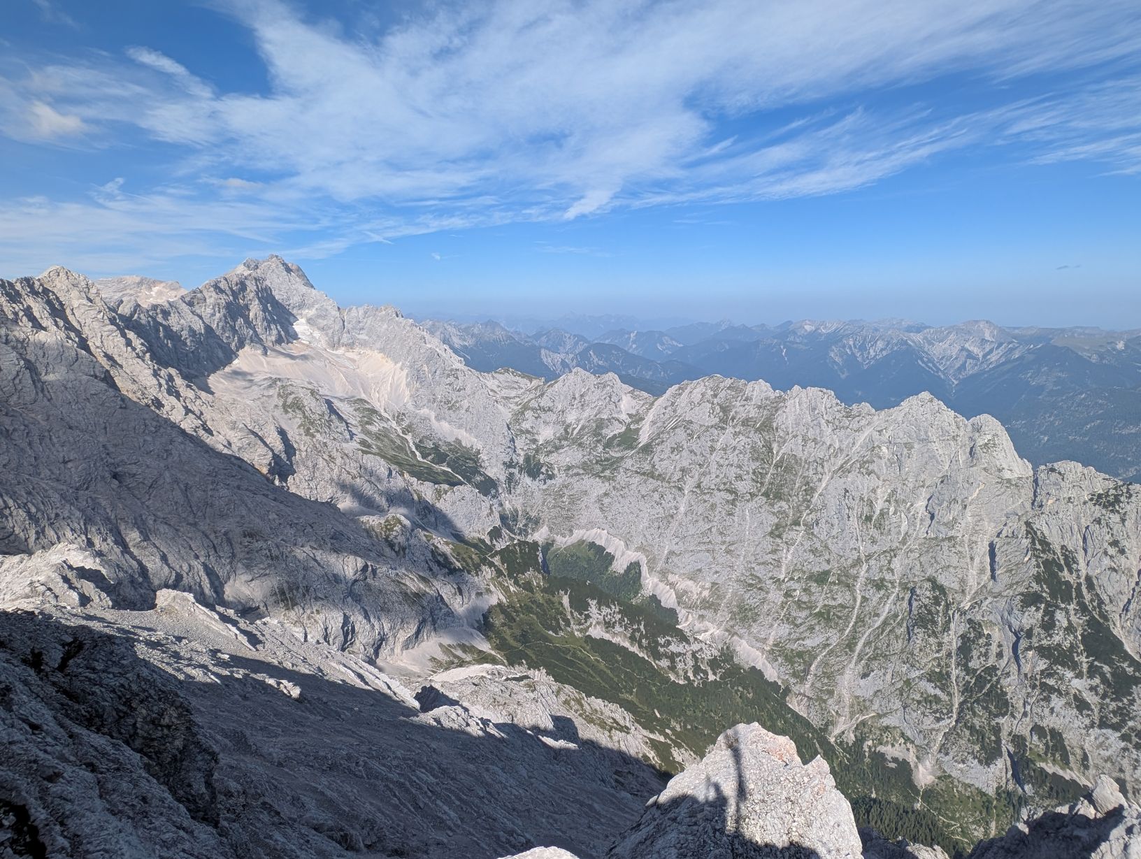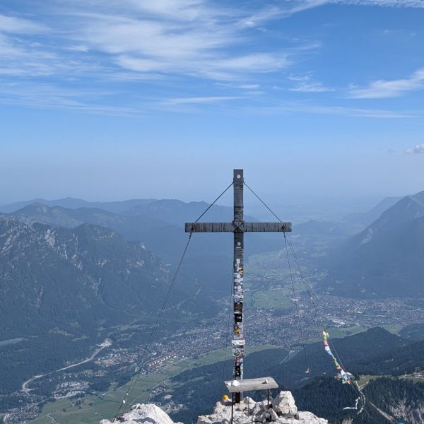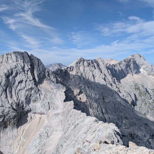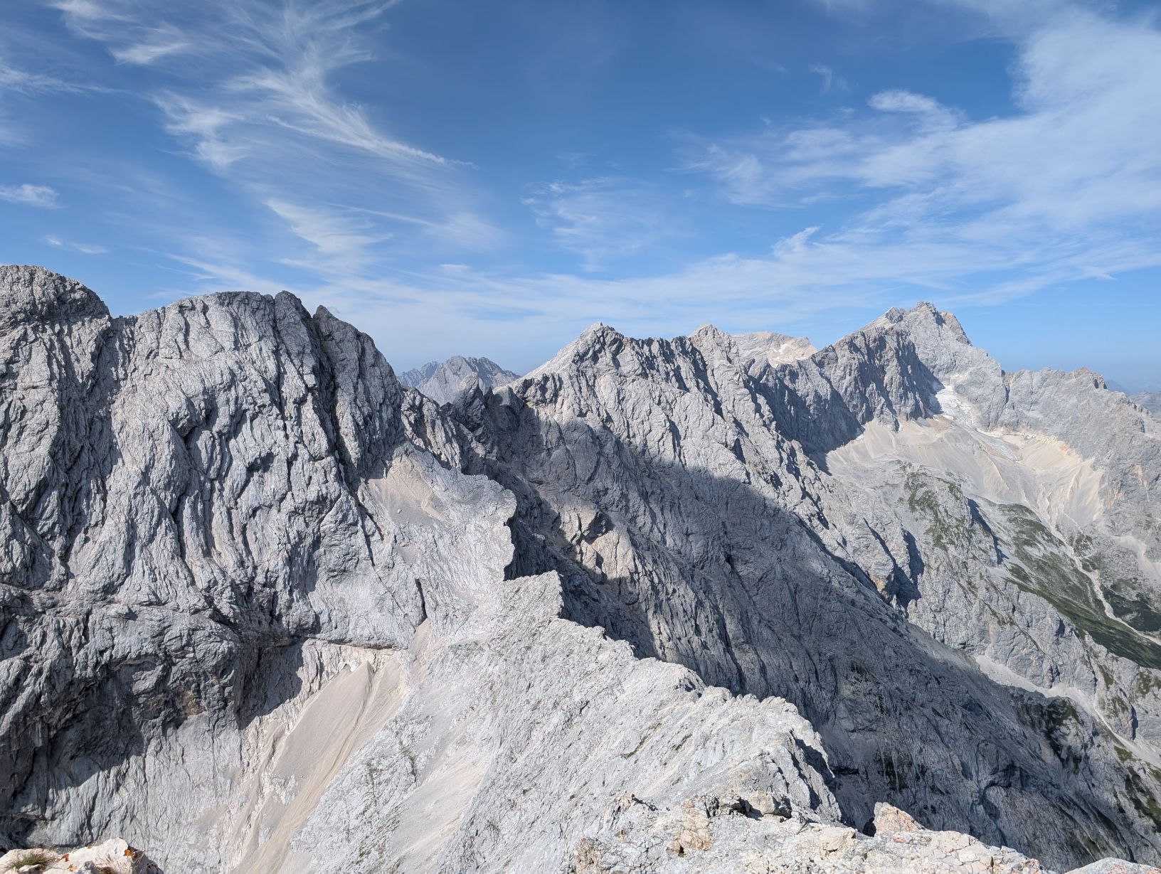 Nach der Sicherung gelangt man zur finalen Flanke unter dem Gipfel. Hier wird es nochmal bröseliger, aber der Spur ist einfach zu folgen. Schließlich ist es geschafft und er Gipfel der Alpspitze (2.628 m) ist erreicht. Und der Empfang am Gipfel ist wirklich atemberaubend, denn sowohl der Blick über das Kreuz nach Garmisch, als auch hinüber zum Jubiläumsgrat und ins Höllental wird erstmalig von hier aus frei. Auch wenn man hier selten alleine ist, ein absolut lohnender Gipfel!