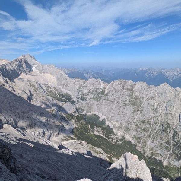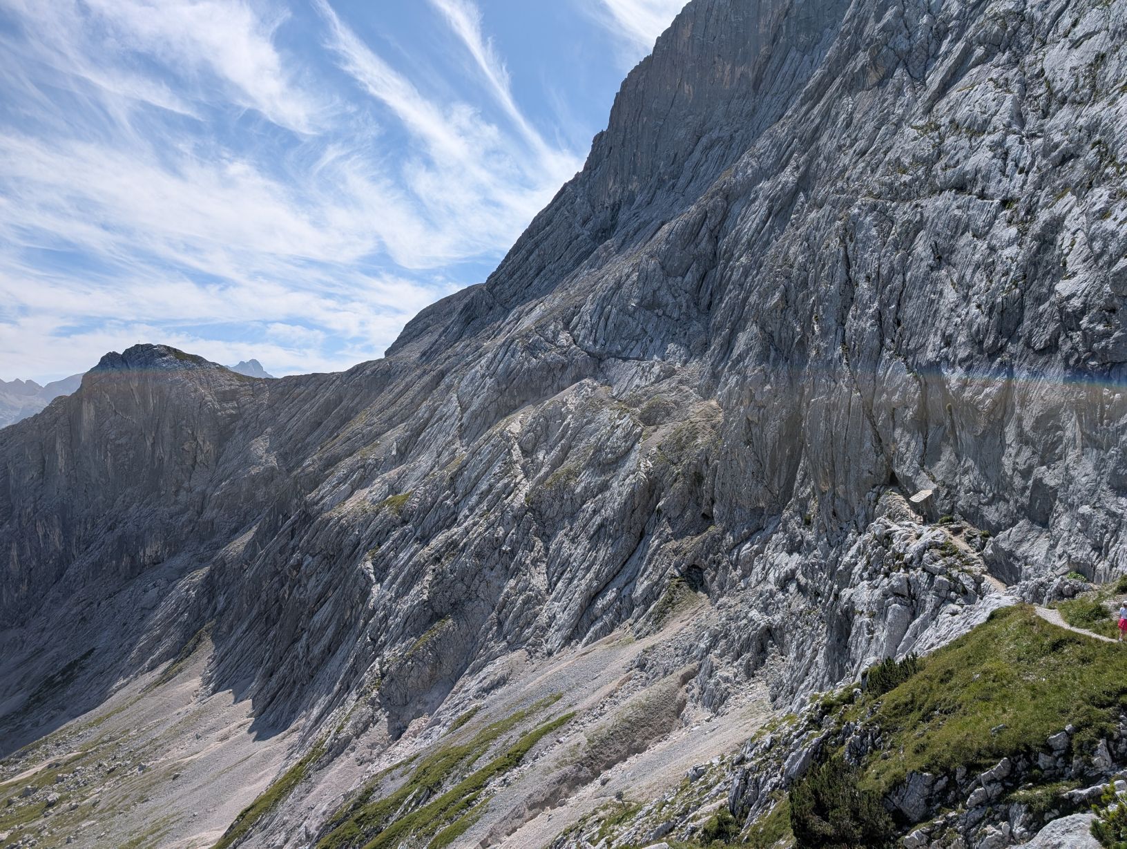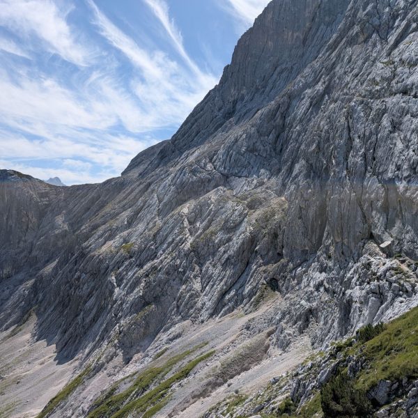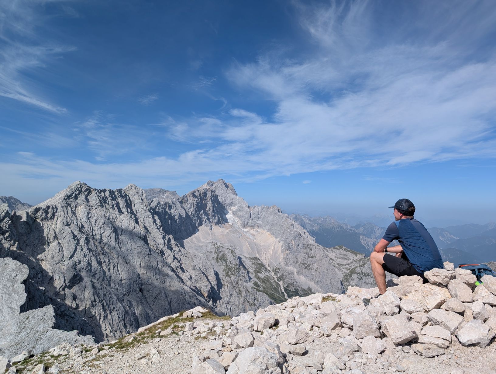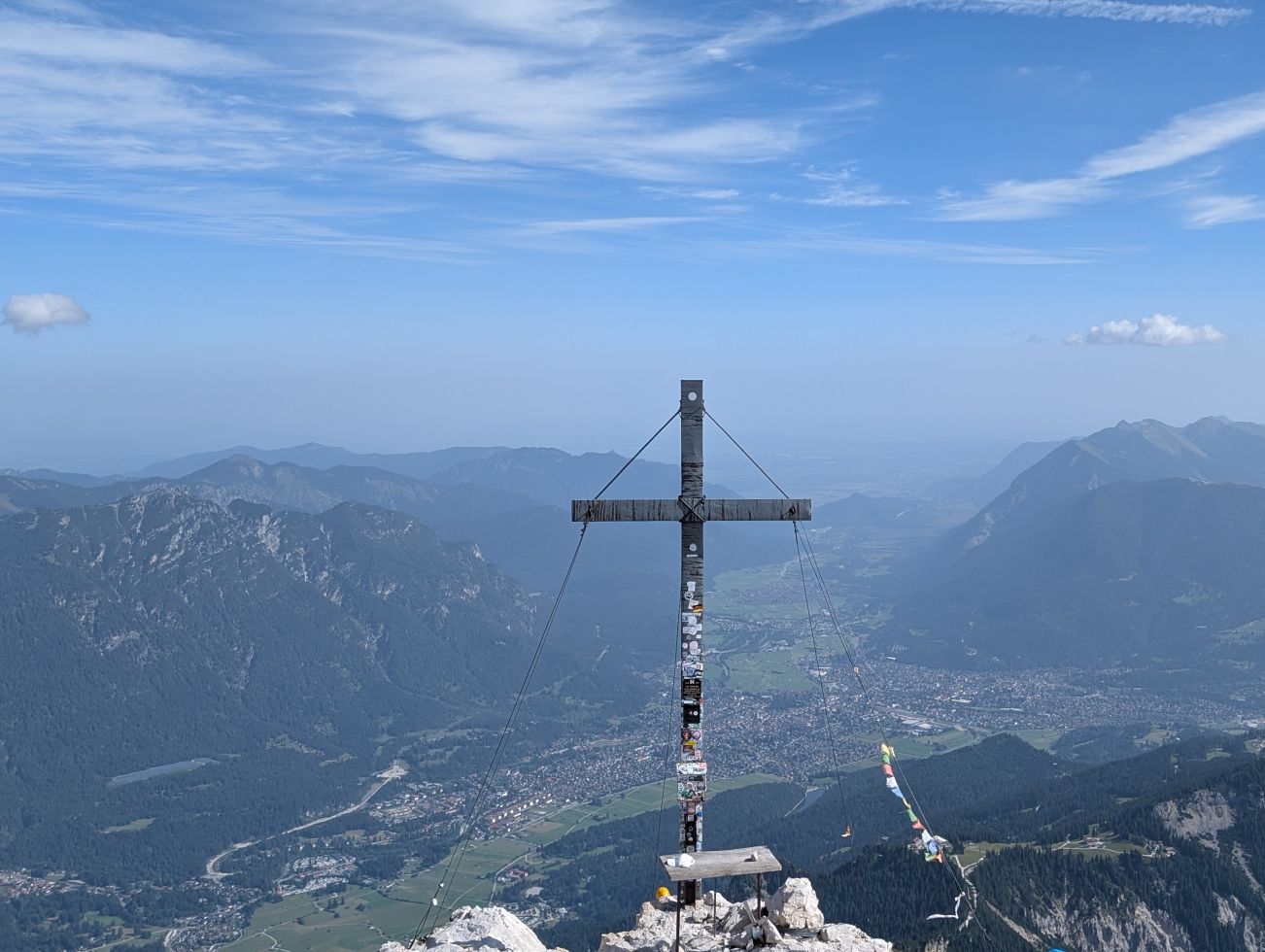Nach der Sicherung gelangt man zur finalen Flanke unter dem Gipfel. Hier wird es nochmal bröseliger, aber der Spur ist einfach zu folgen. Schließlich ist es geschafft und er Gipfel der Alpspitze (2.628 m) ist erreicht. Und der Empfang am Gipfel ist wirklich atemberaubend, denn sowohl der Blick über das Kreuz nach Garmisch, als auch hinüber zum Jubiläumsgrat und ins Höllental wird erstmalig von hier aus frei. Auch wenn man hier selten alleine ist, ein absolut lohnender Gipfel!