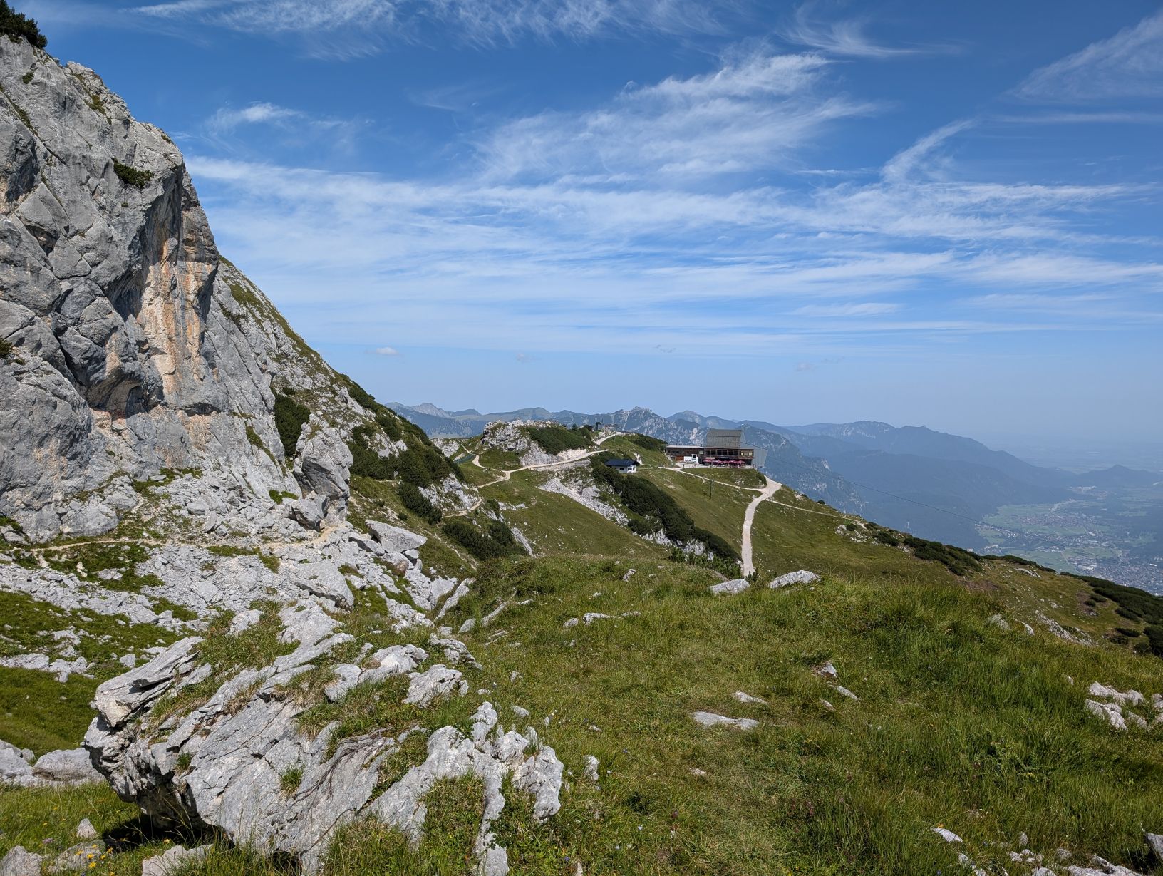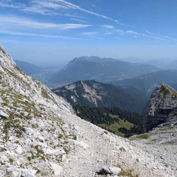Über Ier-Gelände und ein paar Drahtseil- und Leiterpassagen (A) sind die Schöngänge entlang der Markierungen schnell absolviert. Am Ausstieg eröffnet sich der Blick nach Süden zum Hohen Gaif sowie nach rechts auf die Ostflanke der Alpspitze. Ein kurzer Abstecher nach links und der Gipfel am Bernadeinkopf (2.143 m) ist erreicht.