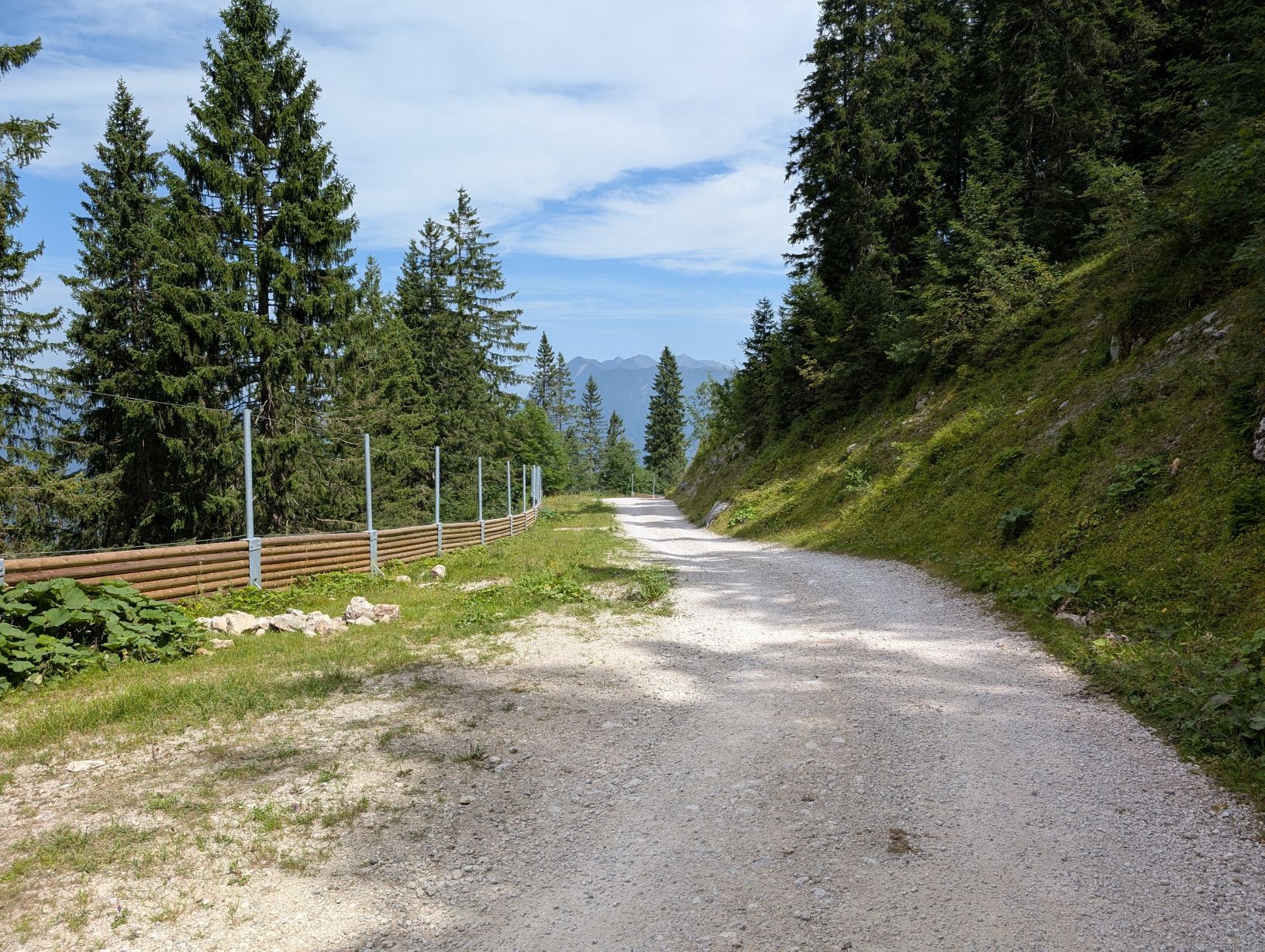 Parallel zum unterhalb verlaufenden Zugspitz-Aufstieg durch das Reintal verläuft die weitere Strecke nun über den Hohen Weg auf einer langen Gerade durch den Wald. Lange Zeit verliert man eher an Höhe, bis es bei einer Beschilderung zum Hausberg nach rechts abzweigt. Nun steilt die Straße in einigen Kehren auf und bewegt sich von der Rückseite auf den Hausberg (1.335 m) zu, der schließlich in einer langen Linkskurve erreicht ist.