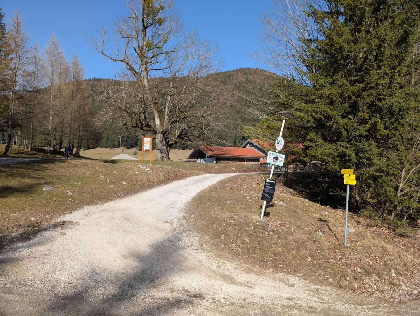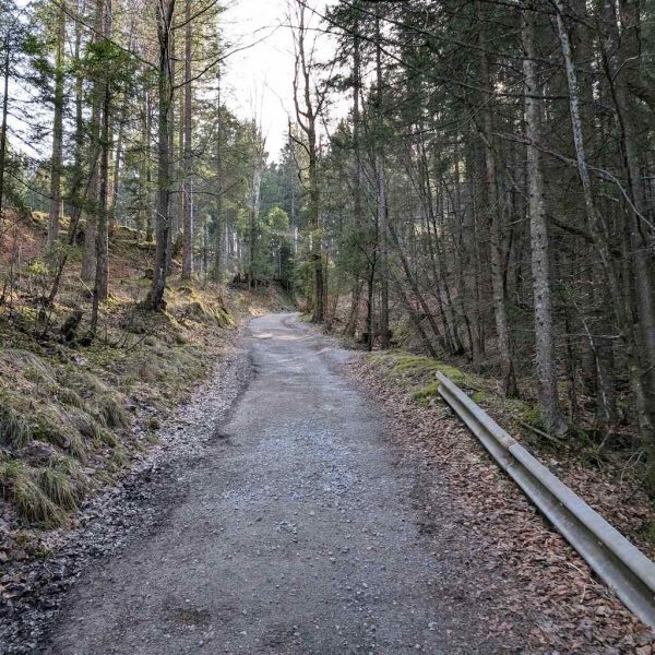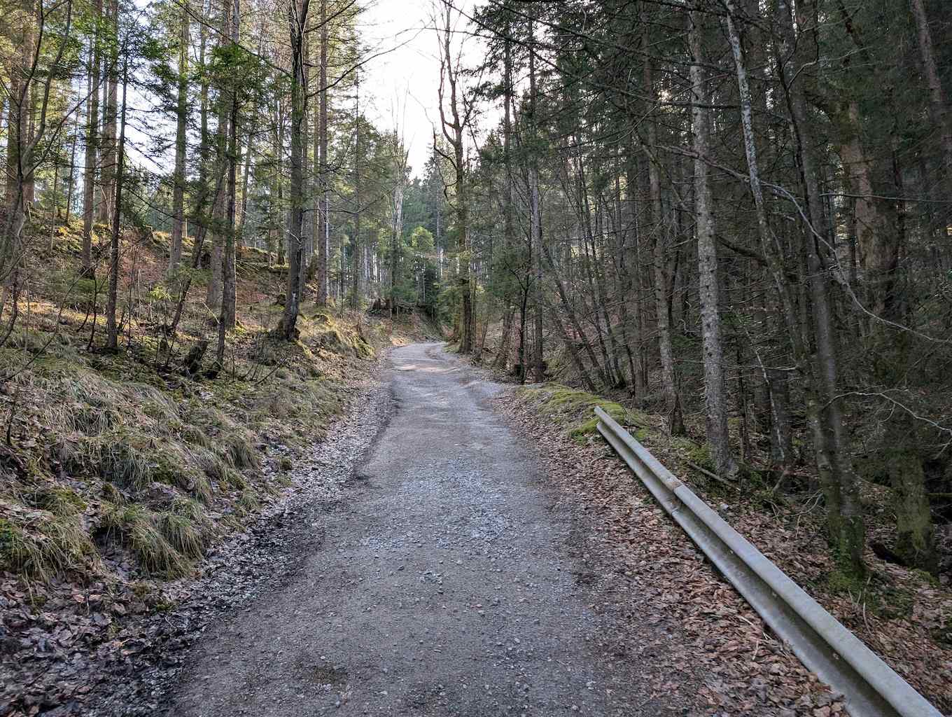 Die Straße biegt nun nach links ab und führt in einer großen Schleife durch den Wald. Teils holprig gewinnen wir einige Höhenmeter und erreichen schließlich zuletzt leicht bergab die Schuhbräualm (1.140 m).