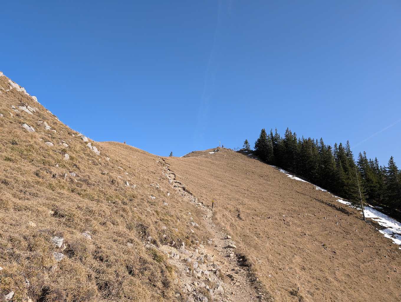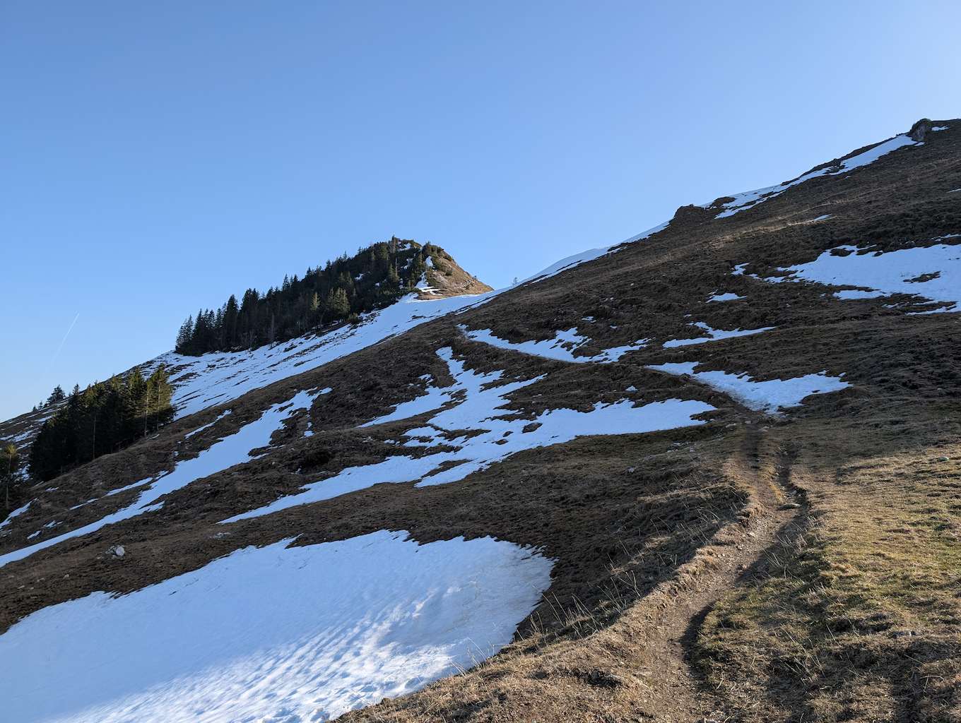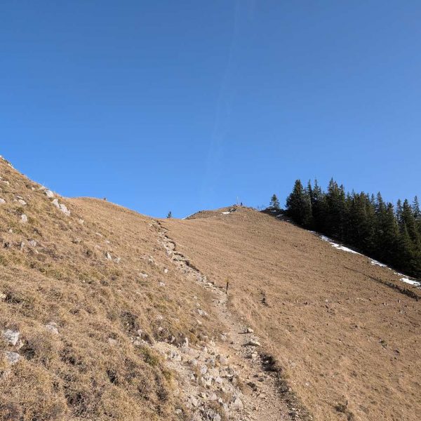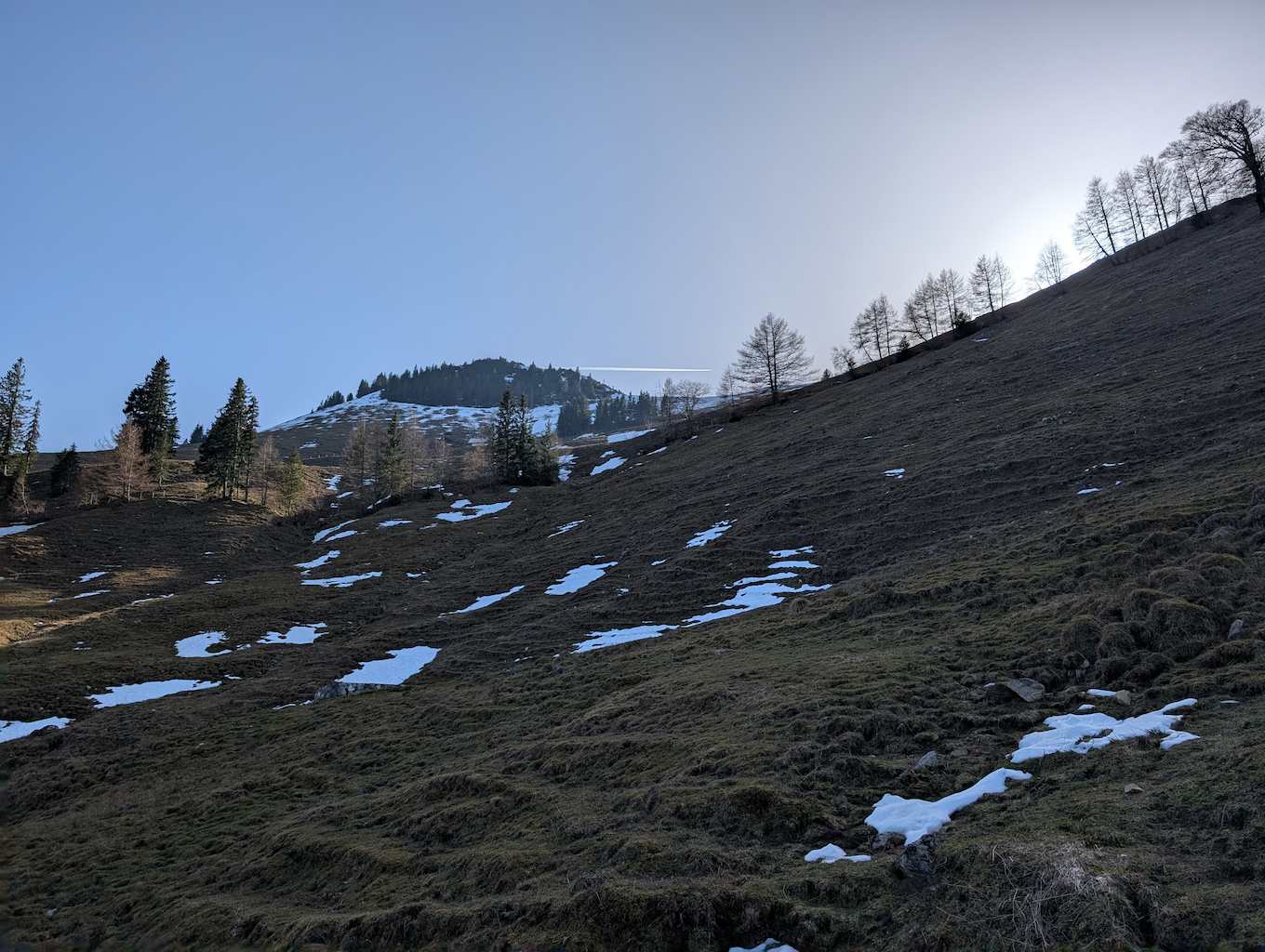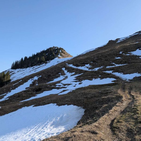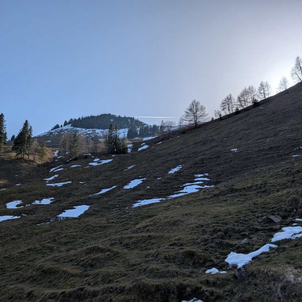 Wir folgen an der Schuhbräualm der Beschilderung und steigen über einen steilen Grashang zur bereits sichtbaren Rampoldalm auf. Im Rückblick kommt der Mitterberg zum Vorschein. Über einen weiteren Hang geht es auf einfachem Steig in Richtung Kamm, der Schnee hat sich Anfang März hier schon fast komplett zurückgezogen.