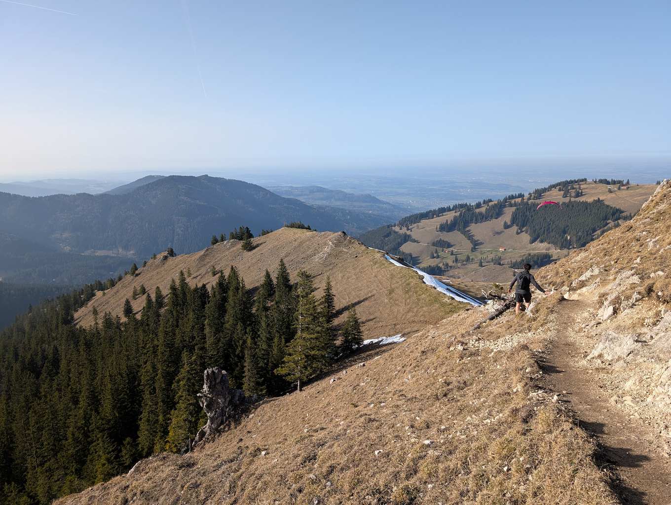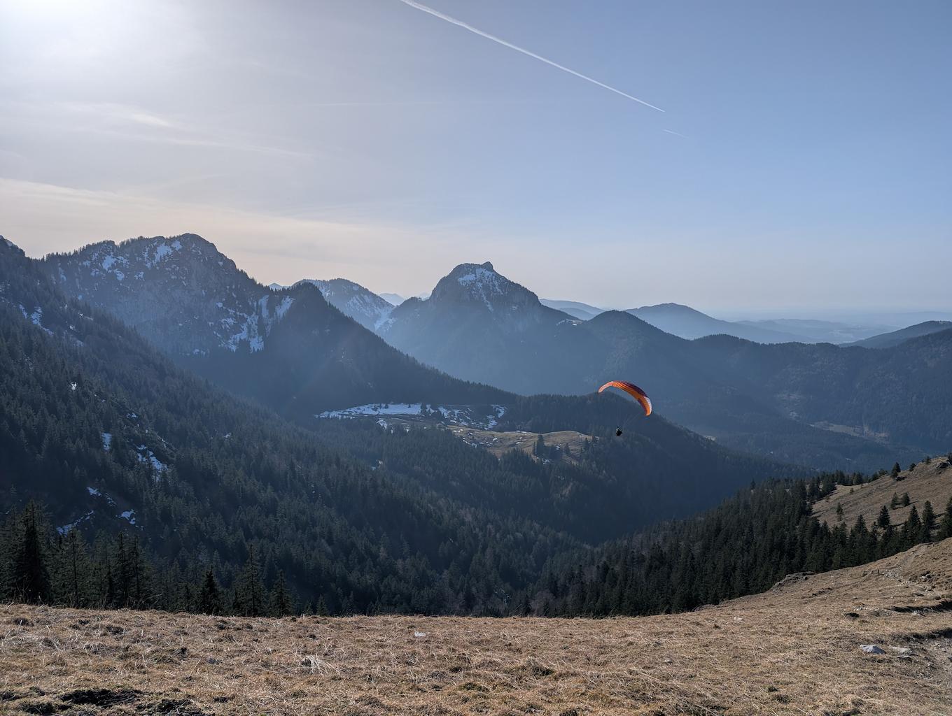 Schon bald kommt das Gipfelkreuz in Sicht. Unterhalb haben sich auf dem breiten Kamm einige Gleitschirmflieger zum Start aufgereiht. Kaum 30 Minuten sind es vom Bike-Depot bis zur Rampoldplatte (1.422 m), die bereits einen sehr schönen Blick Richtung Inntal und Wilder Kaiser bietet.