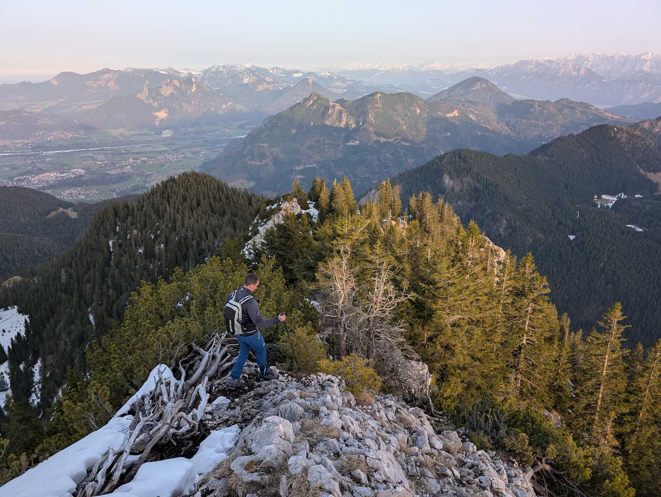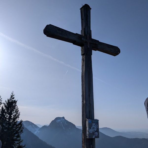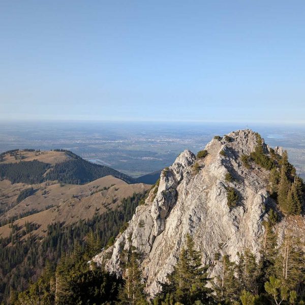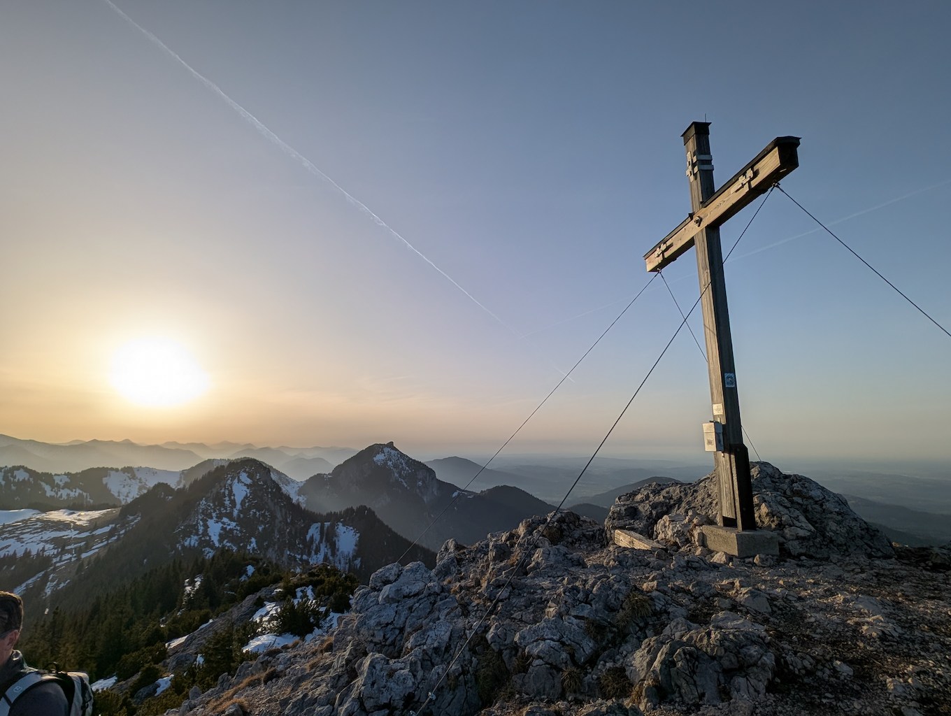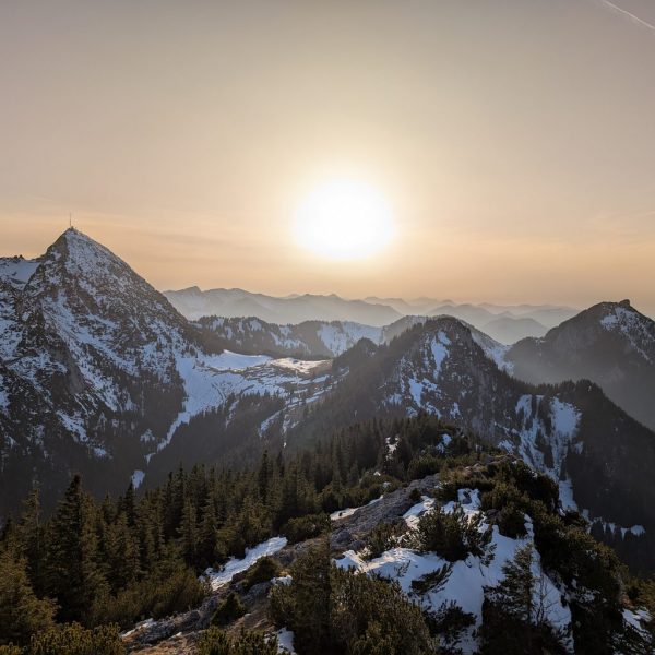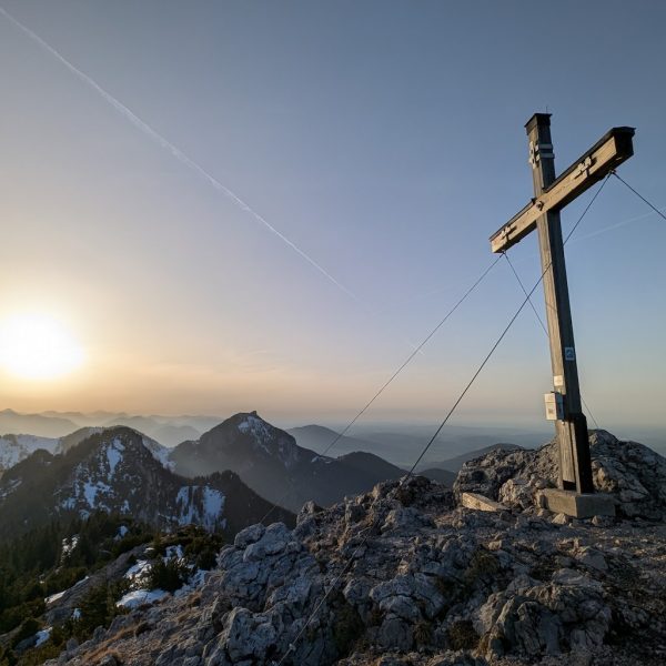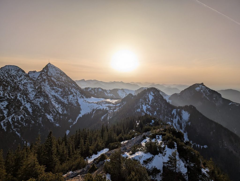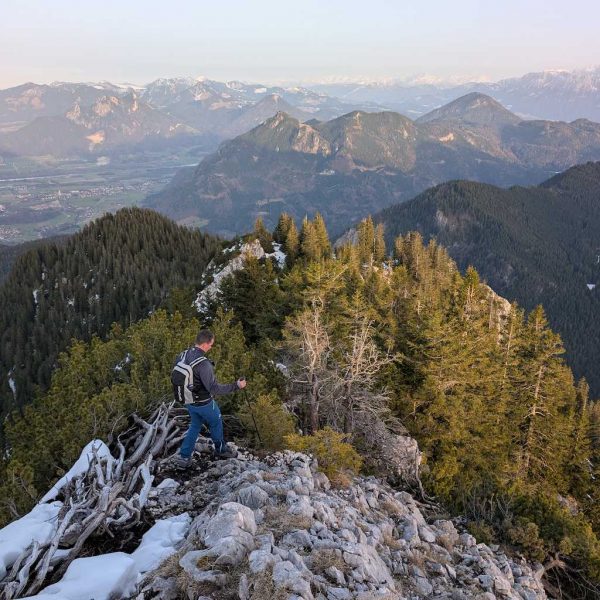 Schließlich ist es geschafft und die Hochsalwand (1.625 m) ist erreicht. Ein überragender Rundumblick bei untergehender Sonne vom Wendelstein bis weit in die Chiemgauer erwartet uns.