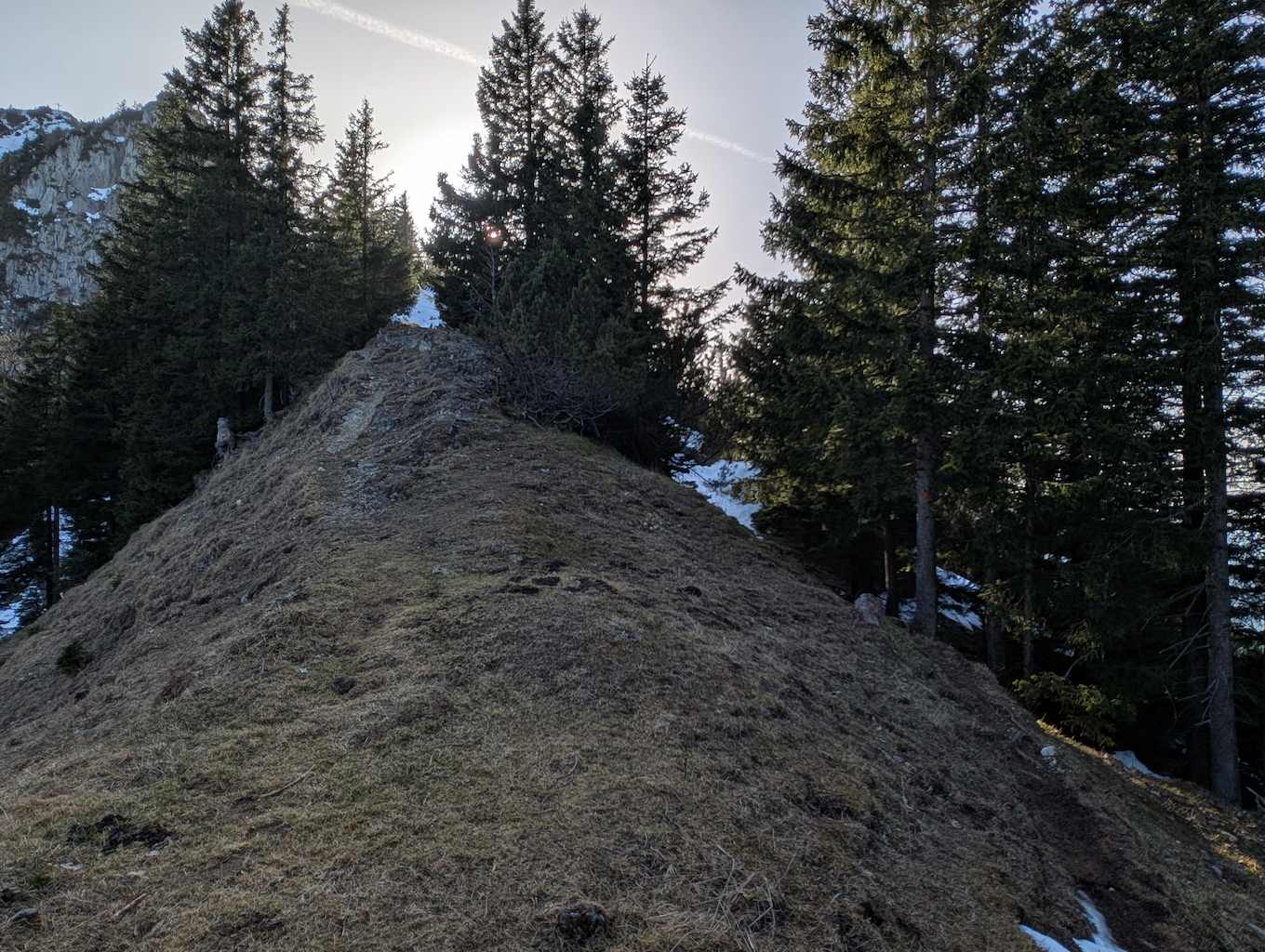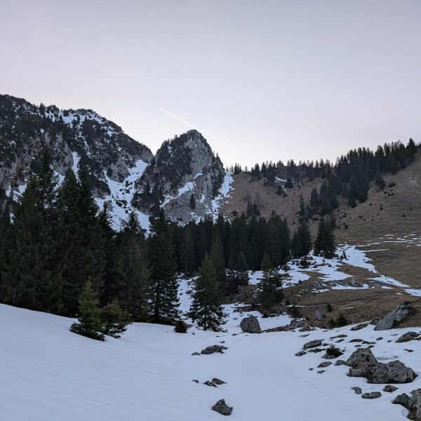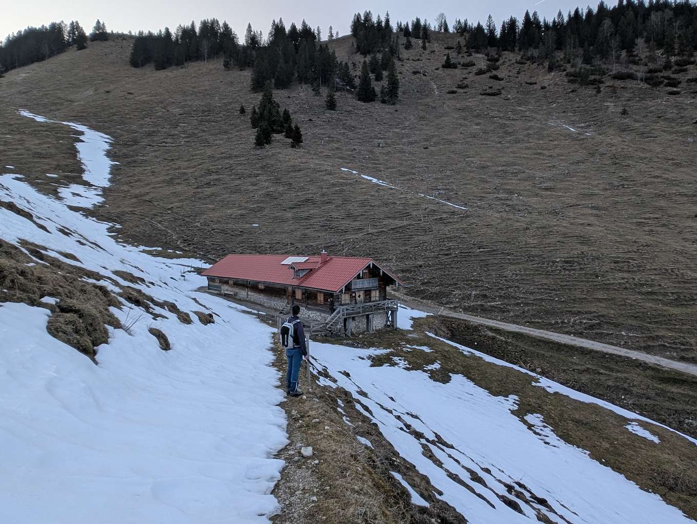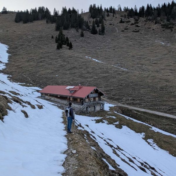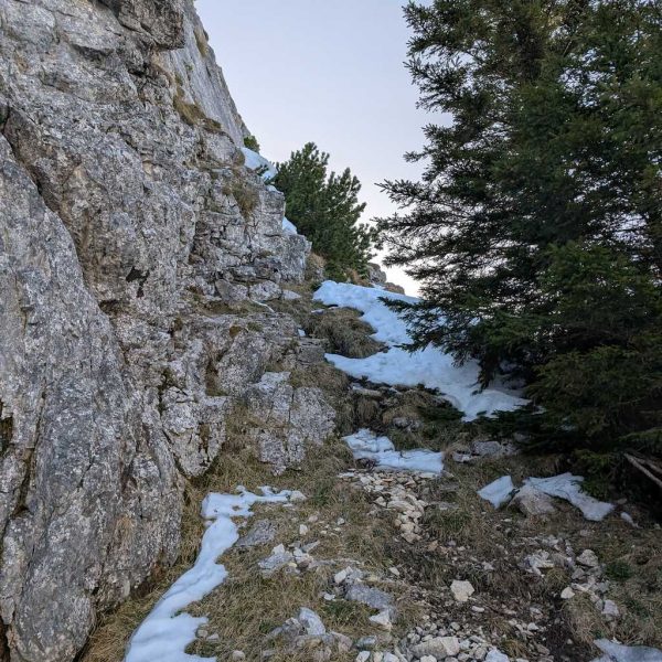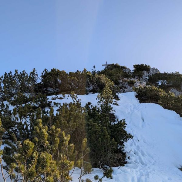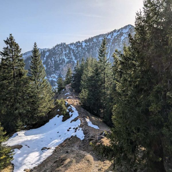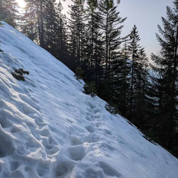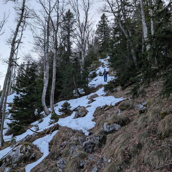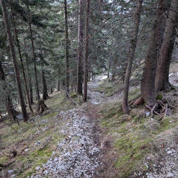 Auch für den Abstieg folgen wir einem weniger begangenen Weg, der allerdings – abgesehen vom Altschnee – keine größeren Schwierigkeiten bereithält. Vom Kreuz folgen wir dem bewaldeten Kamm nach Osten und umrunden somit den unterhalb liegenden Kessel, in dem sich die einsame Lechneralm befindet.