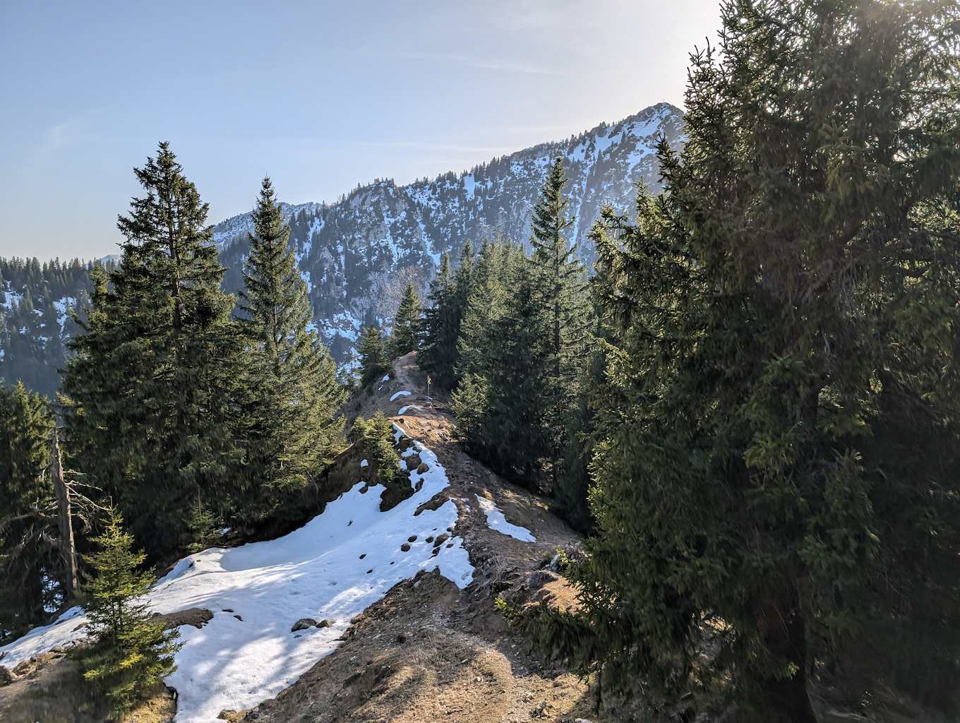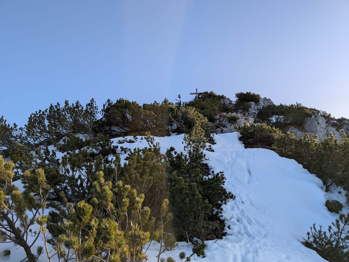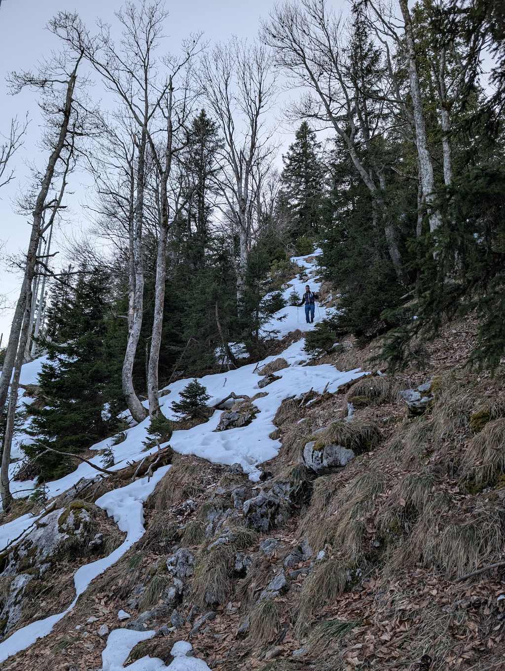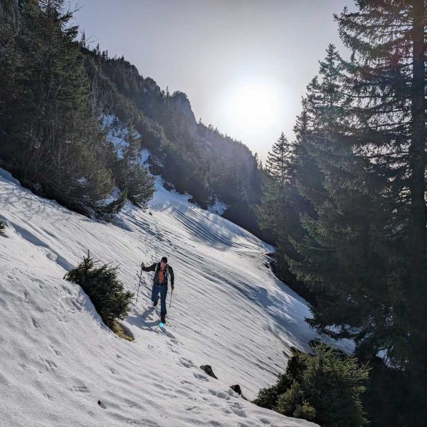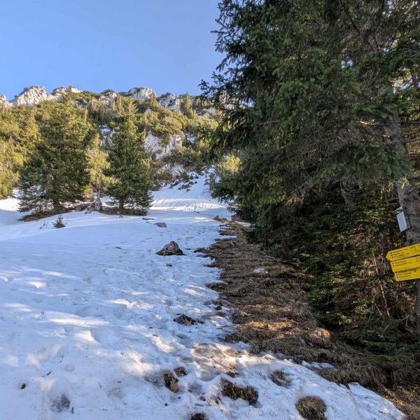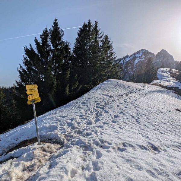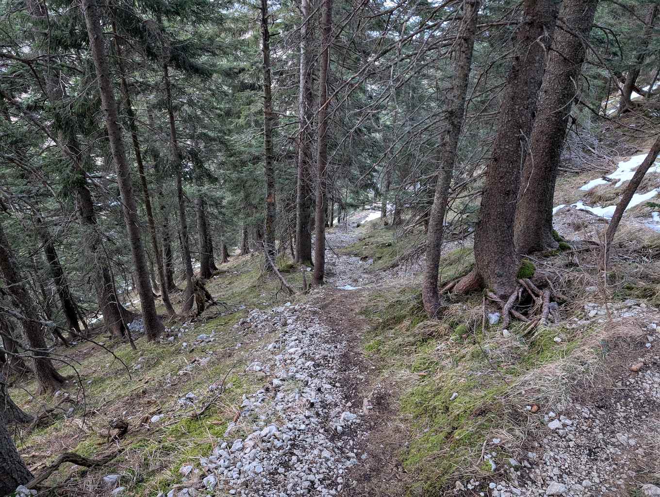 Auch für den Abstieg folgen wir einem weniger begangenen Weg, der allerdings – abgesehen vom Altschnee – keine größeren Schwierigkeiten bereithält. Vom Kreuz folgen wir dem bewaldeten Kamm nach Osten und umrunden somit den unterhalb liegenden Kessel, in dem sich die einsame Lechneralm befindet.
