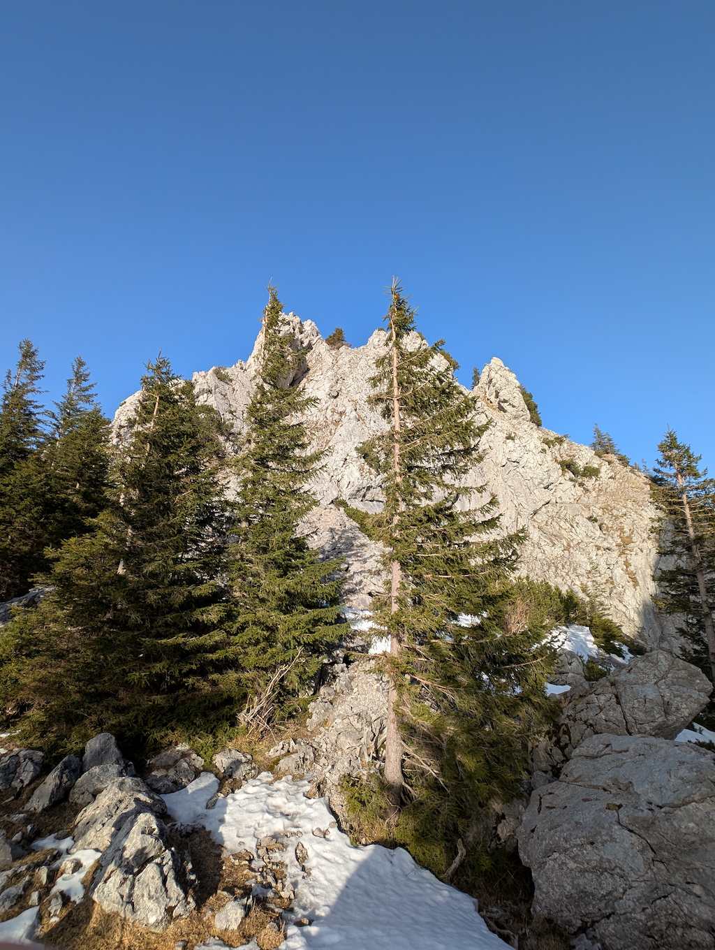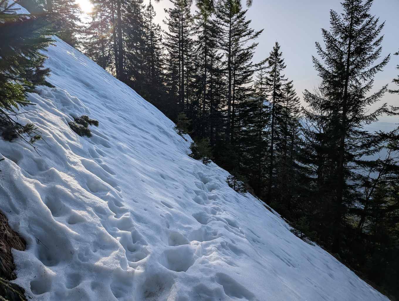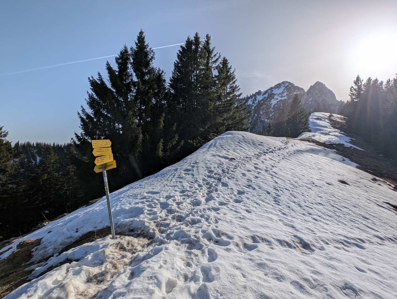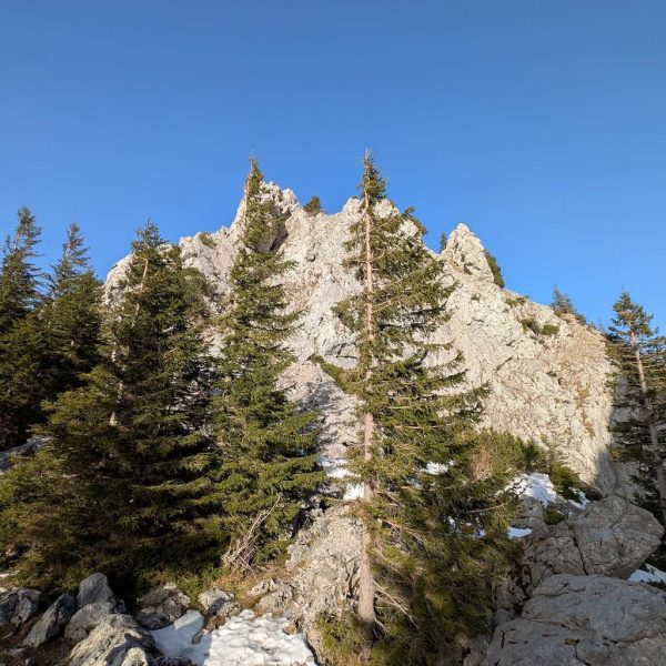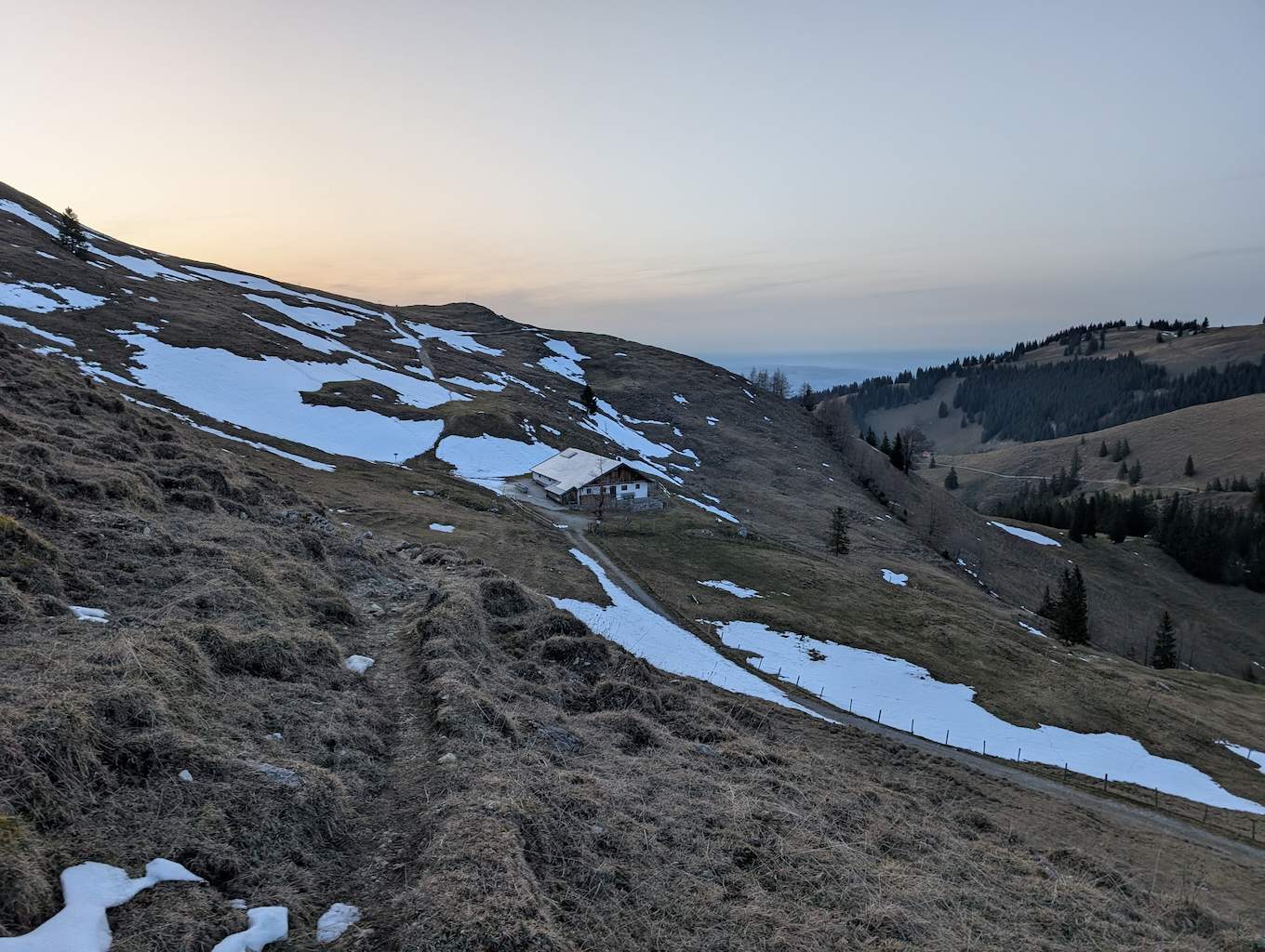 Auch für den Abstieg folgen wir einem weniger begangenen Weg, der allerdings – abgesehen vom Altschnee – keine größeren Schwierigkeiten bereithält. Vom Kreuz folgen wir dem bewaldeten Kamm nach Osten und umrunden somit den unterhalb liegenden Kessel, in dem sich die einsame Lechneralm befindet.