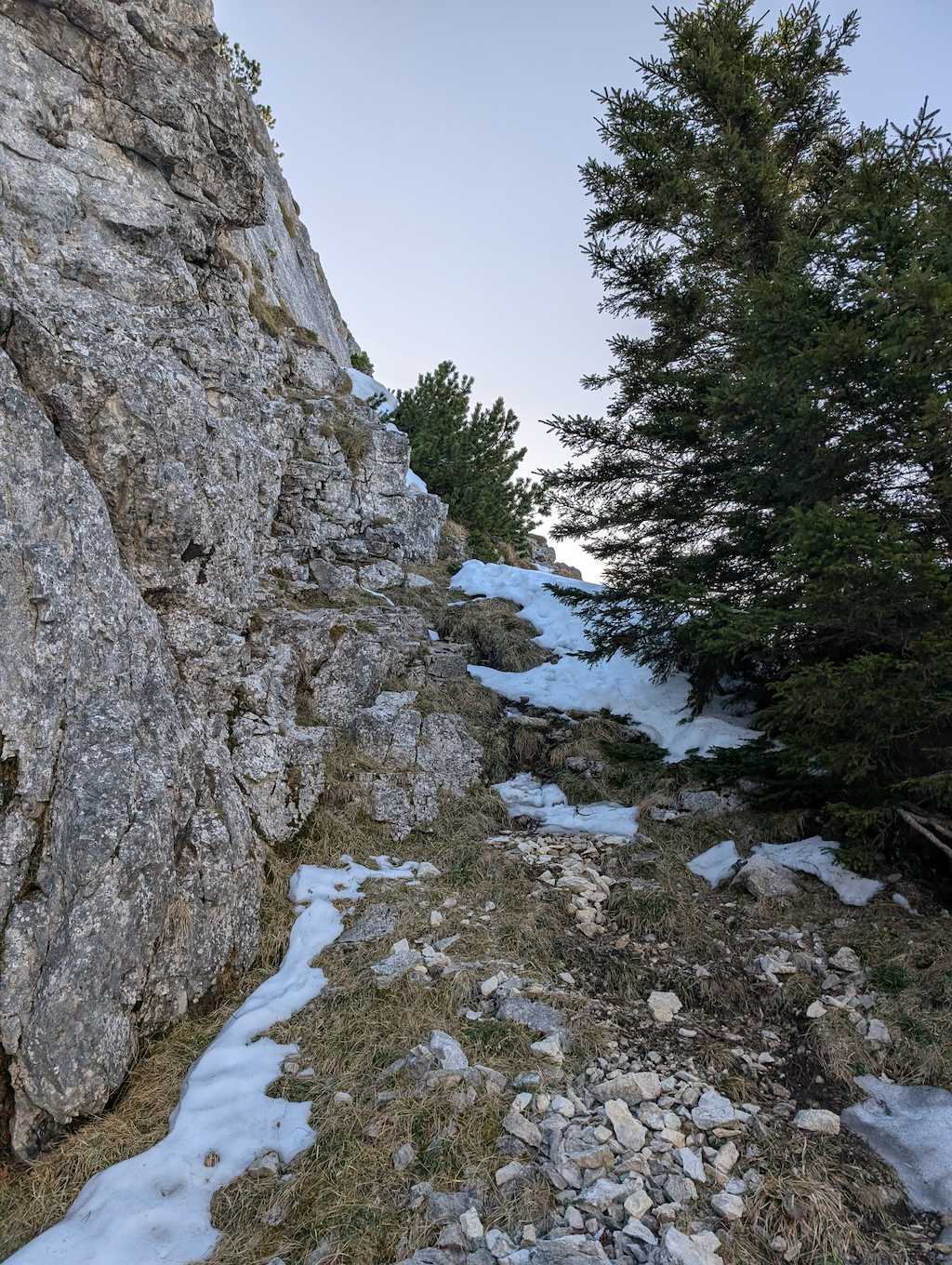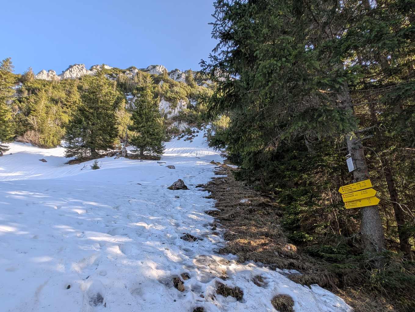 Wir queren nun unterhalb des Lechnerkopfes vorbei und treffen hier auch erstmalig auf nennenswerte Altschneefelder, hier ist im Frühjahr Vorsicht geboten. Durch den Schnee zieht der Weg nach links steil hinauf zu einer Beschilderung. Der markierte Normalweg zur Hochsalwand führt nach rechts, doch wir zweigen nach links ab und gelangen in die Scharte zwischen Lechnerkopf und Hochsalwand.