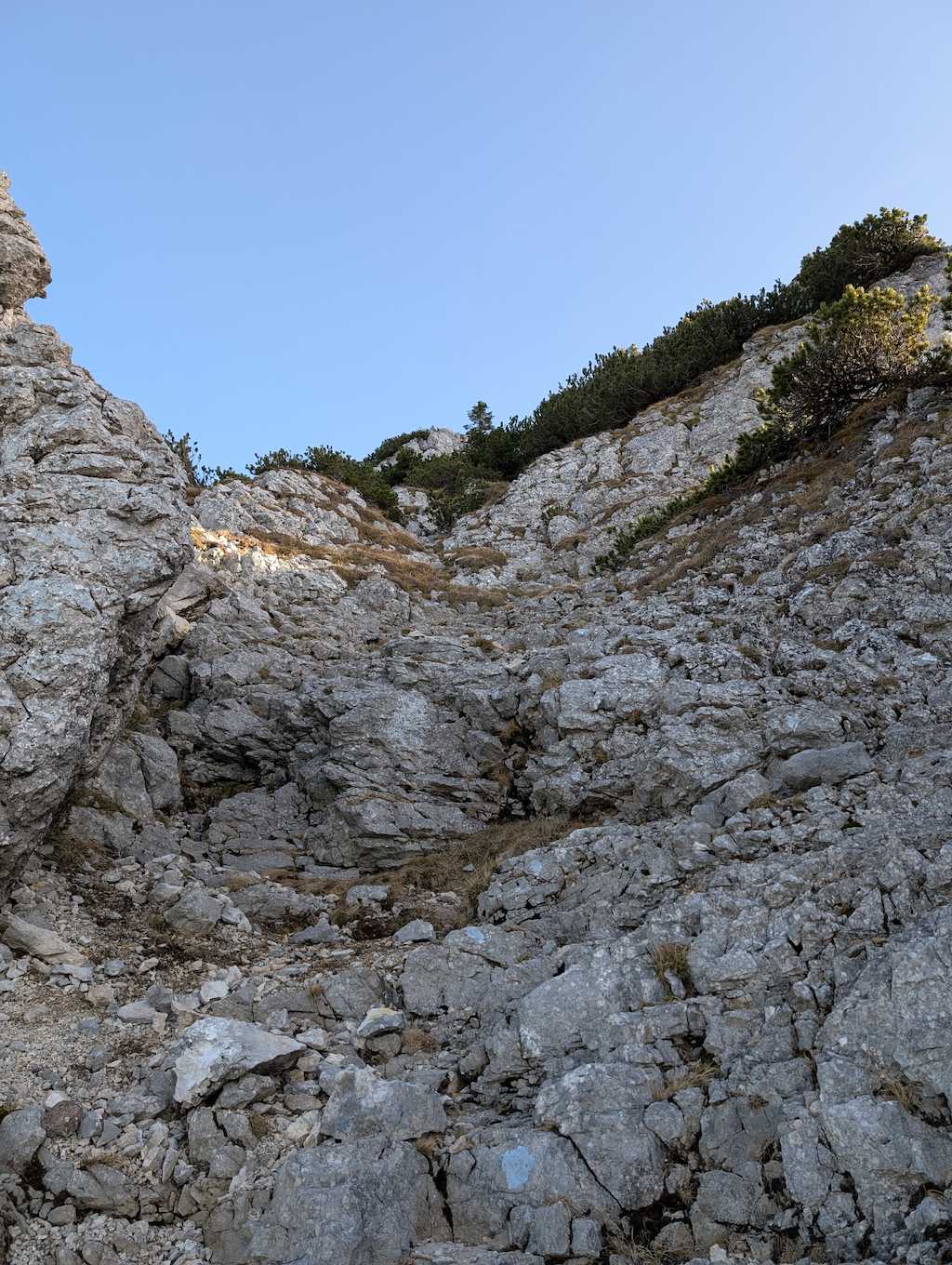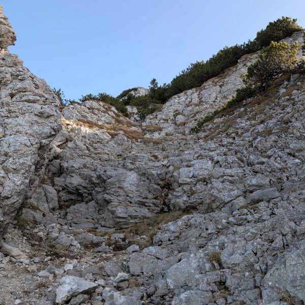 Aus der Scharte könnte man nun erst dem seltener begangenen Lechnerkopf nach links einen Besuch abstatten. Wir wenden uns nach rechts und suchen nach dem in den Karten verzeichneten Nordaufstieg. Und tatsächlich leiten die Spuren an der Wand zu einer Rampe. Es wird nun allerdings anspruchsvoller und leicht ausgesetzt (wer sich unwohl fühlt, sollte hier noch umdrehen und Normalweg zurück queren).