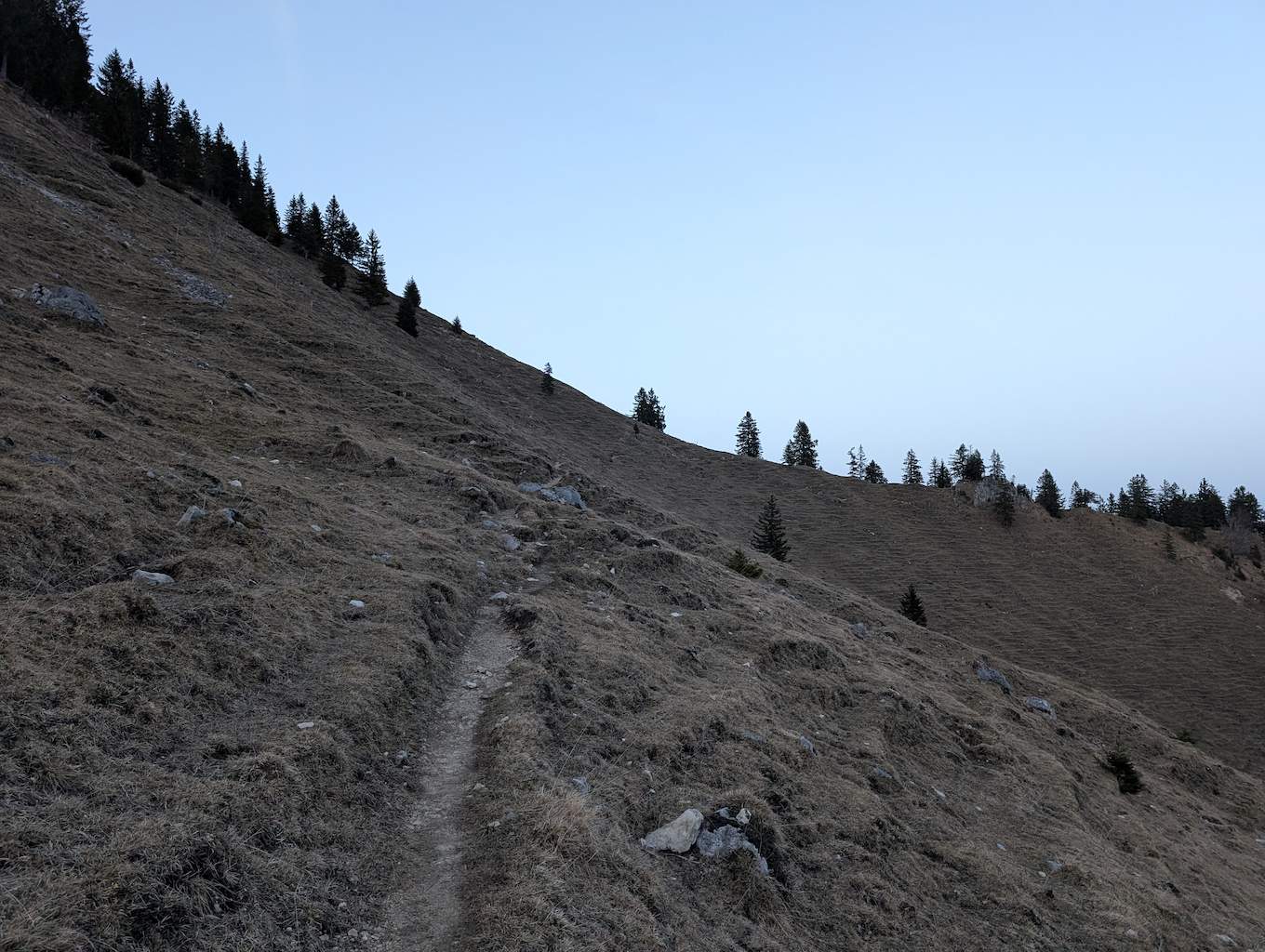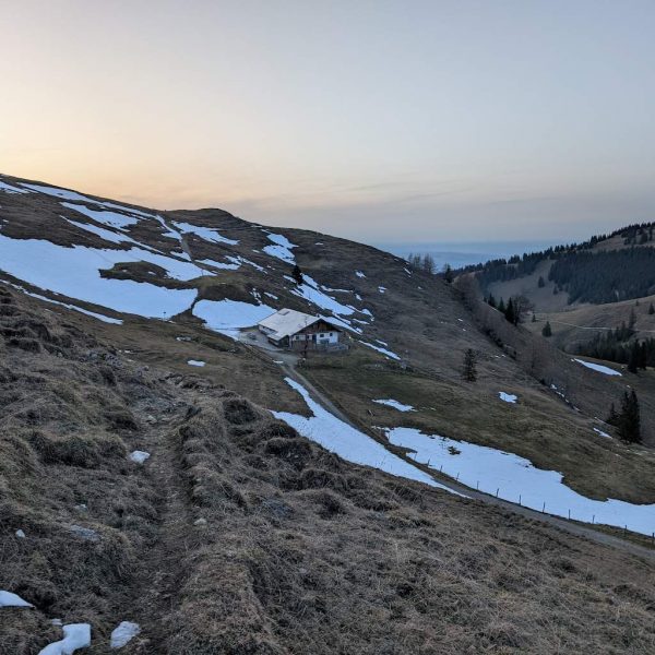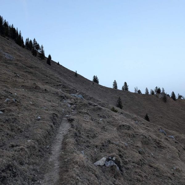 Ein paar Erhebungen und eine steilere Abstiegsstelle hält der Kamm bereit, ansonsten geht es in moderatem Wandergelände konstant durch den Wald hinab. Wir biegen schließlich nach links in Richtung Kessel ab und kommen bei schon einbrechender Dunkelheit direkt vor der Lechneralm heraus.