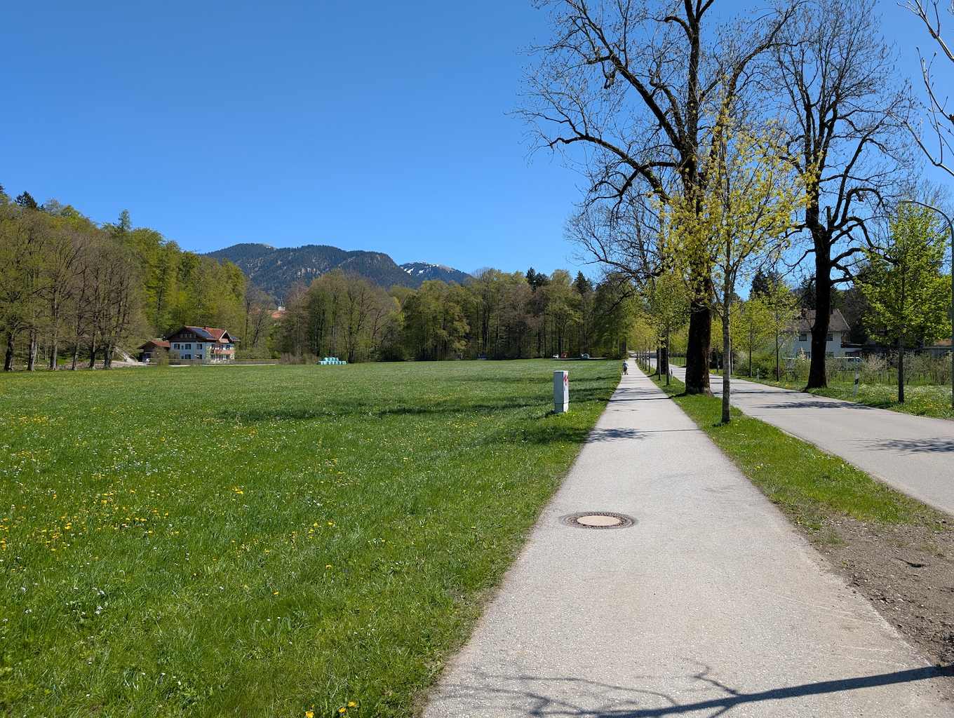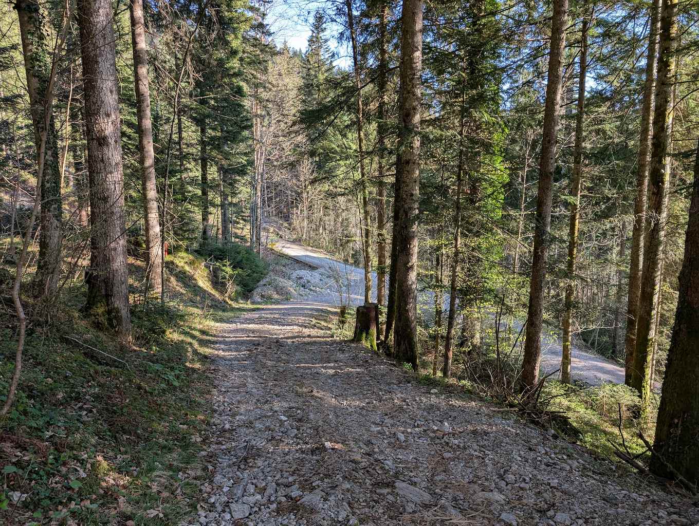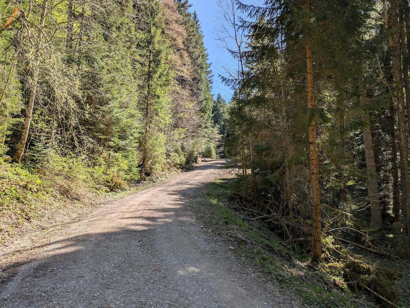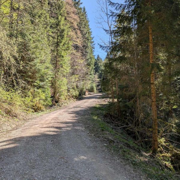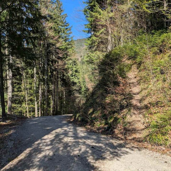 Die Straße führt nun geteert an etlichen Häusern und Höfen – und den ersten Abzweigungen Richtung Grasleitenstein und Lenggrieser Hütte – vorbei nach Südosten. Auch der Schönberg kommt bald in Sicht. Schließlich taucht man in den Wald ein, wo es erstmalig auch steiler wird. An einer Abzweigung nach Fleck hält man sich nochmal links und erreicht bei einer Beschilderung nach links („Lenggrieser Hütte“) nach insgesamt 6,5 Km das Bike-Depot.
