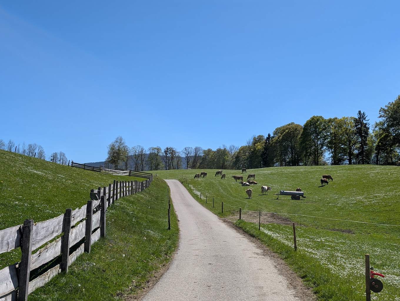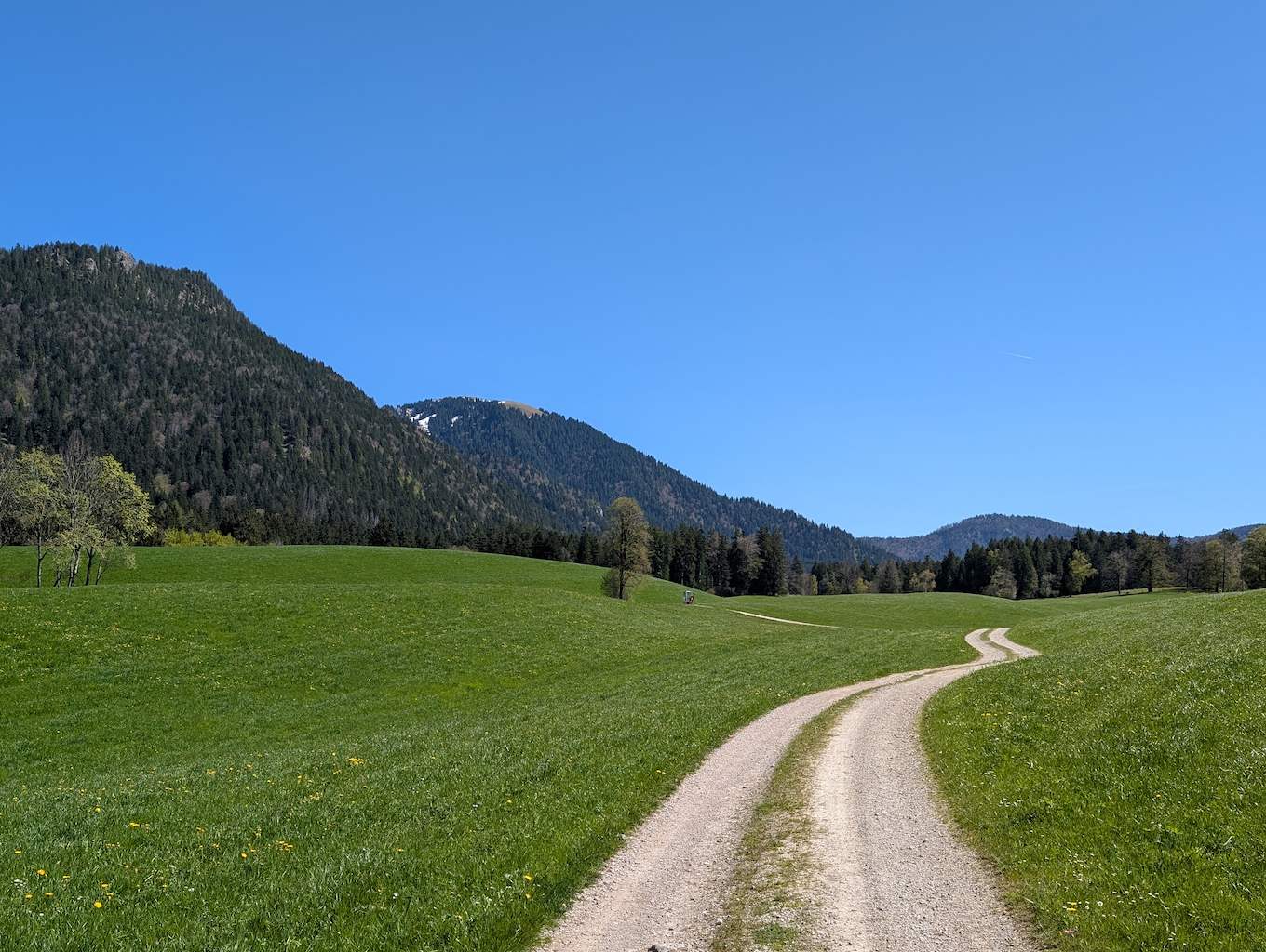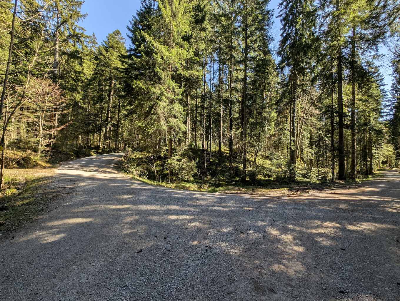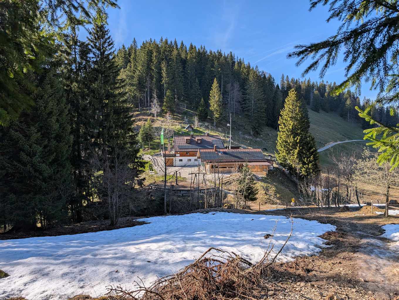 Die Straße führt nun geteert an etlichen Häusern und Höfen – und den ersten Abzweigungen Richtung Grasleitenstein und Lenggrieser Hütte – vorbei nach Südosten. Auch der Schönberg kommt bald in Sicht. Schließlich taucht man in den Wald ein, wo es erstmalig auch steiler wird. An einer Abzweigung nach Fleck hält man sich nochmal links und erreicht bei einer Beschilderung nach links („Lenggrieser Hütte“) nach insgesamt 6,5 Km das Bike-Depot.