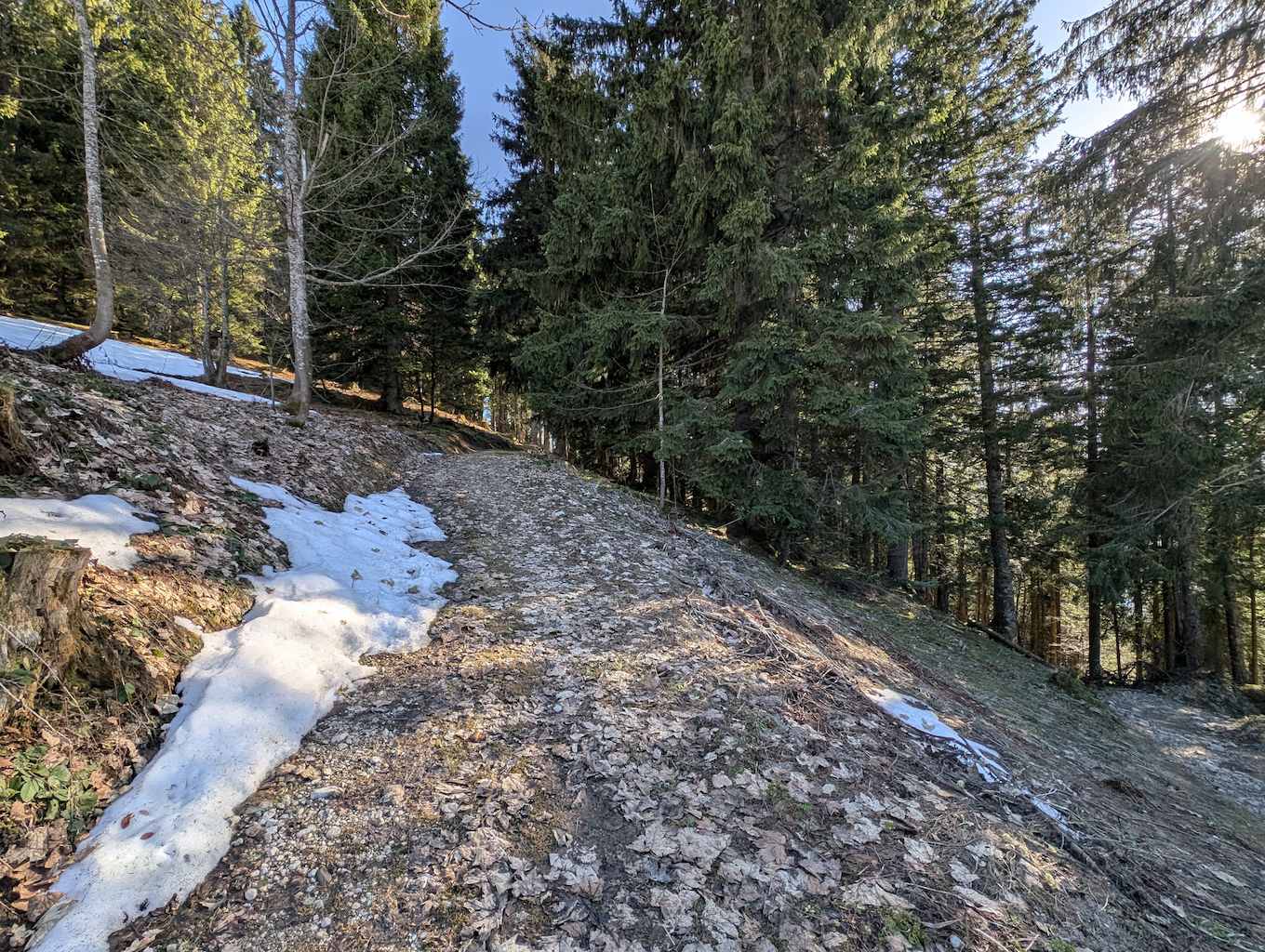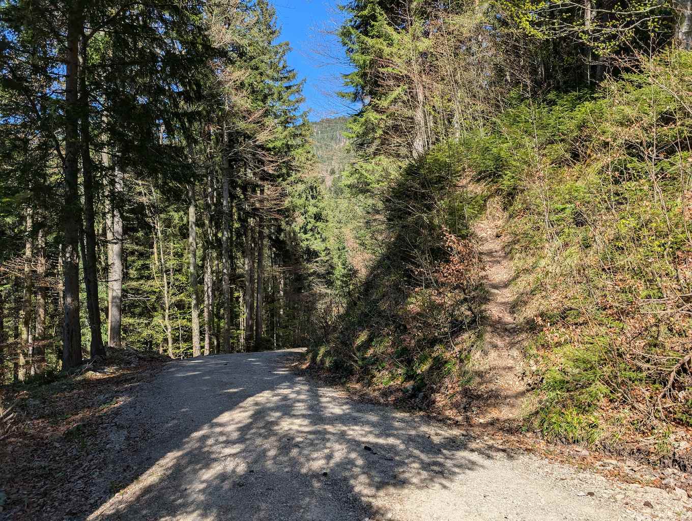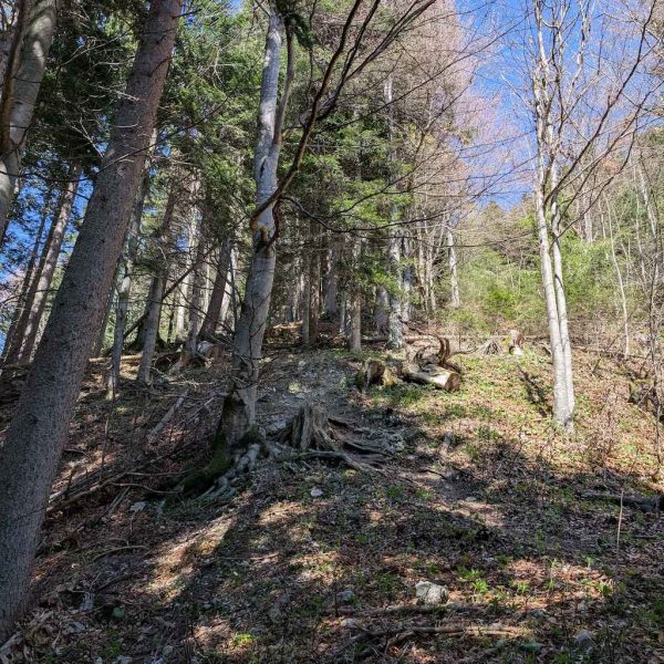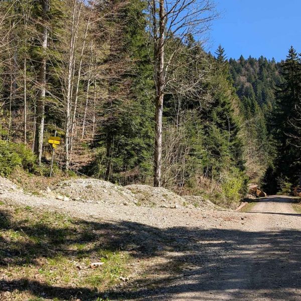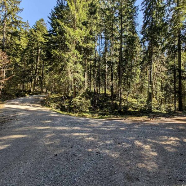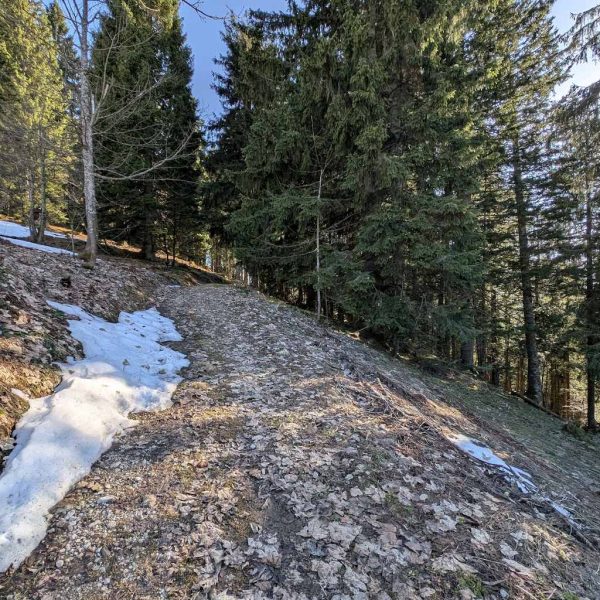 Nachdem das Bike an der Beschilderung (dem späteren Abstiegsweg) geparkt ist, heißt es dem steilen Forstweg noch ca. 10 Minuten weiter zu folgen. In einer Linkskurve heißt es aufpassen. Scharf nach links – gut sichtbar, aber nicht markiert oder beschildert – zweigt ein erdiger Pfad in den Wald ab.
