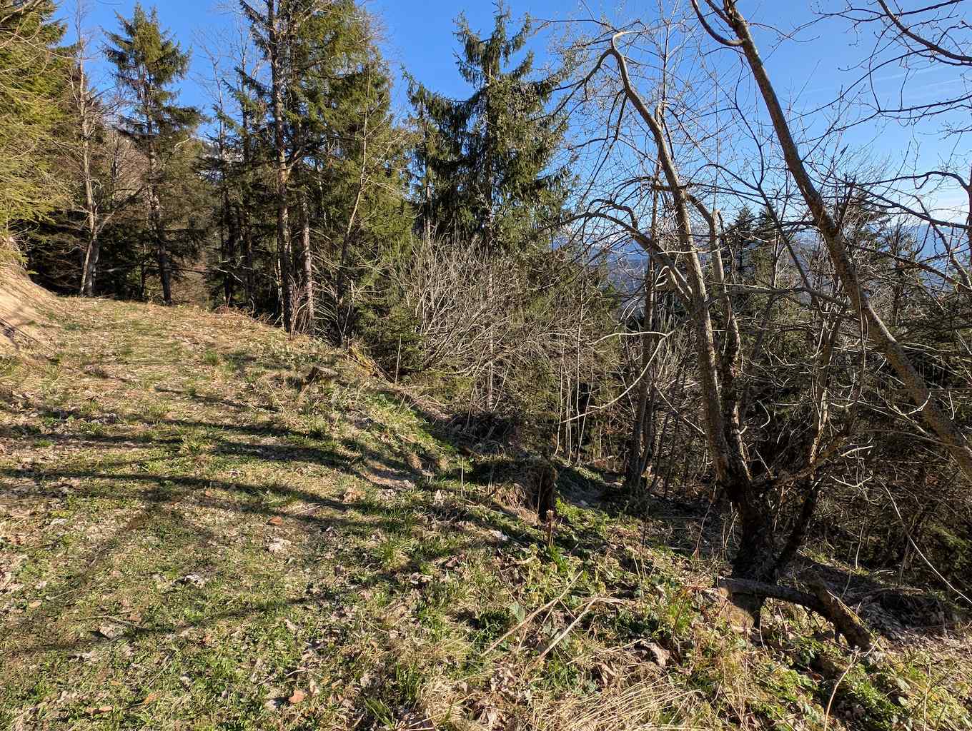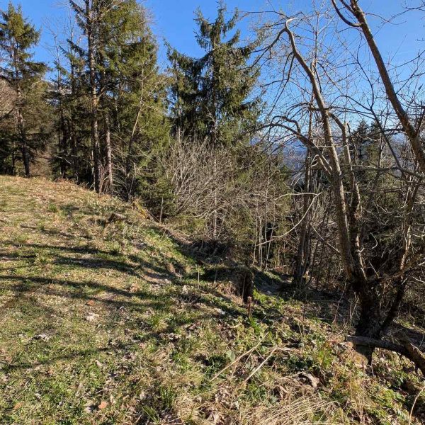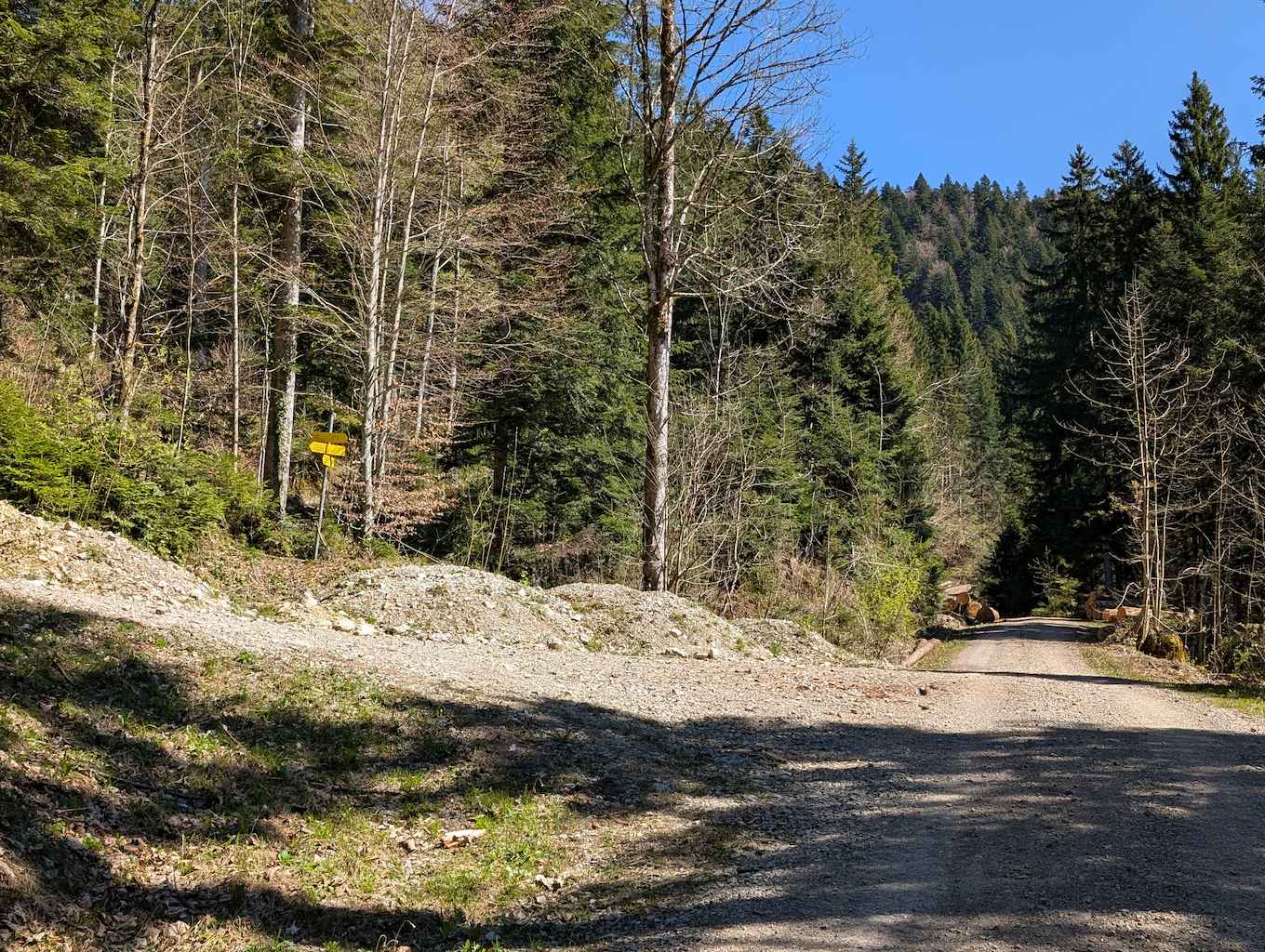 Nachdem das Bike an der Beschilderung (dem späteren Abstiegsweg) geparkt ist, heißt es dem steilen Forstweg noch ca. 10 Minuten weiter zu folgen. In einer Linkskurve heißt es aufpassen. Scharf nach links – gut sichtbar, aber nicht markiert oder beschildert – zweigt ein erdiger Pfad in den Wald ab.