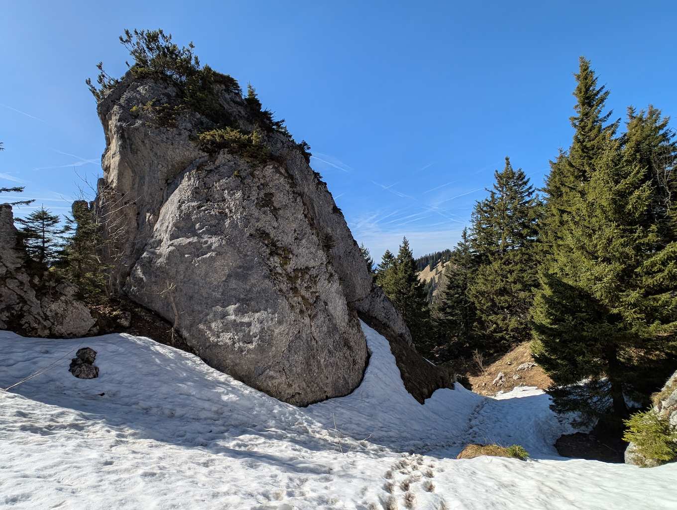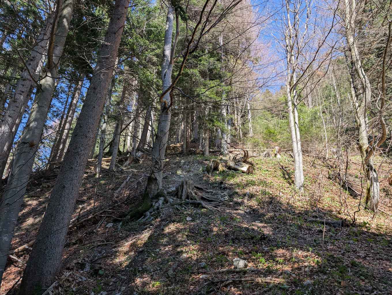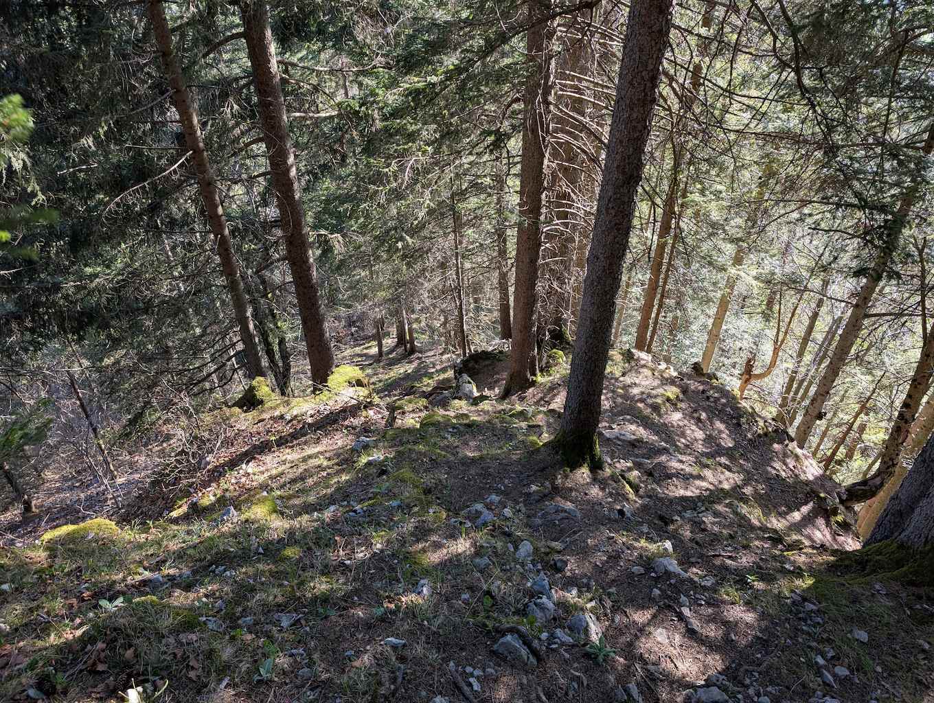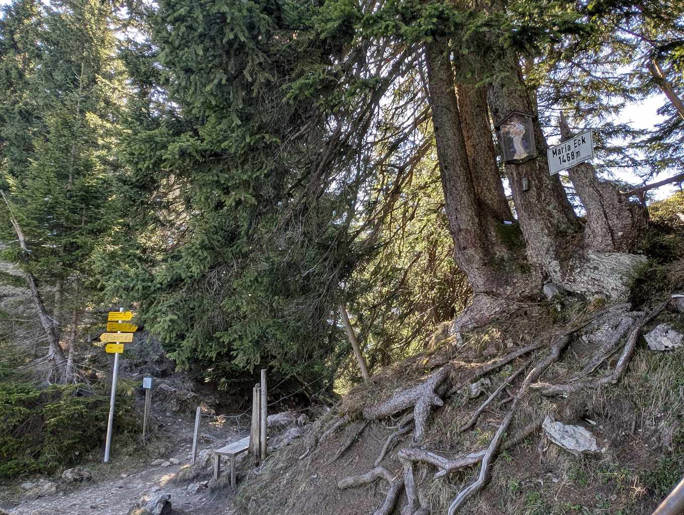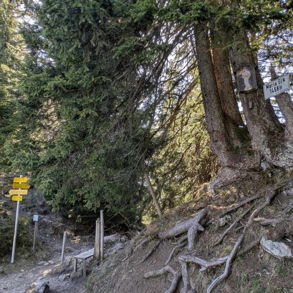 Vom Schönberg geht es erstmal wieder auf offiziellen, aber nicht überlaufenen, Wegen weiter. Zunächst folgt ein gutmütiger Abstieg nach Norden zum Maria Eck (1.468 m), von dem auch Steige nach Fleck oder Richtung Roß- und Buchstein abzweigen.