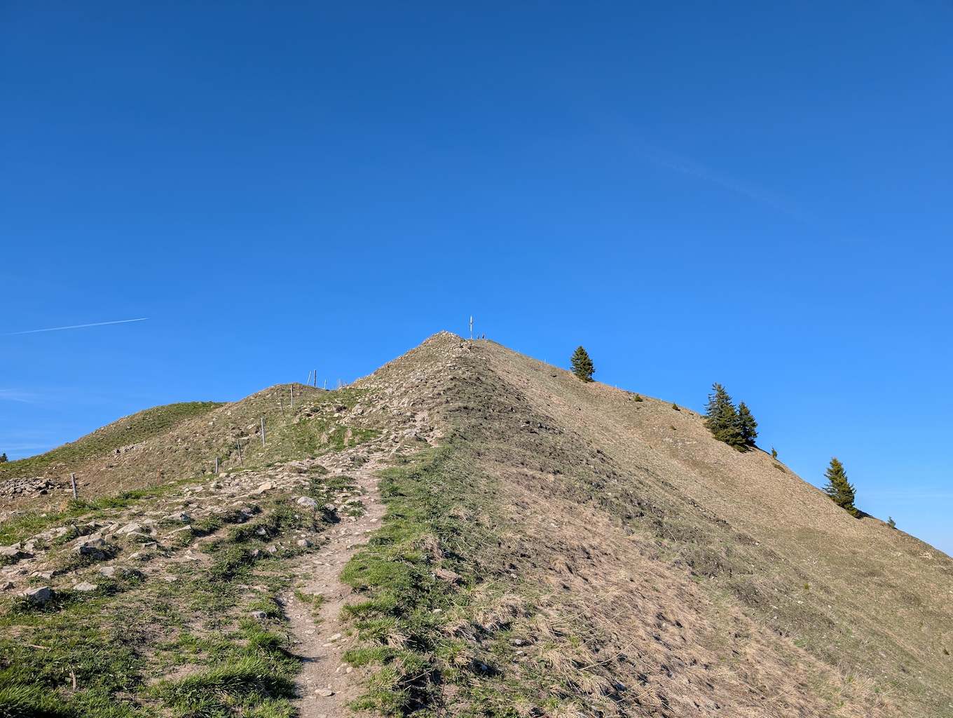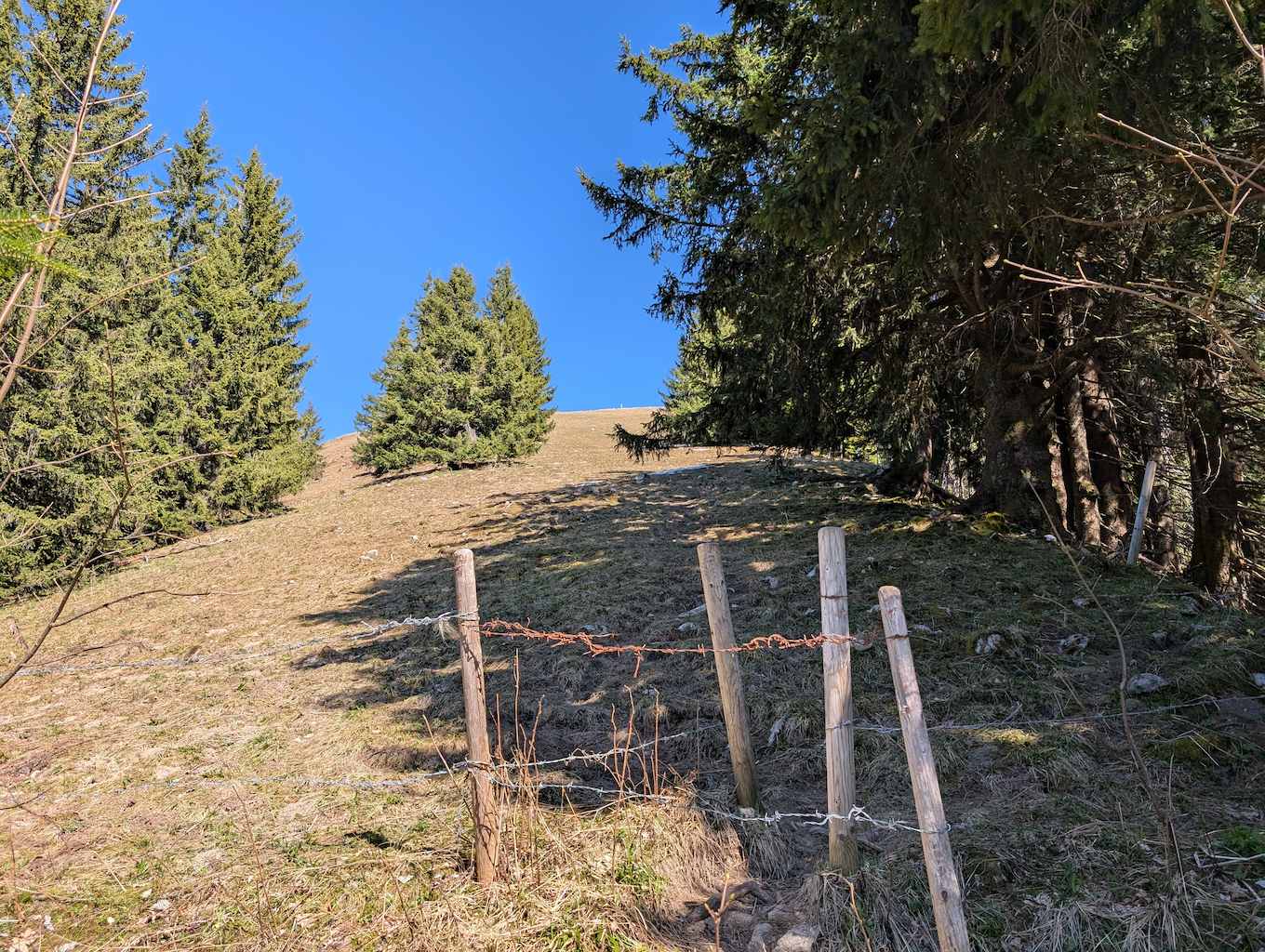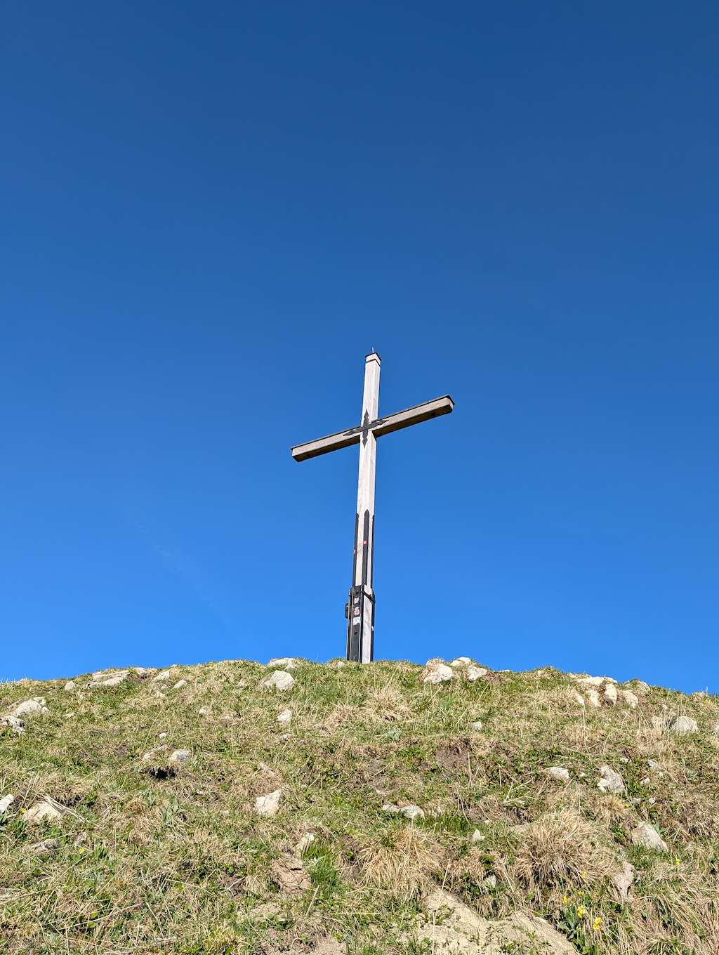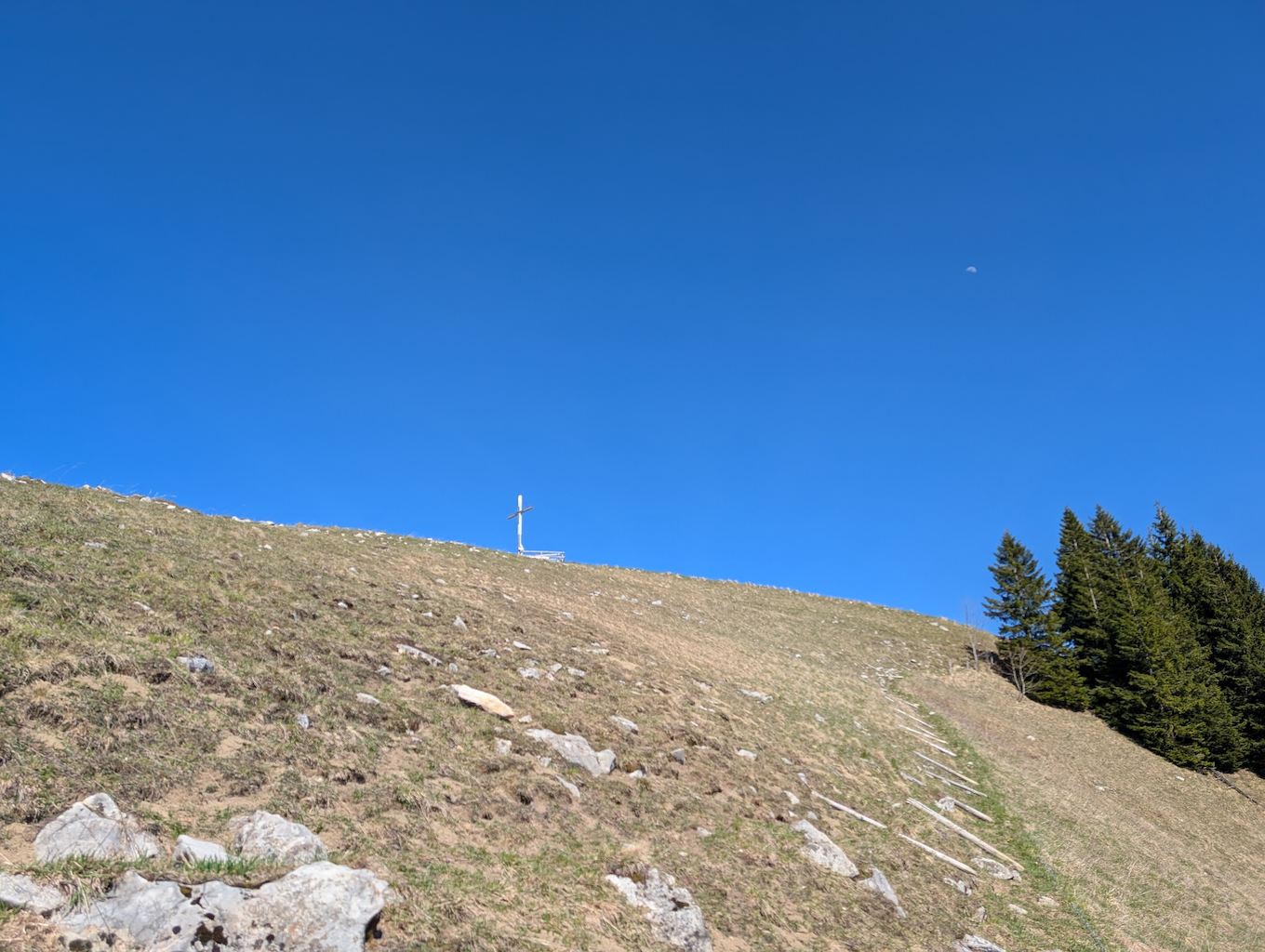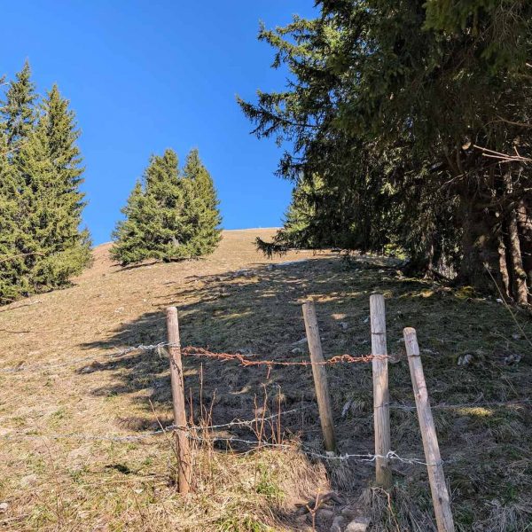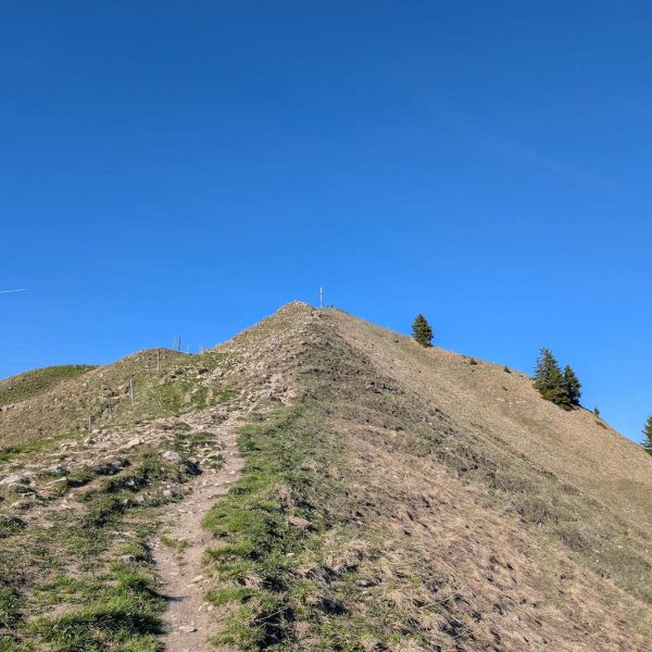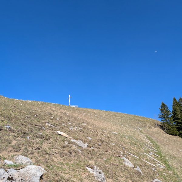 Es folgt nun ein durchgehend sehr steiler und wurzeliger Waldanstieg, der fast 600 Höhenmeter gnadenlos anzieht. Aussicht und Abwechslung gibt es wenig, aber man gewinnt schnell viele Höhenmeter. Erst relativ kurz unter dem Gipfel erreicht man freies Grasgelände und kann das Kreuz oberhalb schon sehen. Nach letztem steilen Anstieg schließlich ist der Schönberg (1.620 m) erreicht.