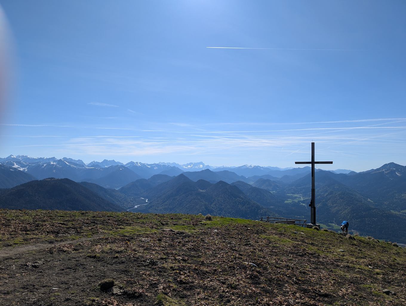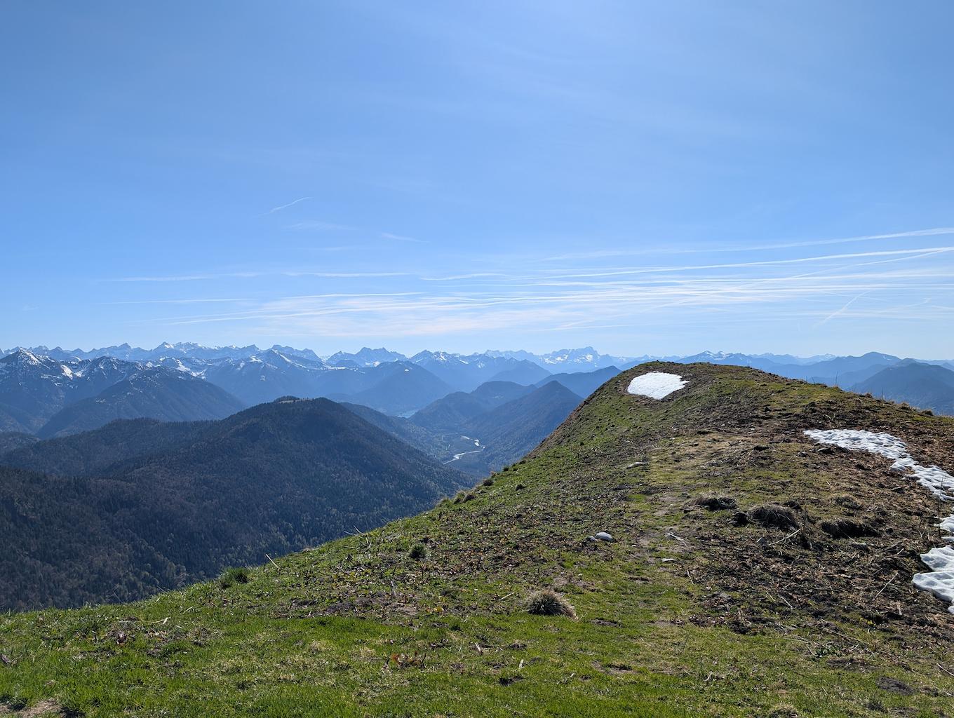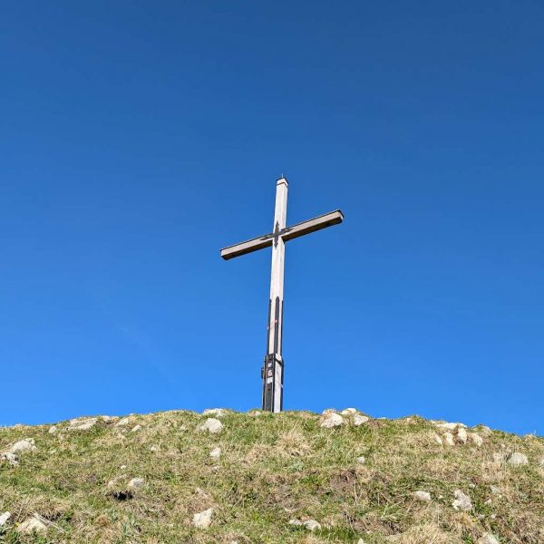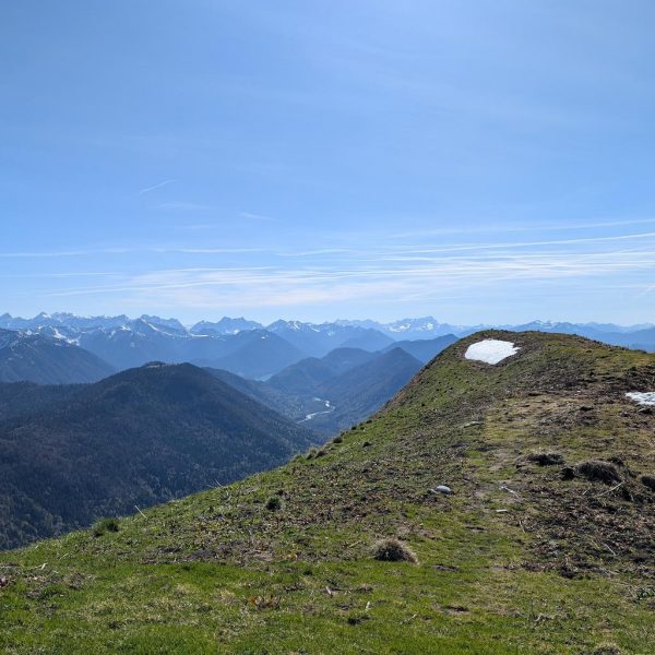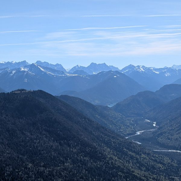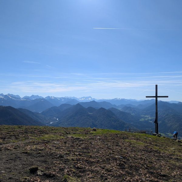 Der anstrengende Aufstieg hat sich gelohnt, denn man wird direkt und unvermittelt von einer fantastischen Aussicht empfangen, die das gesamte Karwendel und noch darüber hinaus umfasst. Für die Gipfelpause empfiehlt es sich, vom Kreuz noch ein Stück weiter bis zum höchsten Punkt des Schönbergs aufzusteigen!