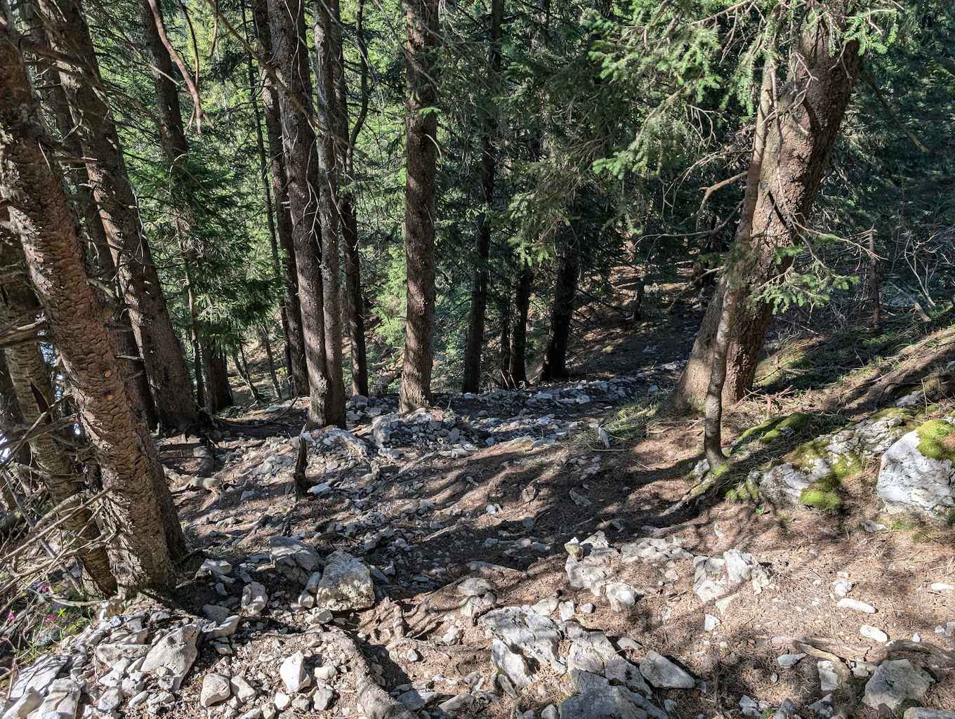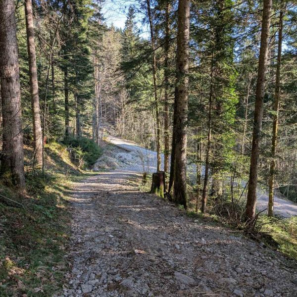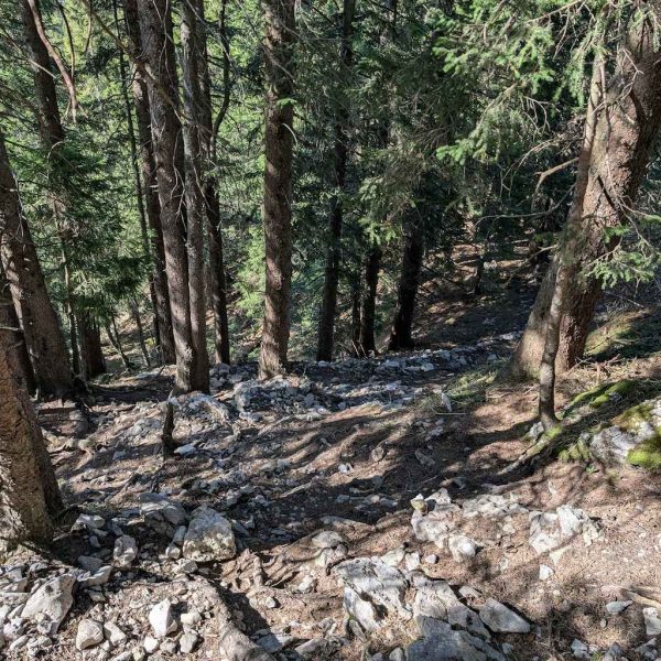Passend zum Aufstieg auf den Schönberg geht es auch auf dem Abstieg wieder sehr steil durch den Wald. In kurzer Zeit ist der Hauptteil der Höhenmeter geschafft und der Steig mündet in einen groben Karrenweg. Der grobsteinige und steile Weg verläuft etwas unangenehm über einige Kehren bergab, bis schließlich das Bike-Depot in Sicht kommt. Dank flacher und meist geteerter Straße folgt eine rasante Abfahrt nach Lenggries!