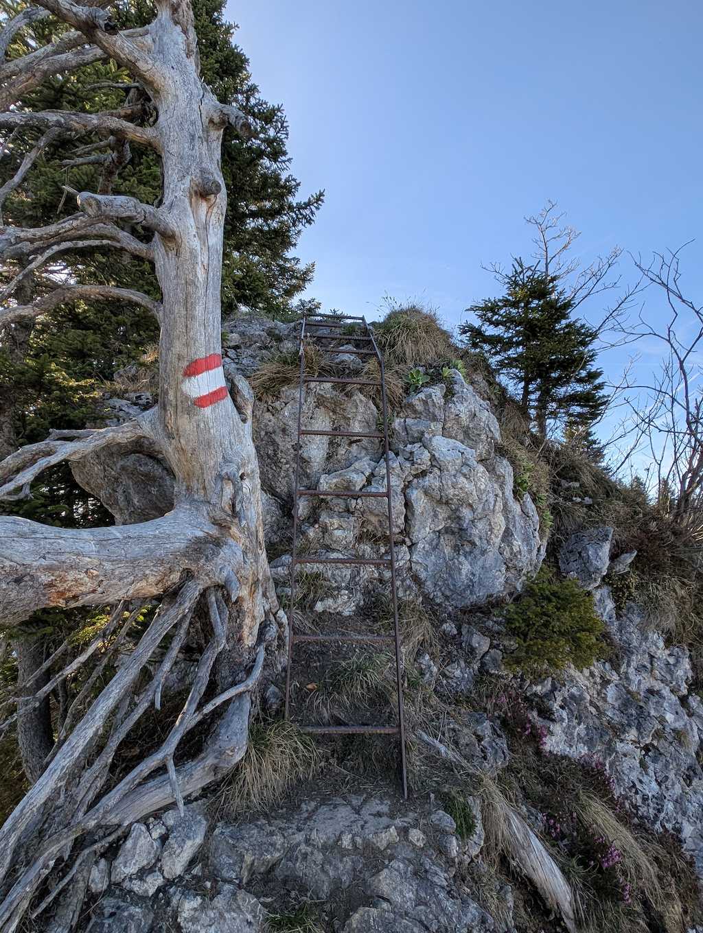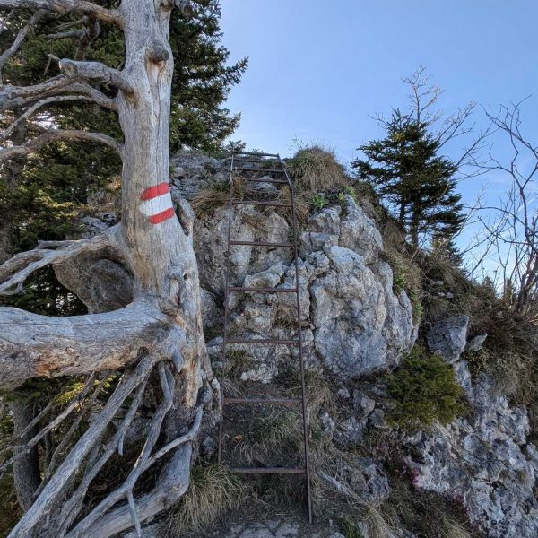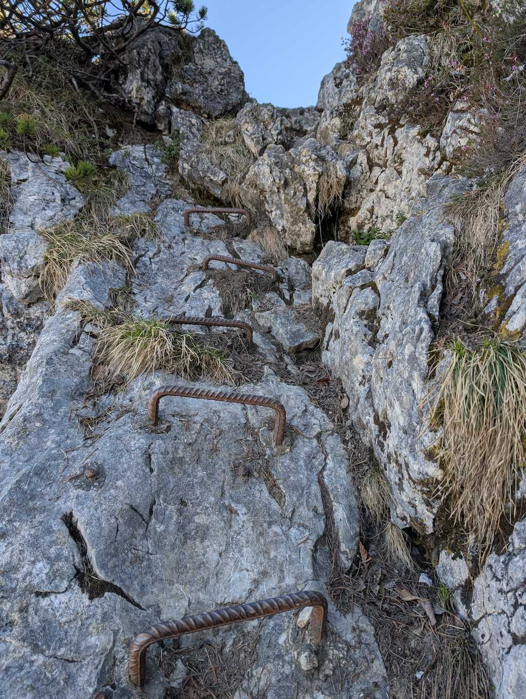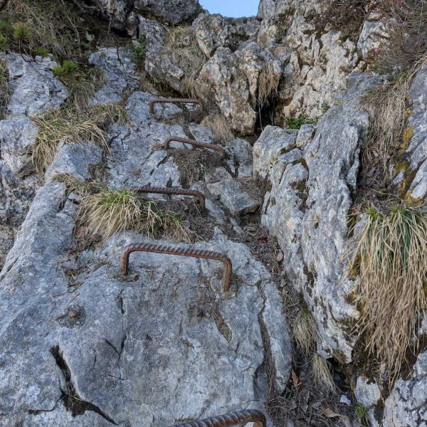 Geradeaus geht es weiter zum Seekarkreuz. Wie es auch schon die Schilder andeuten, wird es nun ein bisschen anspruchsvoller, wobei die Anforderungen höchstens bis T3 gehen. Nur trocken sollte es schon sein. Nach einfachem Beginn gelangt man an einige Felsen. Diese werden über ganz leichte Kraxelei erstiegen. An zwei Stellen wurden zur Sicherheit Klammern verbaut.