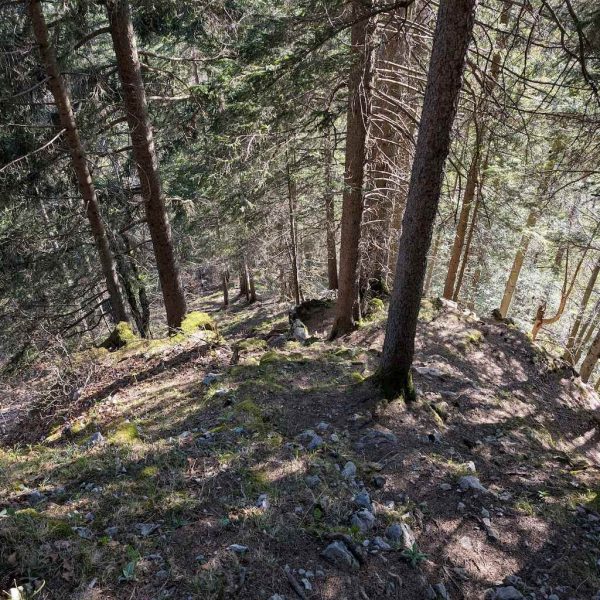 Auf beschildertem Weg folgt der Abstieg zur Lenggrieser Hütte (1.338 m), auf der man besonders schön am späten Nachmittag bei untergehender Sonne einkehren kann. An der Beschilderung zum Grasleitensteig heißt es nun aufpassen. Links/oberhalb knickt ein zweiter Weg ab. Dieser führt flach aus dem Wald und muss bereits nach der ersten Linkskurve wieder nach rechts über einen schwer zu sehenden Steig verlassen werden (GPS/Karte dringend empfohlen!)
